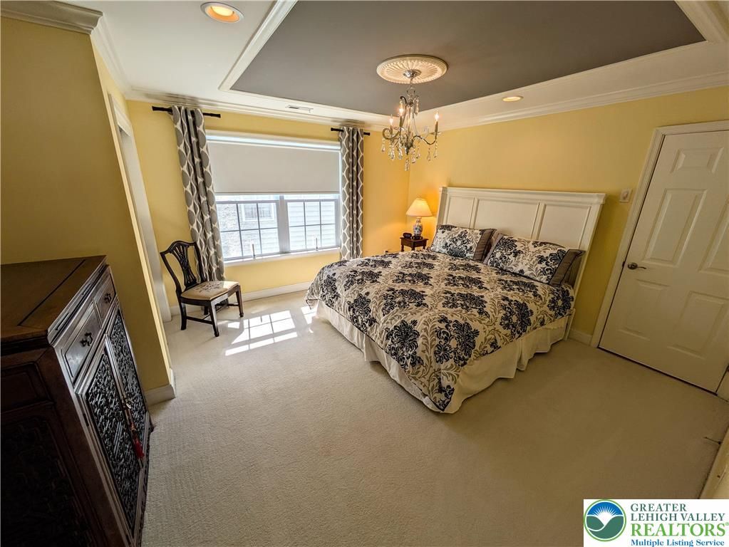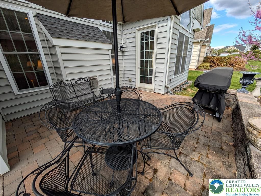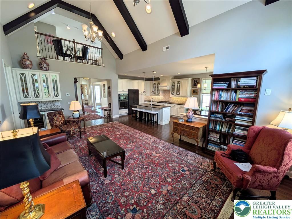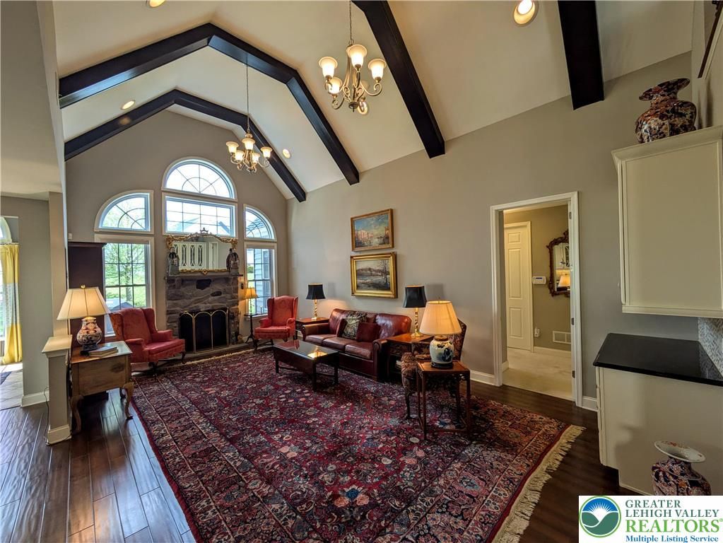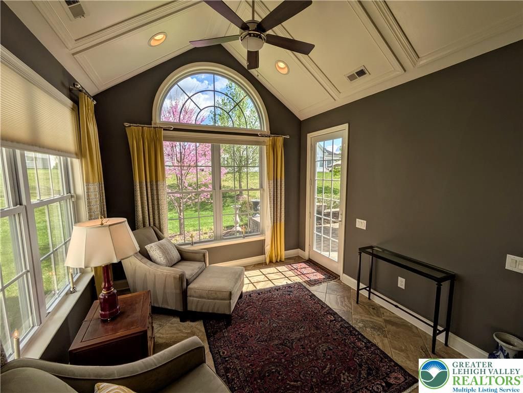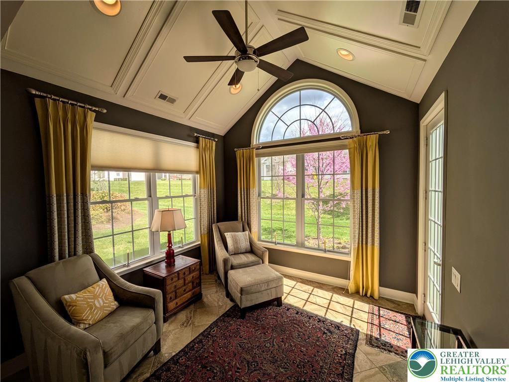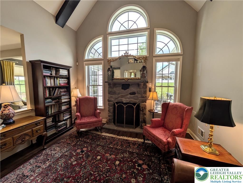 Welcome to an active 55+ community at Traditions of America. Understated elegance featuring streaming light and spacious rooms with tasteful upgrades. This former model home was built with warmth and character plus loads of premium features. The covered porch has heated flooring to melt the winter snow and ice away. Enter through the 8 foot front door and experience the open flow of the home. The family room is the central piece of this home with 17' ceilings with exposed wood beams, gas fireplace, butler's pantry with a wine refrigerator and built-in surround sound speakers. The kitchen has a custom tiled backsplash, large center island, sueded granite counter tops, 42" custom cabinets, pantry, gas cooktop, wall oven and wall microwave oven. The all season sunroom great for morning coffee, reading or just plain relaxing. The primary en-suite is open, bright and spacious with full bathroom, walk-in custom closet and vaulted ceiling. The primary bathroom is well appointed including a walk-in shower with sauna capability. The second floor begins with the loft area that leads to the 3rd bedroom and full bathroom. There is storage on the second floor as well. Enjoy the outdoors on the paver patio with natural gas line available for a grill. The house has 2 zoned gas forced air heat and central a/c. LVP flooring on the 1st floor, custom tray ceilings and crown moldings, 7 foor doors, 2 car garage, ADT security system, lighting package in the window sills. The association maintains the lawn, snow, landscaping. The clubhouse and surrounding amenities include game rooms, fitness center, library, pool, tennis and pickleball courts. Major routes, restaurants, medical care, shopping and entertainment are all close by.