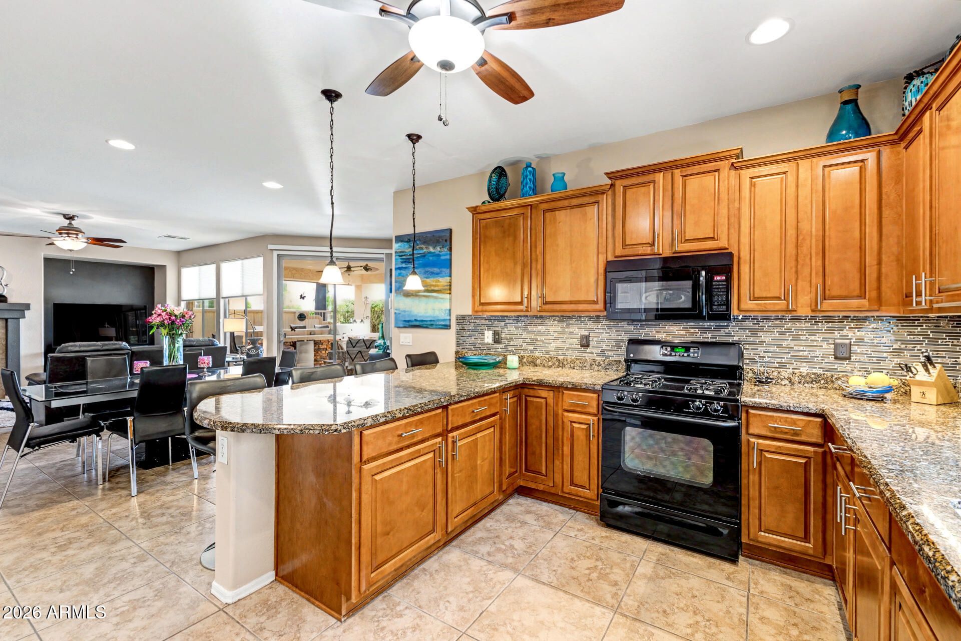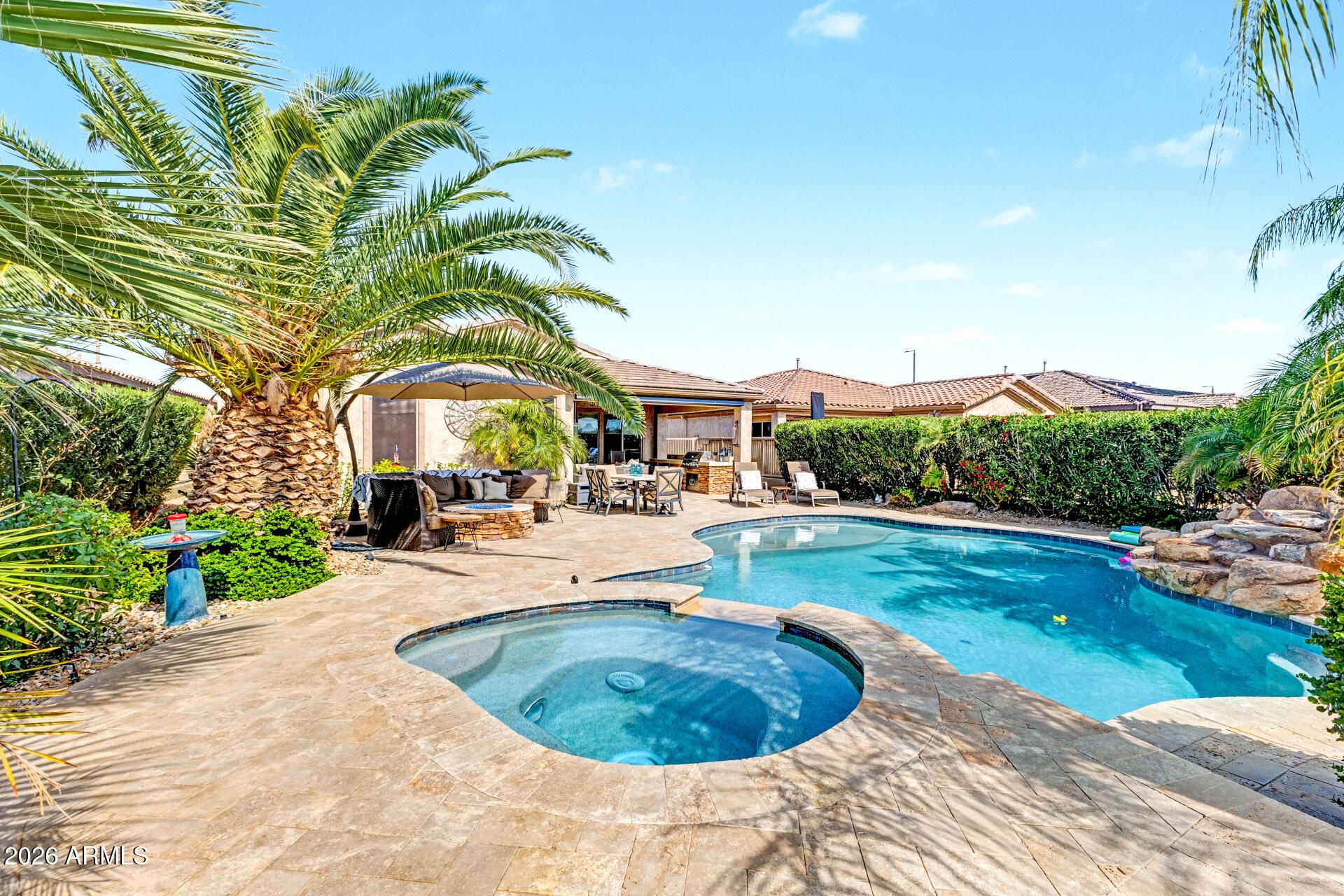 Welcome Home!!! This gorgeous 2 bedroom 2 bath home at the desirable 55+ guard gated community of Trilogy at Power Ranch is in a fantastic location. Close to restaurants, shopping, parks, Mesa Gateway Airport & golfing at the Power Ranch Golf Club. As soon as you step inside this home, you can see the pride in ownership with everything that has been done. You'll love the layout of this home. Your kitchen offers granite counter tops, a breakfast bar, full height mosaic tiled backsplashes, black appliances, filtered water, a pantry & stunning crown molding cabinetry. Your spacious master suite offers a plethora of natural sunlight, a walk in closet, dual vanity & a custom tiled walk in shower. This gated community home also offers upgraded ceiling fans & lighting, a gas fireplace in the living room, a den/office with a murphy bed for an extra bedroom option, a two car garage with epoxy flooring, a water softener & cabinets for extra storage & organization, as well as a front security door for your privacy. This backyard oasis was designed for entertaining. Your backyard offers a large covered patio with ceiling fans & mechanical shading, a built in bbq & bar top, travertine decking, a gas fire pit to relax by, mature landscaping, a view fence that looks out to the San Tan Mountains, along with a sparkling heated (new heater) salt water pool & spa to enjoy all year round. Your guard gated community offers a club house, two swimming pools & a spa, (tennis, pickleball & bocce ball courts), a fully equipped fitness center & many other activity's to be a part of. This gem in the desert is a Great Buy & a Must See!!! **Furniture is available on a separate bill of sale.