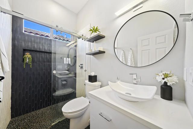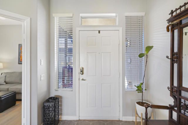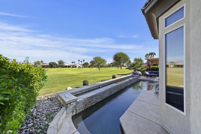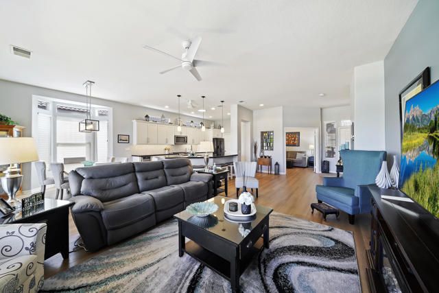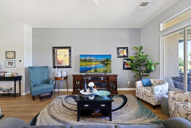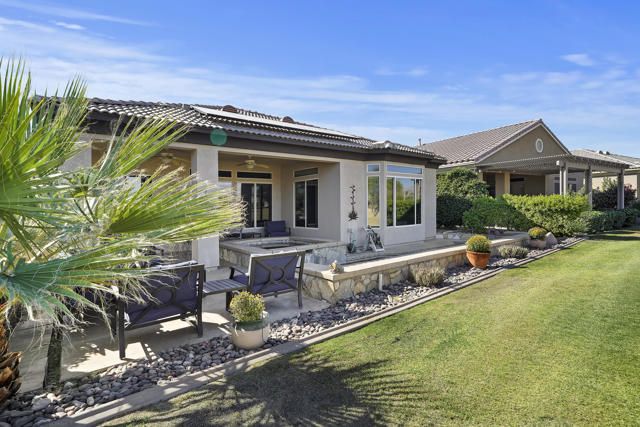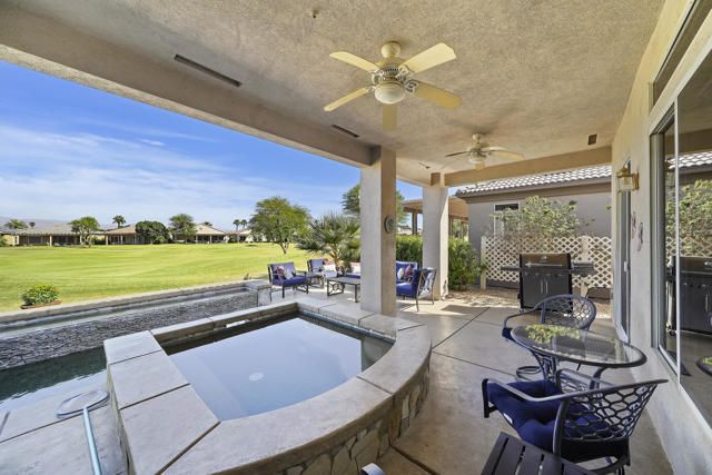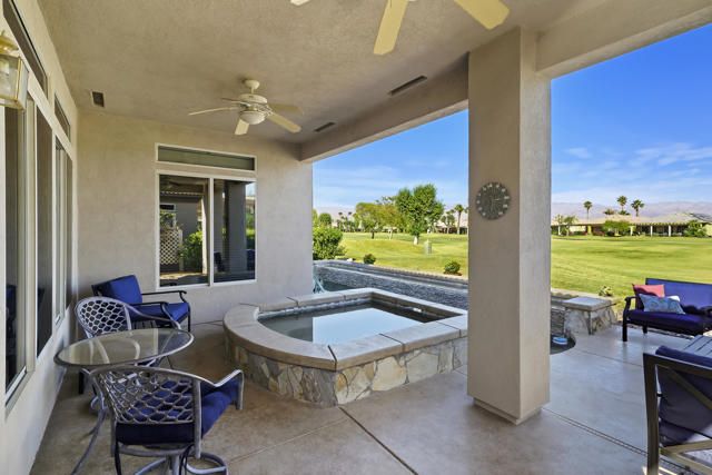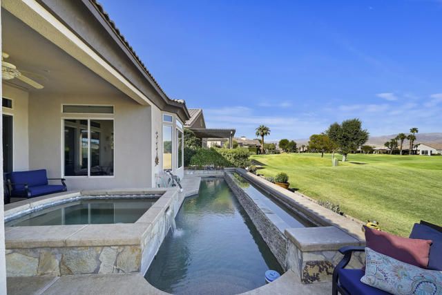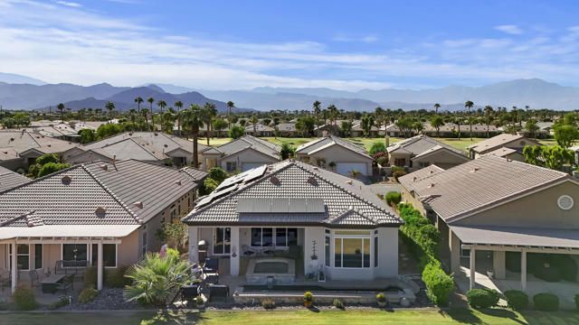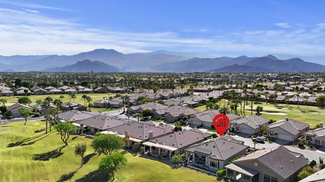 Greet the morning sun in this lovely, remodeled home with expansive 4th fairway and mountain views. The perennial-favorite Merion model resides on a quietcul-de-sac and offers great-room living with 1700 square feet, two bedrooms, den, laundry room with storage and 2-car plus golf-cart garage. The gourmetkitchen has been reimagined with spacious quartz counters, reduced-height island that invites guest interaction, pantry, wine fridge, hidden-appliancecabinetry, and copious storage space. There's brand new LVP flooring throughout the entire house, two renovated bathrooms, walk-in closet, plus solarpanels to mitigate energy bills. Enclosed front patio doubles the outdoor living areas and complements the covered backyard space with its heated Pebble-Tec pool/spa.