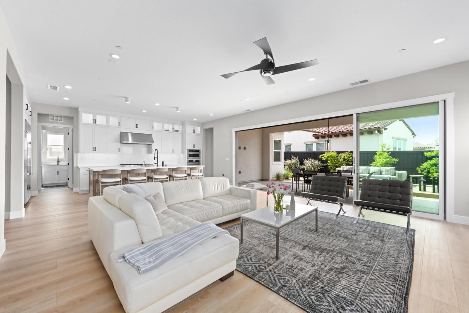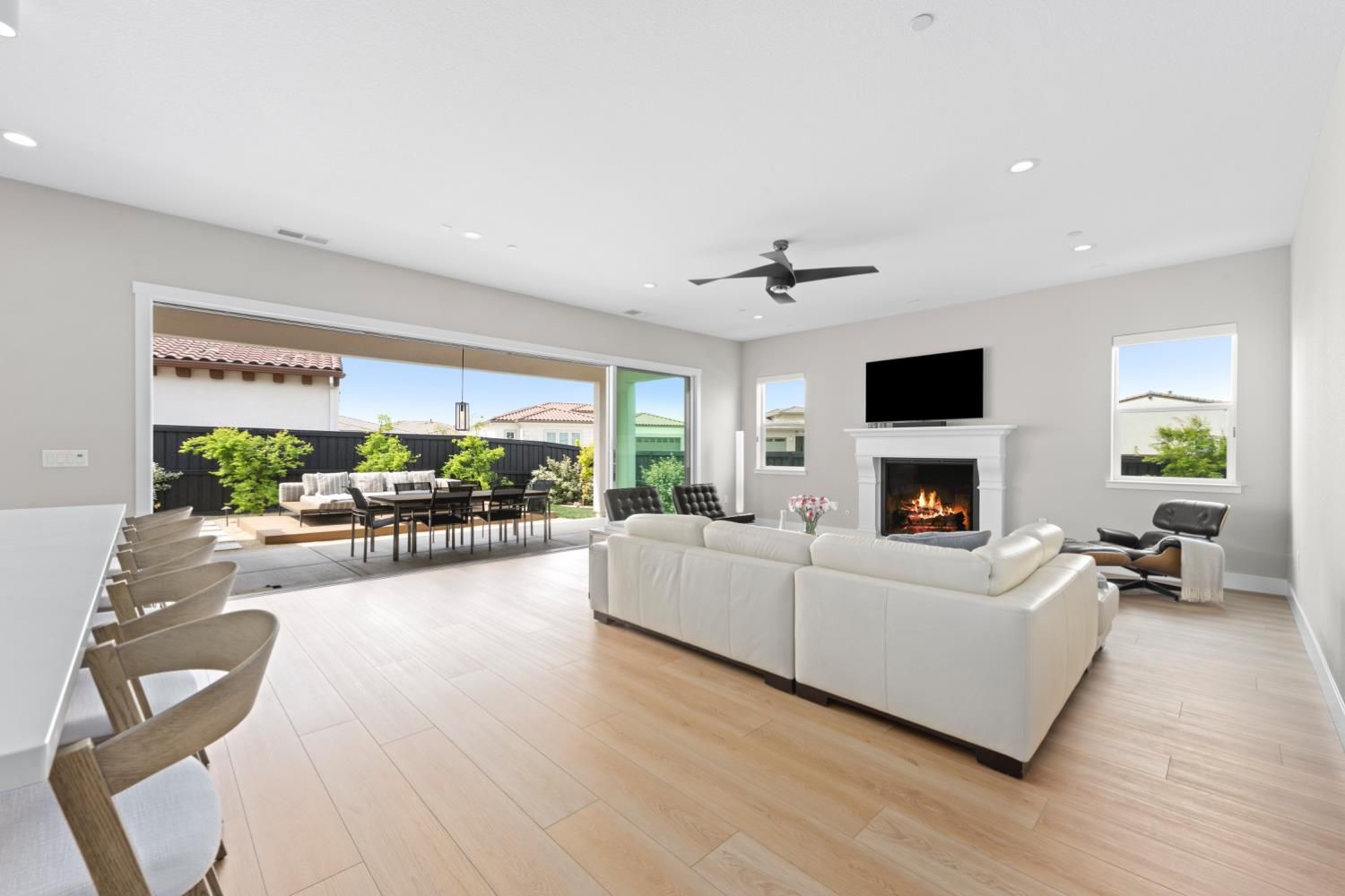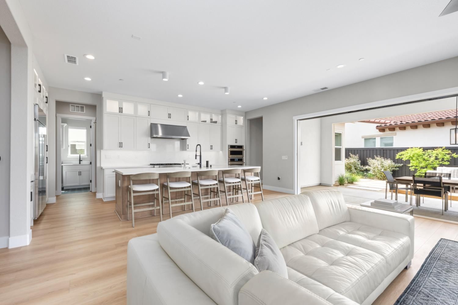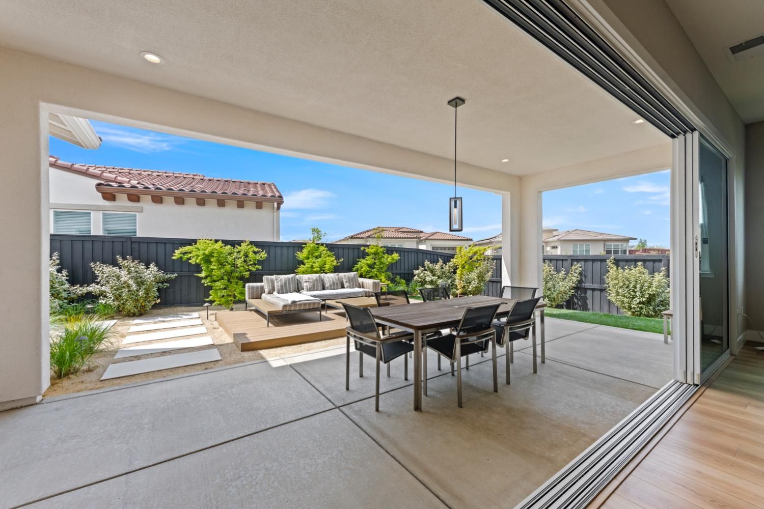 Located in the highly sought-after Regency at Folsom Ranch, an exclusive 55+ gated community, this exceptional residence offers the perfect blend of luxury, comfort, and modern design. Situated on a prime oversized corner lot, the home provides enhanced privacy and impressive curb appeal. Thoughtfully designed with an open-concept floor plan and contemporary architecture, it delivers both elegance and functionality. The grand chef's kitchen flows seamlessly into the expansive great room, highlighted by an impressive accordion-style sliding glass door that creates a true indoor-outdoor al fresco living experienceideal for entertaining or relaxing in style. Inside, the home showcases extensive upgrades, including luxury vinyl plank flooring, designer tile accents, quartz slab surfaces, sleek white European-style cabinetry, stainless steel appliances, and curated designer plumbing and lighting fixtures throughout. The private primary suite serves as a tranquil retreat, featuring a spa-inspired bathroom with an oversized walk-in shower and a modern floating vanity. On a separate wing, two spacious en-suite bedrooms provide comfort and privacy for guests, complemented by a centrally located powder room. The beautifully landscaped backyard is designed for both relaxation and future possibilities, featuring an oversized covered patio, a raised deck for everyday lounging, elegant Japanese maples, and a generous side yard perfect for a future pool or garden. Additional highlights include owned solar, a built-in GE Monogram refrigerator, upgraded cabinetry, upgraded JennAir RISE appliances with professional-grade performance, a Heat and Glow True gas fireplace, and Hunter Douglas window treatments. Property Details: 3 Bedrooms 3.5 Bathrooms Approx. 2,012 Sq. Ft. 2-Car Garage Residents of Regency at Folsom Ranch enjoy resort-style amenities, including a pool, spa, fitness center, pickleball courts, dog park, playground, and scenic walking trails.