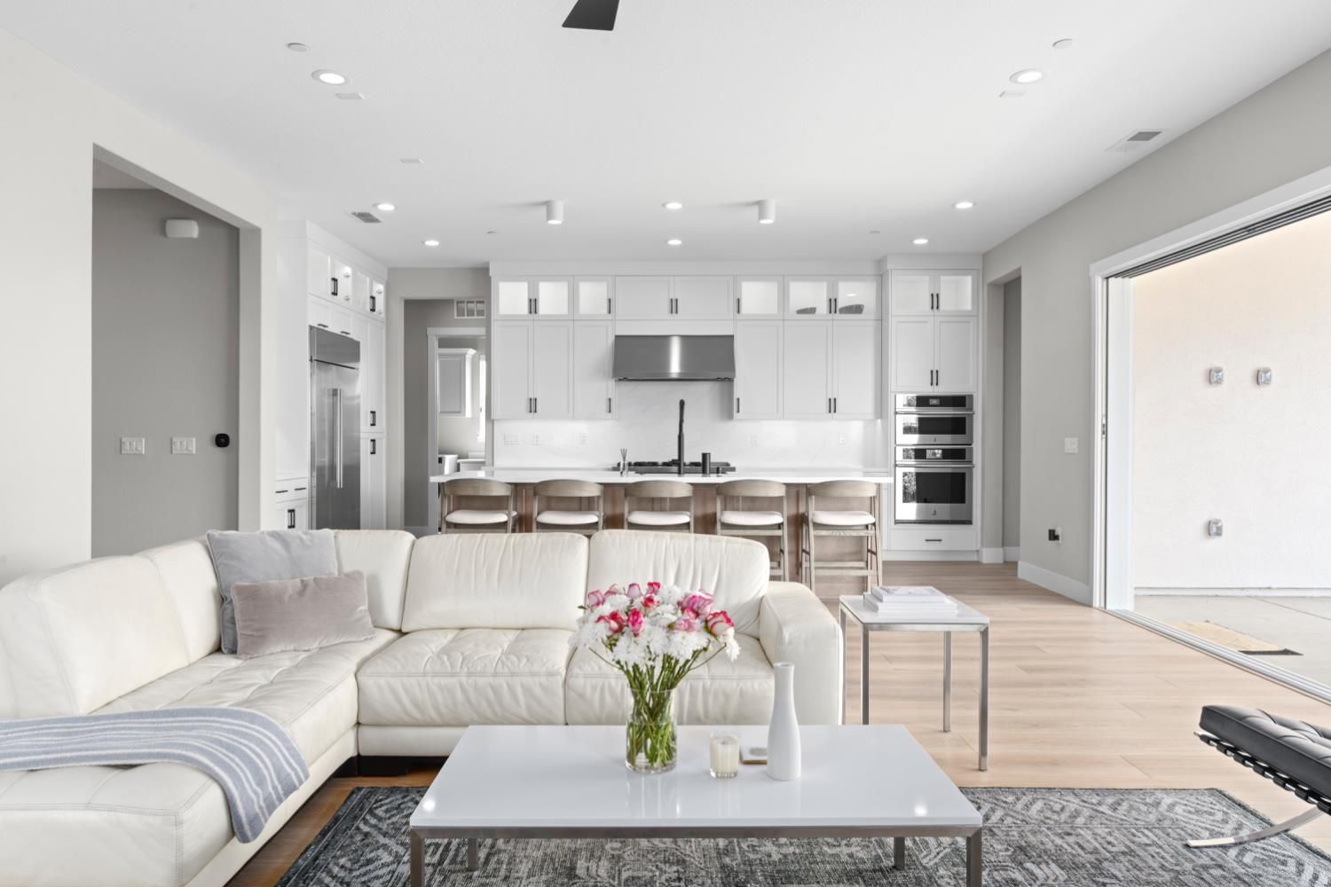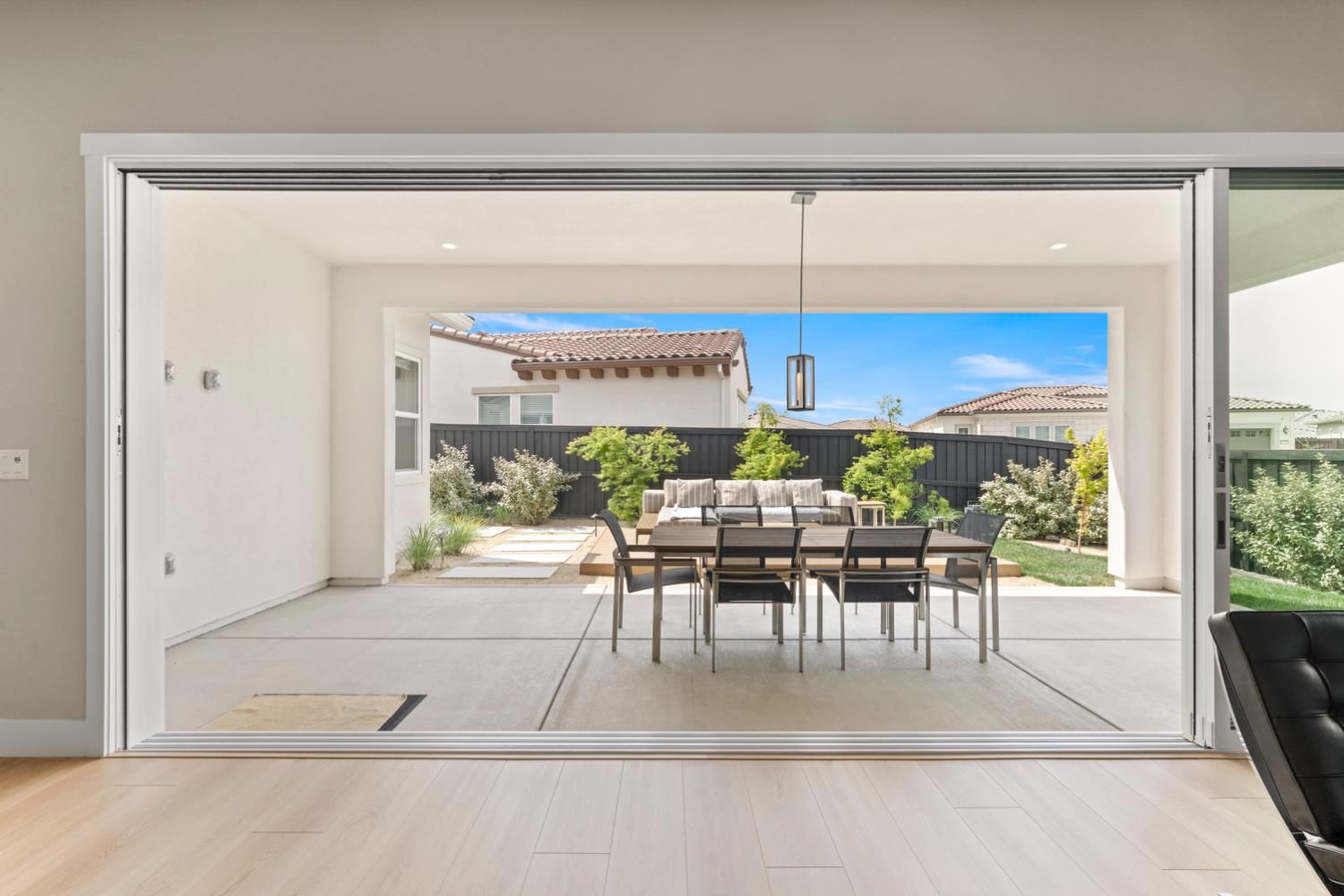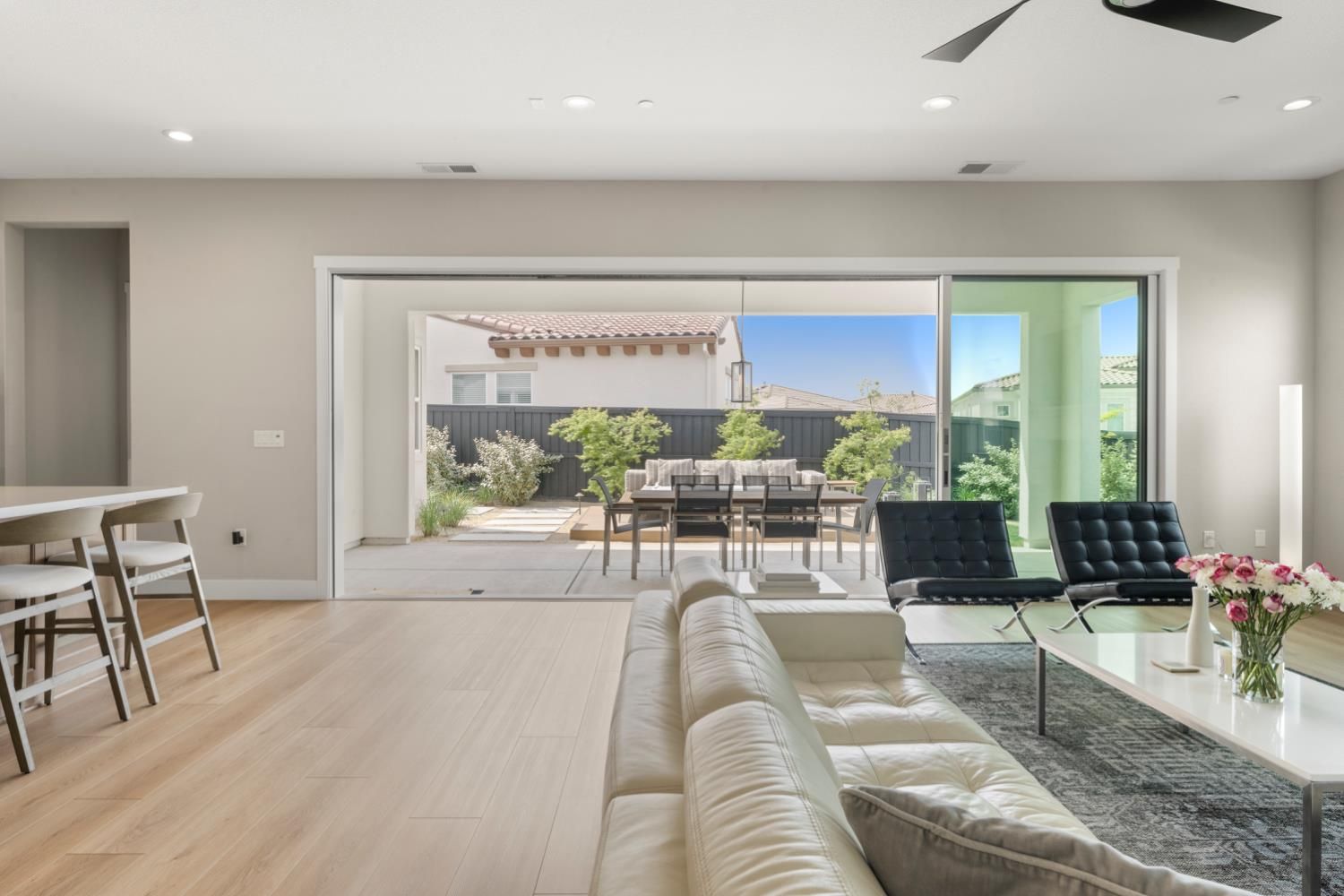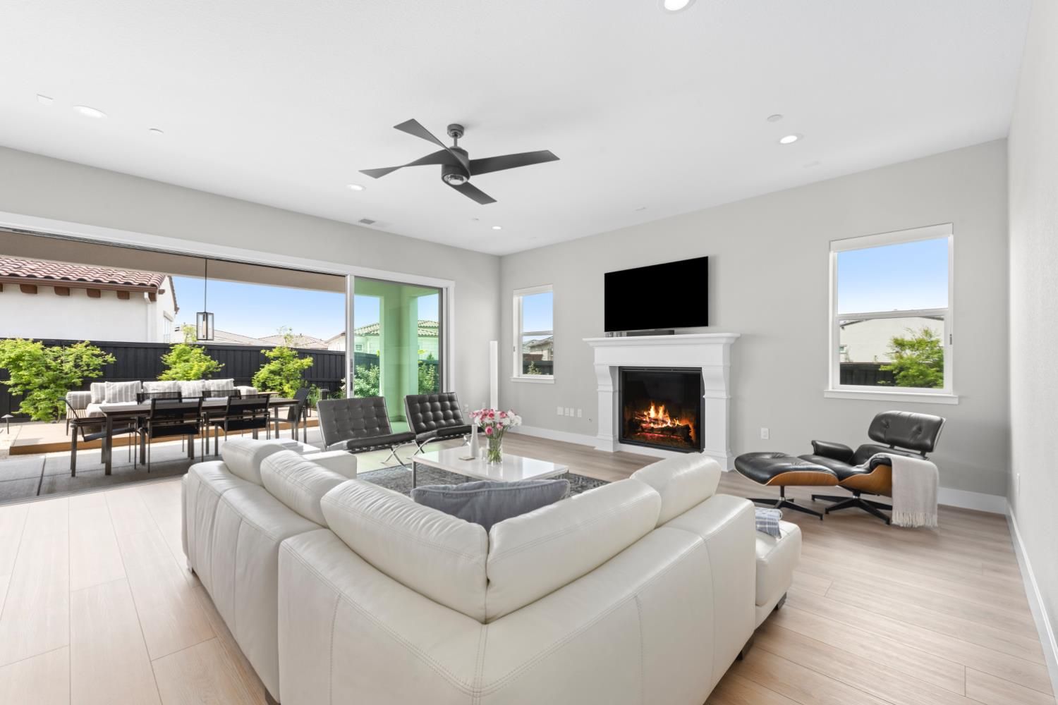 Located in the highly sought-after Regency at Folsom Ranch, an exclusive 55+ gated community, this exceptional residence offers the perfect blend of luxury, comfort, and modern design. Situated on a prime oversized corner lot, the home provides enhanced privacy and impressive curb appeal. Thoughtfully designed with an open-concept floor plan and contemporary architecture, it delivers both elegance and functionality. The grand chef's kitchen flows seamlessly into the expansive great room, highlighted by an impressive accordion-style sliding glass door that creates a true indoor-outdoor al fresco living experienceideal for entertaining or relaxing in style. Inside, the home showcases extensive upgrades, including luxury vinyl plank flooring, designer tile accents, quartz slab surfaces, sleek white European-style cabinetry, stainless steel appliances, and curated designer plumbing and lighting fixtures throughout. The private primary suite serves as a tranquil retreat, featuring a spa-inspired bathroom with an oversized walk-in shower and a modern floating vanity. On a separate wing, two spacious en-suite bedrooms provide comfort and privacy for guests, complemented by a centrally located powder room. The beautifully landscaped backyard is designed for both relaxation and future possibilities, featuring an oversized covered patio, a raised deck for everyday lounging, elegant Japanese maples, and a generous side yard perfect for a future pool or garden. Additional highlights include owned solar, a built-in GE Monogram refrigerator, upgraded cabinetry, upgraded JennAir RISE appliances with professional-grade performance, a Heat and Glow True gas fireplace, and Hunter Douglas window treatments. Property Details: 3 Bedrooms 3.5 Bathrooms Approx. 2,012 Sq. Ft. 2-Car Garage Residents of Regency at Folsom Ranch enjoy resort-style amenities, including a pool, spa, fitness center, pickleball courts, dog park, playground, and scenic walking trails.