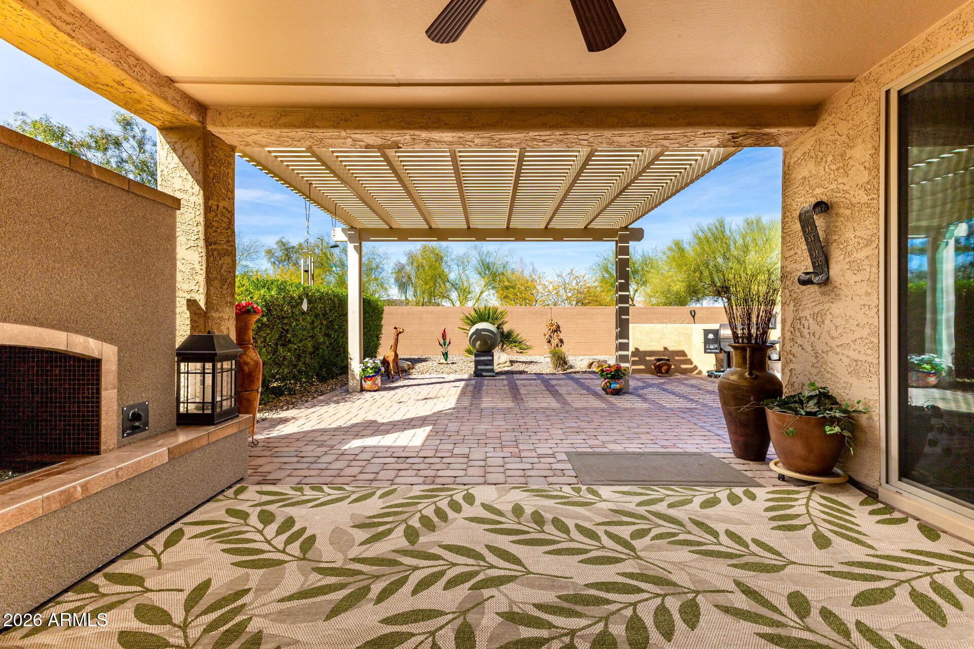 LIVE YOUR DREAMS! Stunning, highly upgraded Sanctuary welcomes you--where thoughtful design meets high comfort & modern efficiency. Step inside to discover designer tile flooring thru-out the main living area, complimented by Plantation Shutters, powder room & a versatile den (perfect home office, media room or retreat). Stylish kitchen w/ granite counters, Shaker Cabinetry, tiled b/sp, gas range, pull-out shelves & spacious pantry. Enjoy peaceful evenings around a cozy fireplace, on the extended paver patio w/ pergola...or the front paver courtyard w/ privacy & charm...both are perfect settings! A luxurious primary suite, charming bay window, lrg closet, dual sinks & step in shower w/ bench. Guests will appreciate their own private suite w/ 3/4 bath! This is Arizona living at its best!! Sun City Anthem at Merrill Ranch offers a 48,000 SF recreation center w/ craft rooms for quilting, pottery, glass works, jewelry & crafts, spacious ballroom w/ stage for dancing, theatrical productions, concerts & more. PLUS full gym, work out rooms, indoor lap pool & spa, walking track, cafe area, card rooms, poker tables, pool table, ping pong table, business center, class room for interesting seminars! Troon Poston Butte Golf Course is one of the nicest in the area. Sun City offers Pickleball, Tennis, Bocce Ball, Horseshoes, Shuffleboard, clubs for all activities.......LIVE WHERE THE SURROUNDINGS DELIGHT, INSPIRE & CHALLENGE YOU!