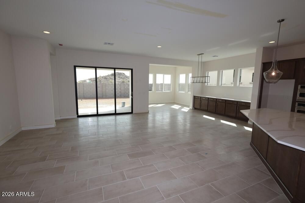 BRAND NEW single level home with 4 bed, 3.5 bath, study, sunroom off dining area and 3 car garage in gated Verrado community; open plan with incredible sightlines through large, energy efficient windows and 9' sliding glass door exiting to private backyard; clean modern kitchen with tons of warm cabinets, white tiled backsplash and quartz coutertops; GE stainless appliances including gas cooktop; upgraded plank tile flooring, carpet/pad throughout; spa-like owner's bath with upgraded countertps, tiled shower and FREESTANDING tub with His/Her closet space; 2x6 CONSTRUCTION AND EXTENSIVE NEW HOME WARRANTY.