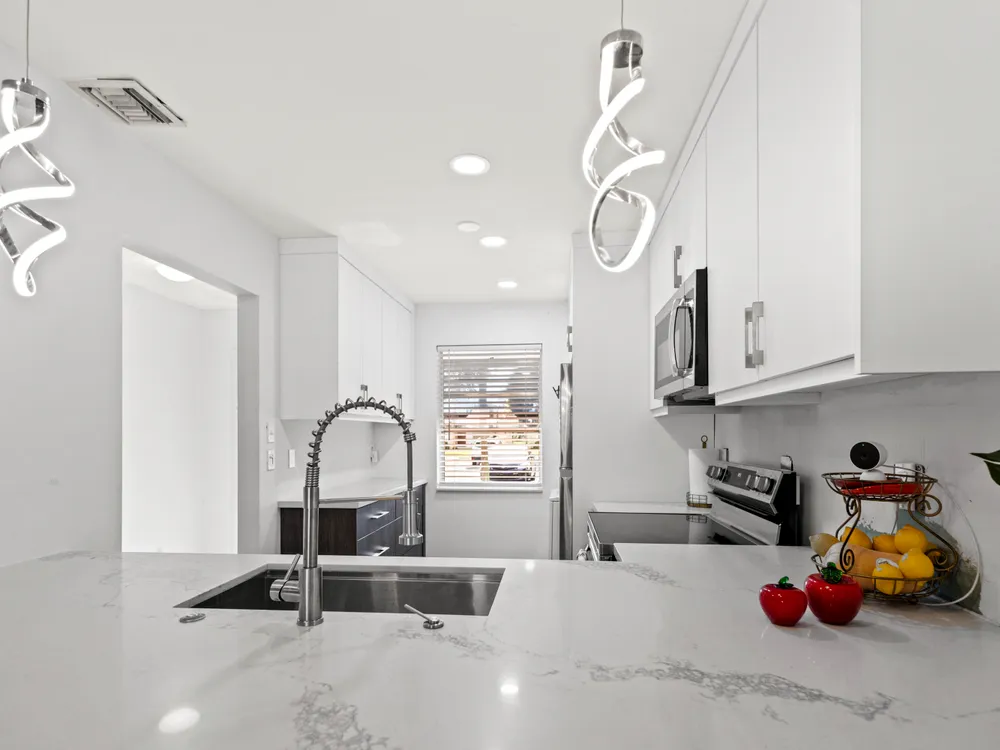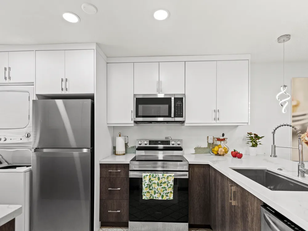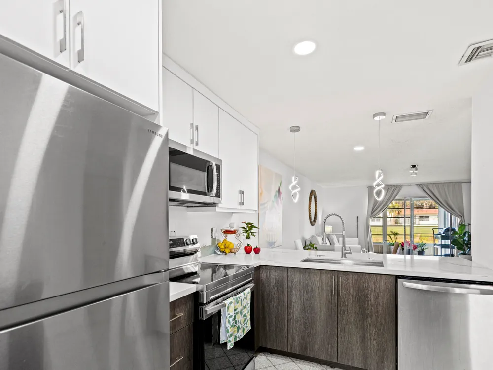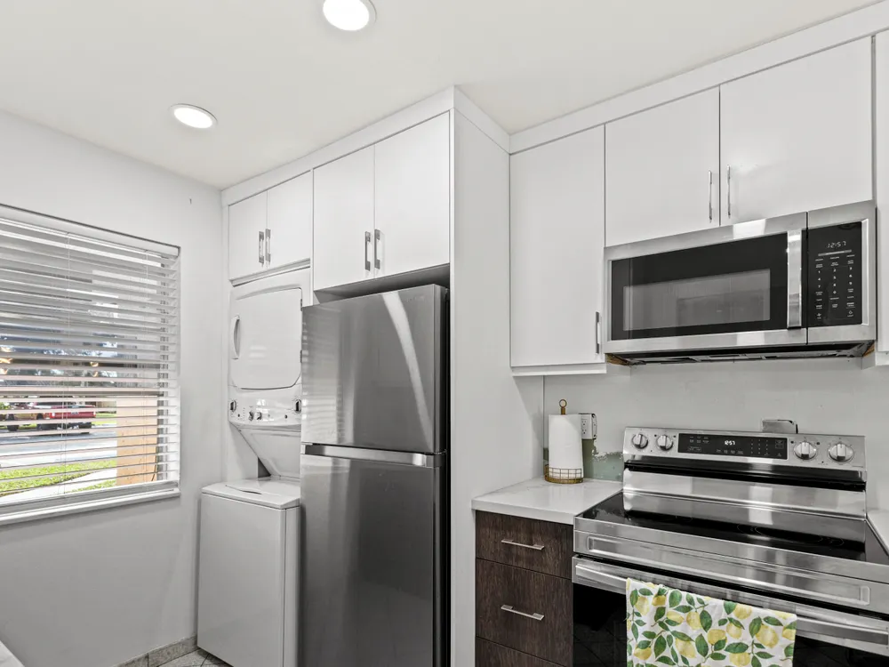 Don't miss out! With the recent price reduction, this is hands-down the BEST-priced villa in Golden Lakes! New ROOF and New AC! This stunning 2-bedroom, 2-bathroom home has been completely remodeled and updated--it's move-in ready and waiting for you! Hurry, this incredible deal won't last long! One occupant must be 55+, no one under 19 to reside full time. Stylishly updated with tile and wood-style flooring throughout. The kitchen boasts modern stainless steel appliances, including a convection oven and microwave. Enjoy the convenience of an in-unit front-loading washer and dryer. The unit features newer A/C for year-round comfort and is meticulously maintained.