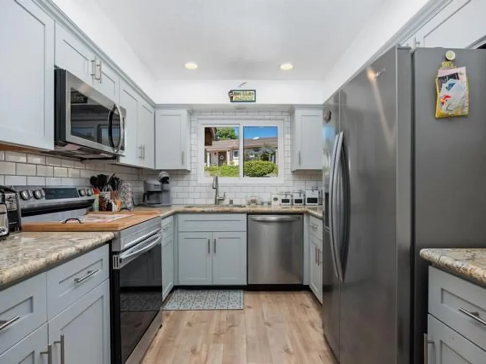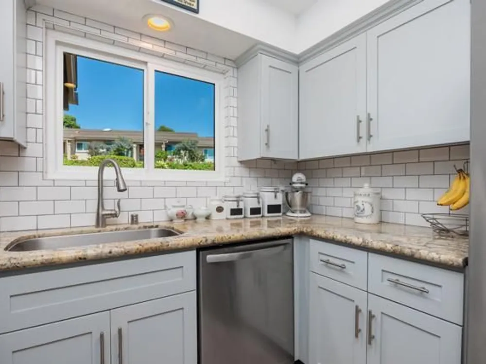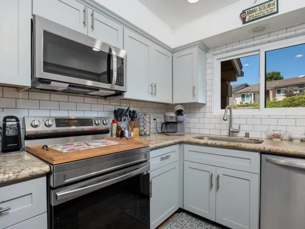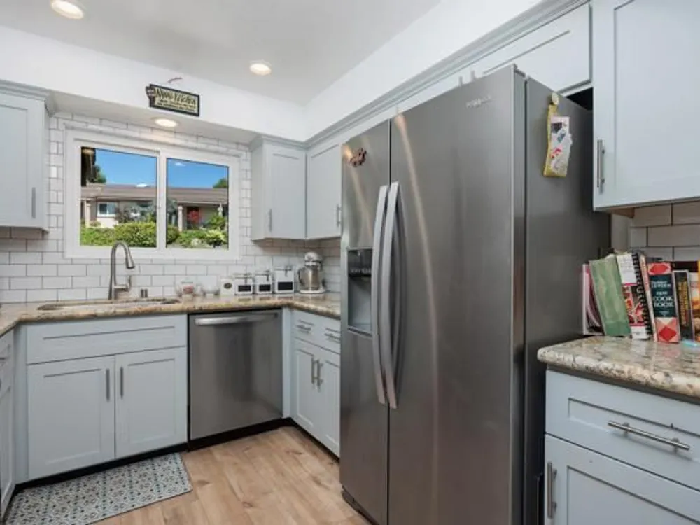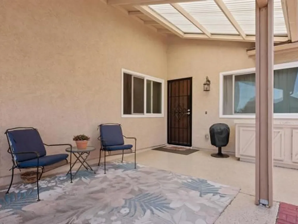This beautifully REMODELED single-story home nestled in the 55+ community of Oceana III offers 2 spacious bedrooms and 2 bathrooms, all set against a backdrop of serene, open green space. Within proximity to the community pool and clubhouse, the location couldn’t be better! Enjoy peace of mind with the following recent upgrades: modern stainless appliances, double pane windows, water heater, furnace, AIR CONDITIONING, Ceiling fans, beautiful rich wood laminate flooring. The kitchen has been completely remodeled with rich mocha cabinetry, sleek granite countertops, a contemporary subway backsplash, recessed lighting and stainless-steel appliances. The kitchen has a window that looks out to the open green space and brings in a lot of natural light. Both bathrooms have been completely remodeled with modern vanities, adding a crisp, clean aesthetic. The primary bedroom with its en-suite bathroom has mirrored closet doors, rich wood laminate floors and is nice in size. The additional bedroom also has mirrored closet doors and rich wood laminate floors. The main living area provides a comfortable and inviting space for relaxation or entertaining. Enjoy year-round outdoor living on the spacious covered patio which has an epoxy coating. The attached one car garage also includes epoxy flooring and laundry hookups. Residents enjoy access to a well-appointed clubhouse, fitness center, pool, spa, and beautifully maintained walking paths, along with shopping and dining less than a mile away—and Oceanside Harbor, local beaches, and the 5 freeway all within a 10-minute drive—this home offers the perfect balance of tranquility and accessibility. Don’t miss your chance to enjoy resort-style living in one of Oceanside’s most desirable communities.