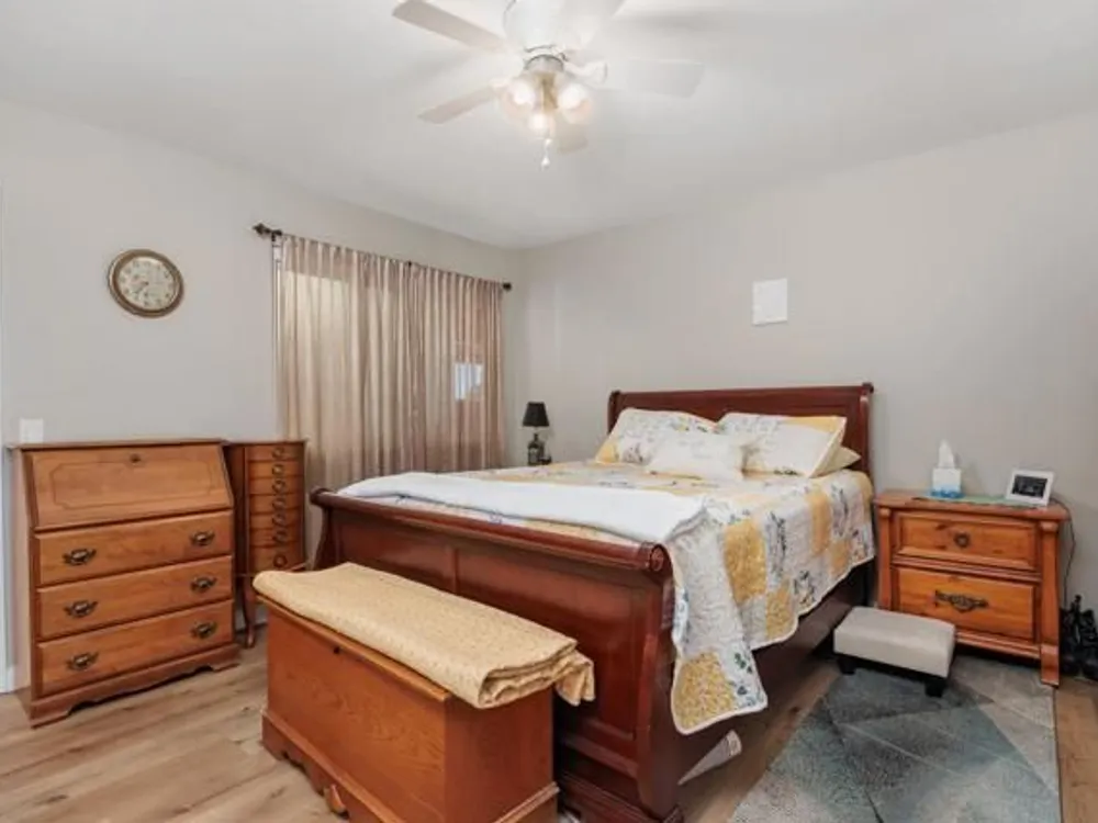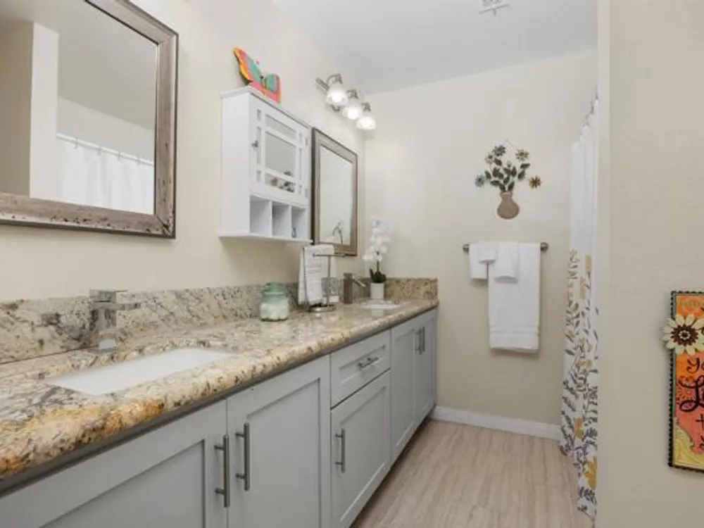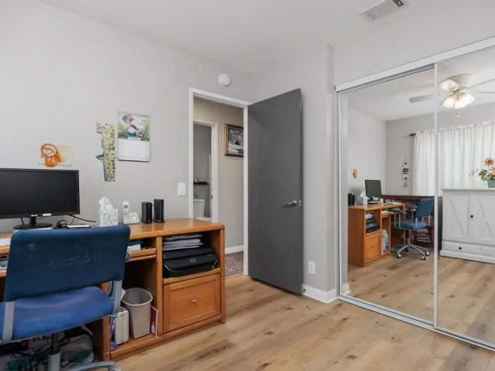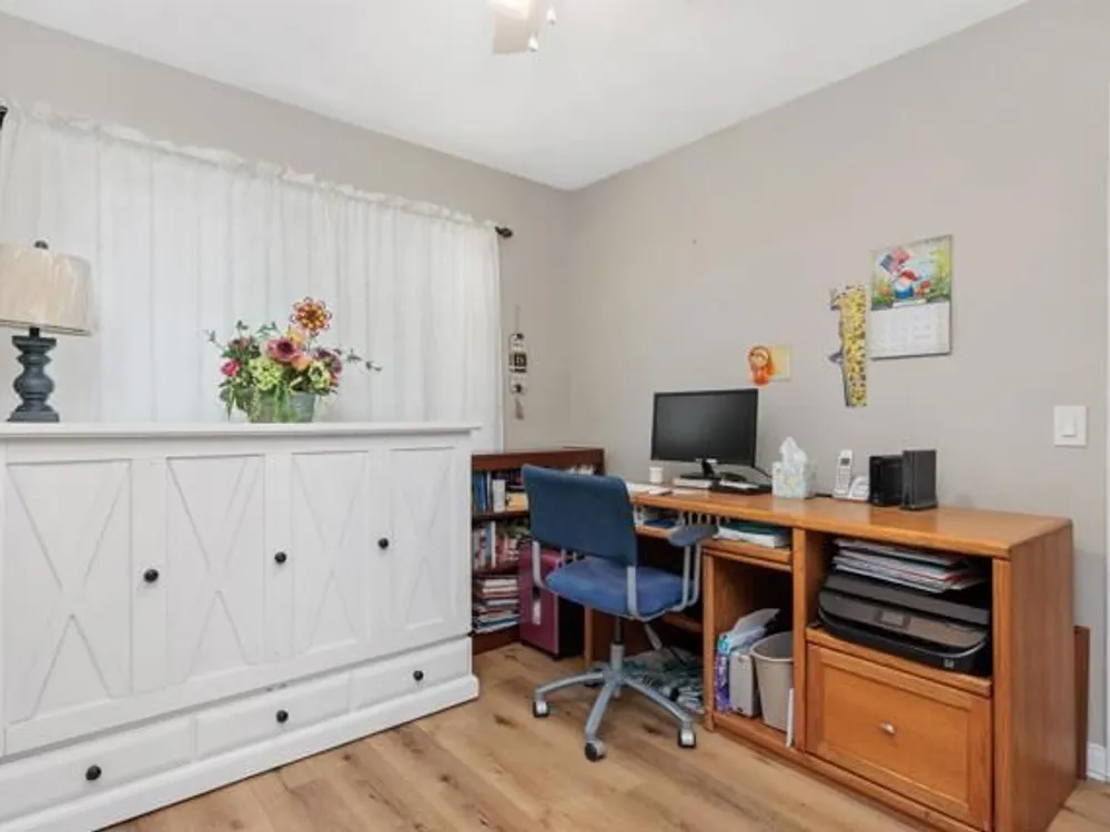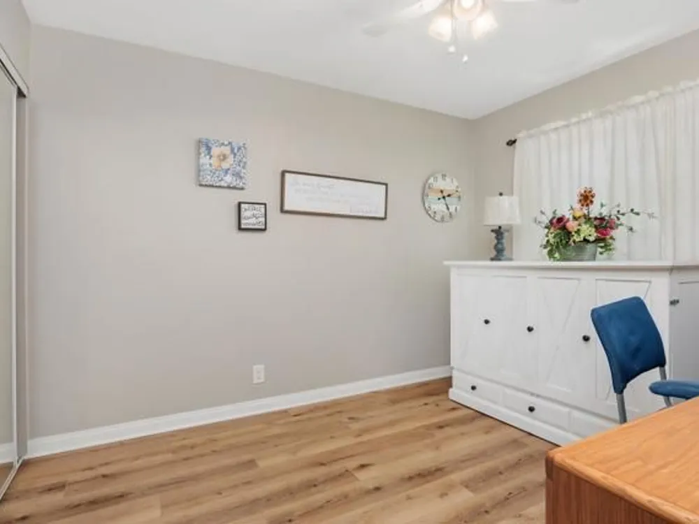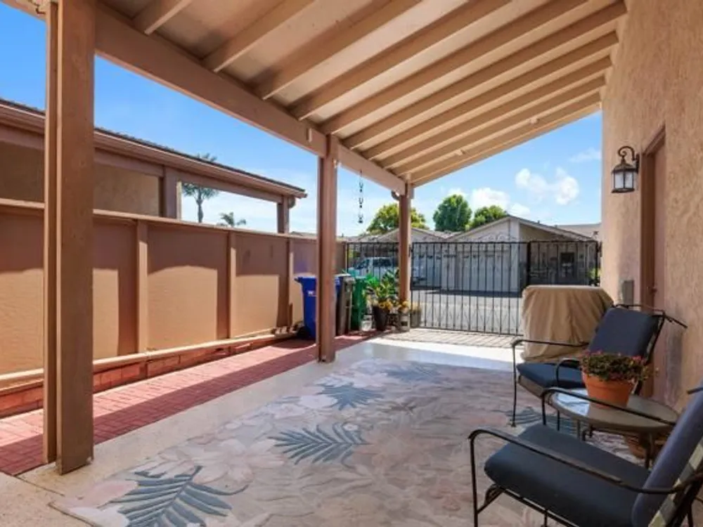 This beautifully REMODELED single-story home nestled in the 55+ community of Oceana III offers 2 spacious bedrooms and 2 bathrooms, all set against a backdrop of serene, open green space. Within proximity to the community pool and clubhouse, the location couldn’t be better! Enjoy peace of mind with the following recent upgrades: modern stainless appliances, double pane windows, water heater, furnace, AIR CONDITIONING, Ceiling fans, beautiful rich wood laminate flooring. The kitchen has been completely remodeled with rich mocha cabinetry, sleek granite countertops, a contemporary subway backsplash, recessed lighting and stainless-steel appliances. The kitchen has a window that looks out to the open green space and brings in a lot of natural light. Both bathrooms have been completely remodeled with modern vanities, adding a crisp, clean aesthetic. The primary bedroom with its en-suite bathroom has mirrored closet doors, rich wood laminate floors and is nice in size. The additional bedroom also has mirrored closet doors and rich wood laminate floors. The main living area provides a comfortable and inviting space for relaxation or entertaining. Enjoy year-round outdoor living on the spacious covered patio which has an epoxy coating. The attached one car garage also includes epoxy flooring and laundry hookups. Residents enjoy access to a well-appointed clubhouse, fitness center, pool, spa, and beautifully maintained walking paths, along with shopping and dining less than a mile away—and Oceanside Harbor, local beaches, and the 5 freeway all within a 10-minute drive—this home offers the perfect balance of tranquility and accessibility. Don’t miss your chance to enjoy resort-style living in one of Oceanside’s most desirable communities.