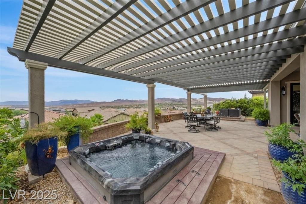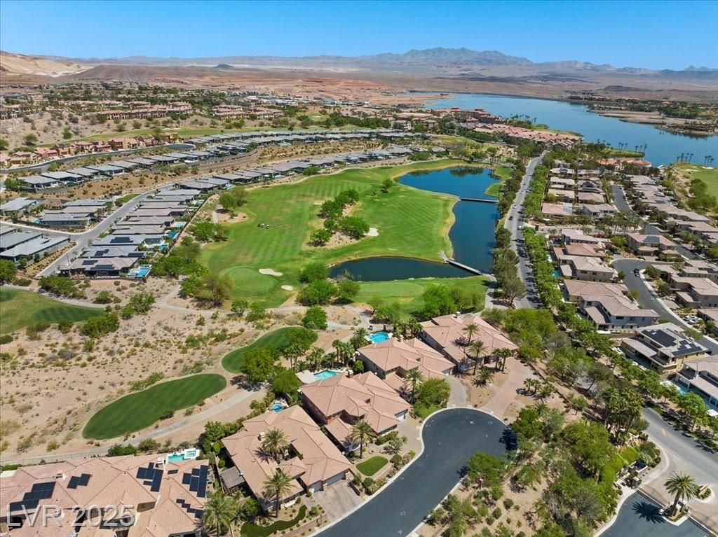 An exceptional value with extensive custom upgrades already in place, this elevated single-story home offers lake and mountain views with resort-style living. The split floor plan features two en suites with walk-in closets, including a spacious guest suite set apart from the main living areas. The primary suite includes a separate tub and shower and a custom walk-in closet. A private flex room provides versatility for an office, den, or guest space.The kitchen showcases upgraded cabinetry with lighted glass uppers. There is a tankless water heater with hot water circulation. A gas fireplace anchors the living room. Outdoor living includes a private wrought-iron courtyard, expansive pergola-covered patio, multiple seating areas, and an electric spa. An owned Ion solar system helps offset energy costs. Built on a solid cut-lot foundation, the home includes LLV Sports Club membership, a $25,000 value. It’s minutes from dining, shopping & outdoor activities & about 35 mins from the Strip.