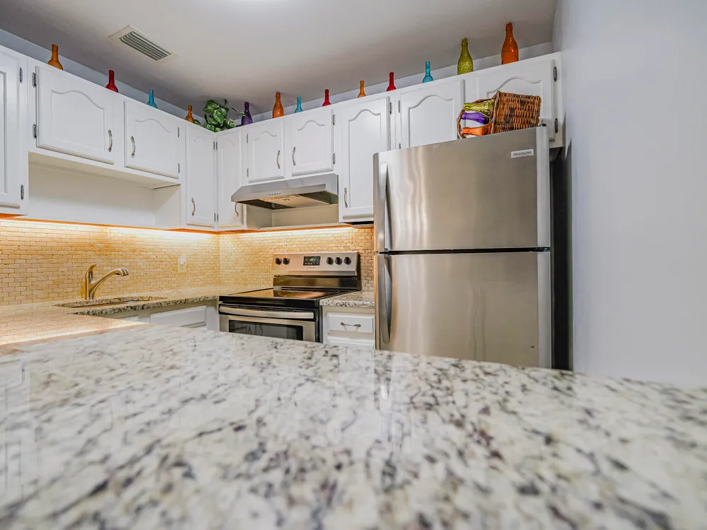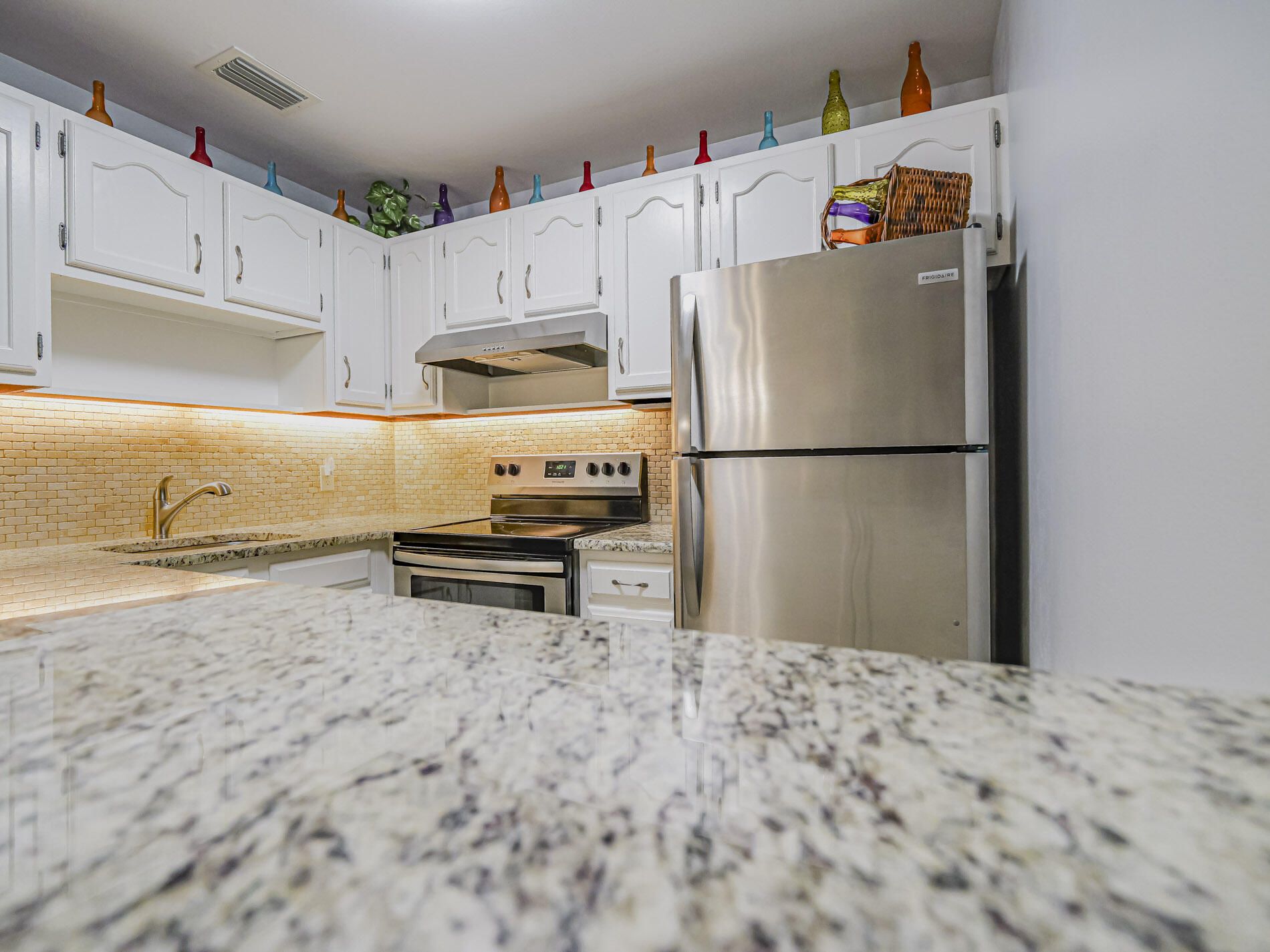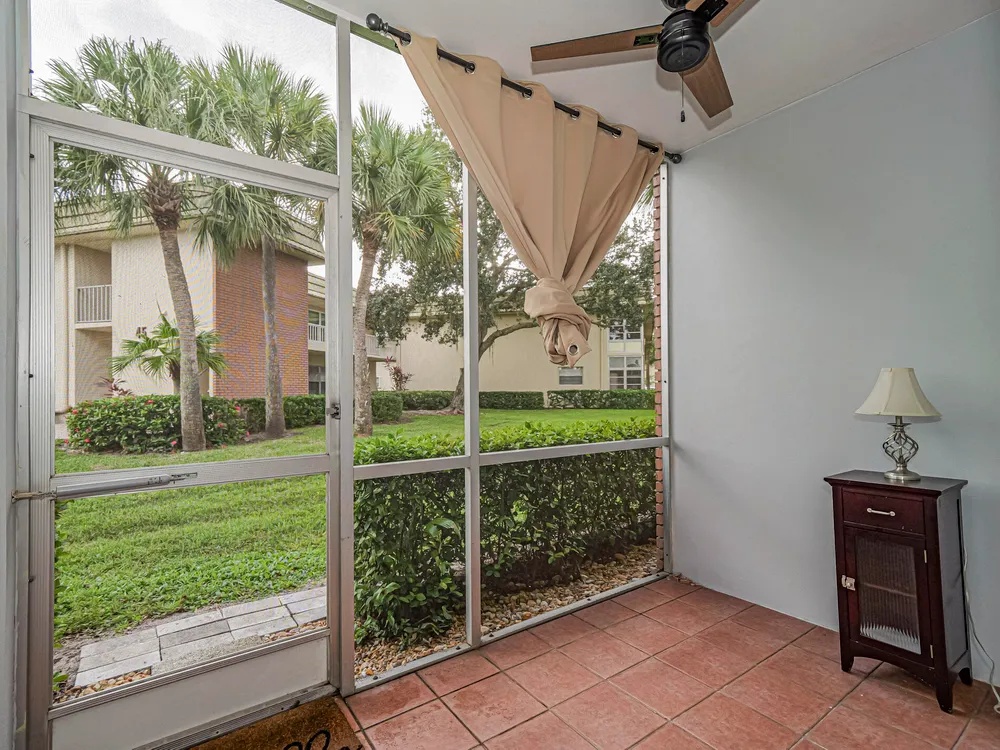 Impeccable first floor 1BR with washer and dryer in the unit. Completely remodeled with newer tile floors, updated kitchen with granite counters, tiled backsplash, and stainless steel appliances. Updated lighting, newer windows, and screened porch with view of grounds. Vista Gardens is a 55+ community with pool, tennis, on site mgmt, and golf separately. Just 2 miles to beaches! The MOST affordable housing in Vero Beach. No pick up trucks, no pets, Dues include basic cable, water, sewer and garbage, plus all amenities. Heated pool, hottub!