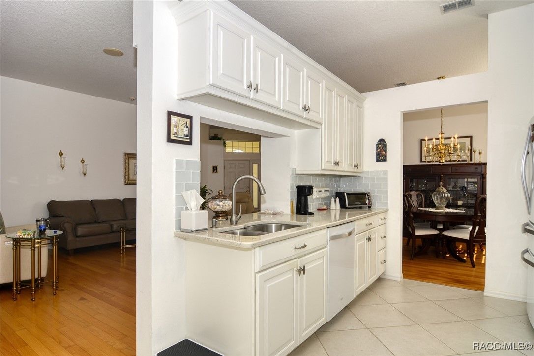 So many high class upgrades in this 3 bedroom, 2 bath Hammocks Villa with nice-sized 2 car garage. Enter and enjoy the elegant wood floors throughout (not LVP) with tile floors in kitchen, baths, nook & laundry room. The remodeled kitchen with newer appliances boasts quartz counters, 42" cabinetry, 6 large drawers, 4 door stainless steel French door fridge, under cabinet lighting and pull-out drawers. There is a pass thru from kitchen to the Great room. Other extras: plantation shutters, security system, roof done 2020 and HVAC system replaced 2020. Tiled lanai has an extended screened patio for outdoor entertainment Master features 2 nicely sized walk-in closets, dual sinks and redone gorgeous spacious walk-in shower. There is a remote screen on garage door plus a keypad for extra convenience. This is a 55 plus community with a monthly $329.00 HOA that includes: full yard maintenance, water for the yard, irrigation, cable, trash pickup Wifi, pest control for the yard, use of heated community pool year 'round plus a small cabana for get togethers. You love the quality features of this villa!