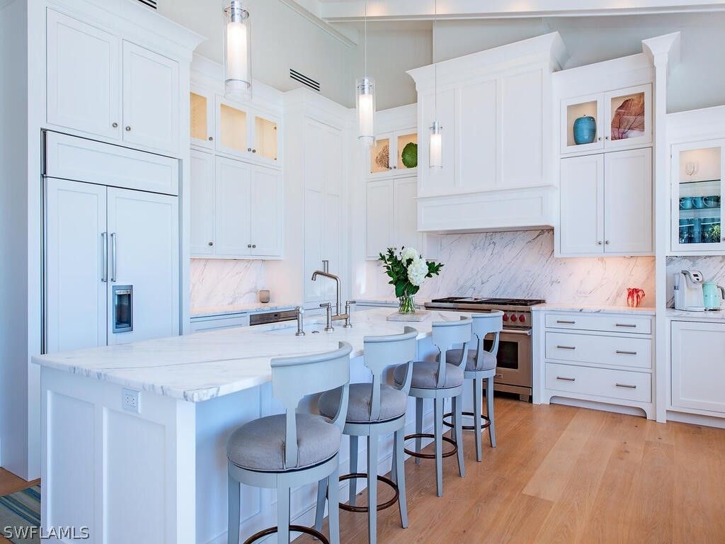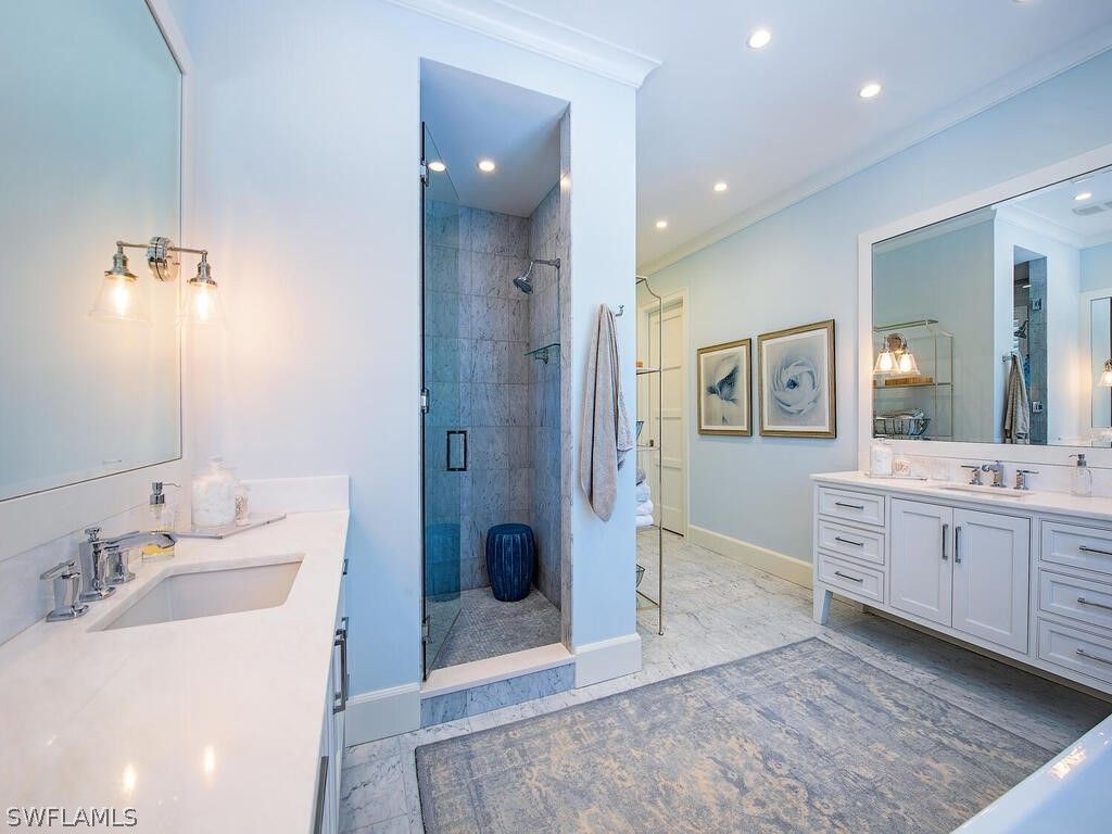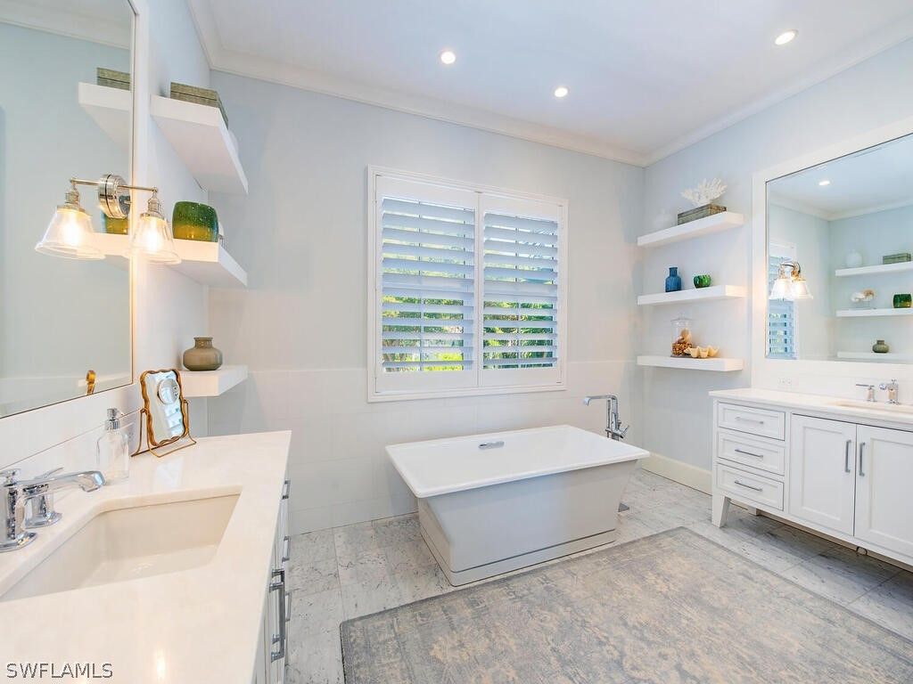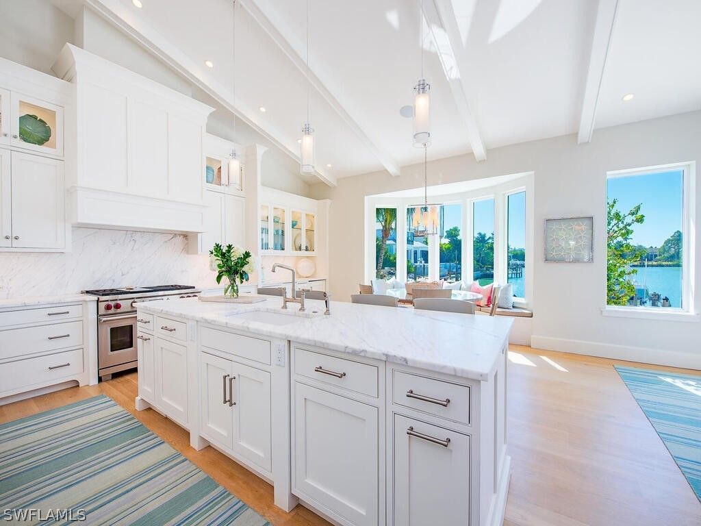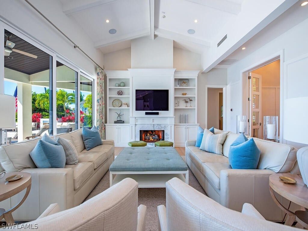 Southern exposure with wide bay views in this beautifully waterfront residence. Offering 6 bedrooms plus study and an expansive gathering room, this home is designed for comfortable living and effortless entertaining. The outdoor living space is exceptional, featuring a large lanai and pool deck overlooking the bay, a private dock with lift and jet ski platforms, and quick boating access to the Gulf. The pool and spa area offers a generous sun deck with excellent sun exposure and a fireplace for evening enjoyment. The home was taken down to the concrete block walls and completely rebuilt, with renovation completed in 12/2014 with Timeless finishes. Thoughtfully updated throughout, it combines quality construction with a functional floor plan ideal for family living and guests. Located in the Moorings, with convenient golf cart access to the private beach, downtown Naples, and Waterside Shops. Enjoy close proximity to Naples’ renowned beaches, dining, and shopping.