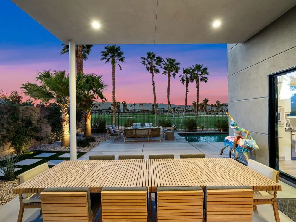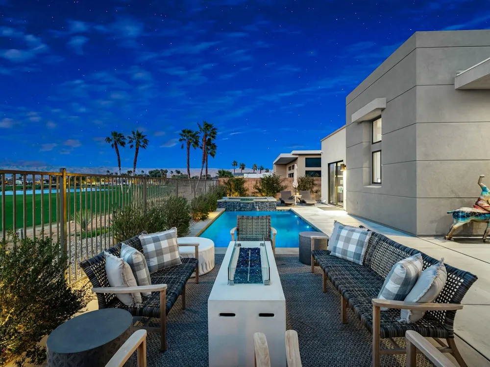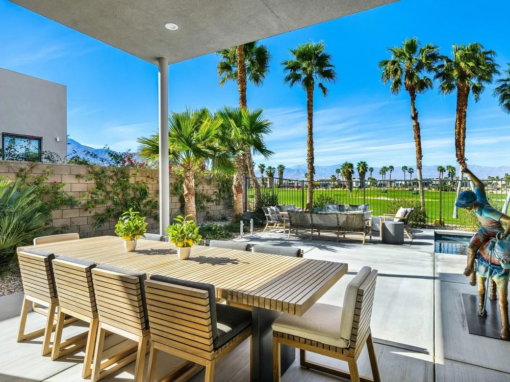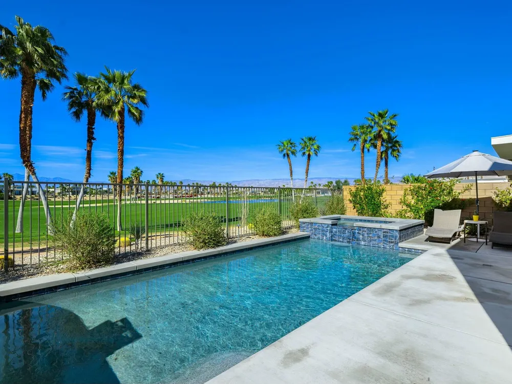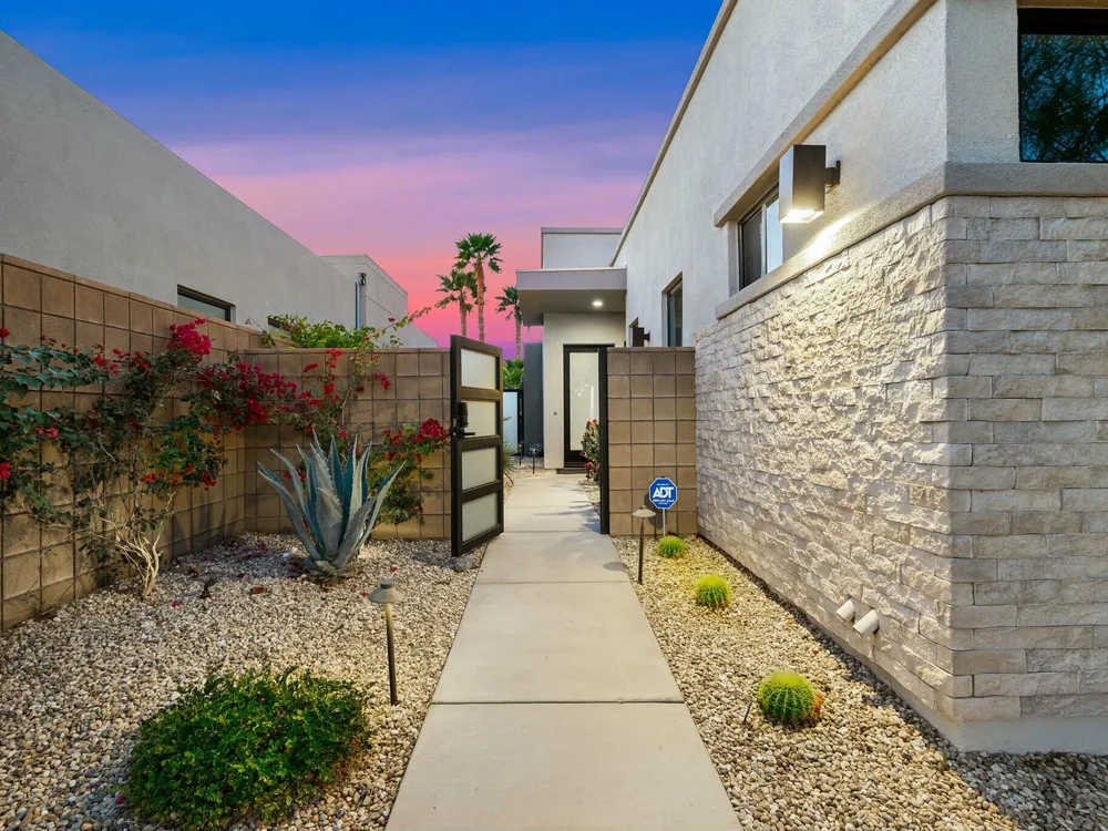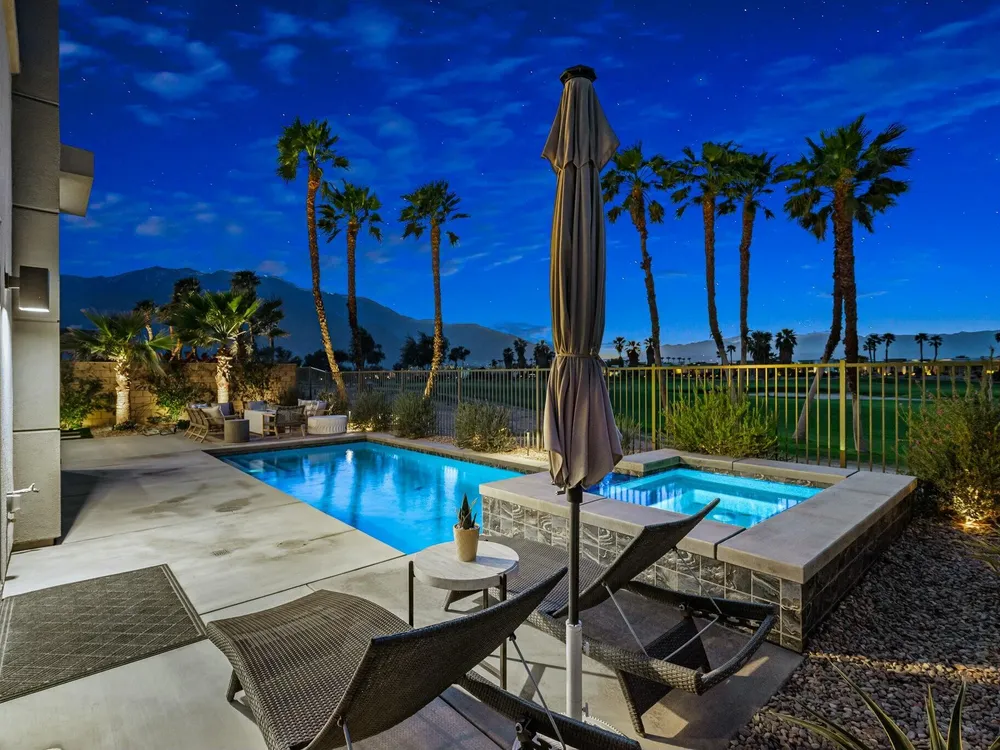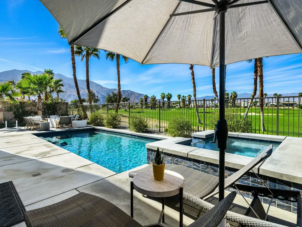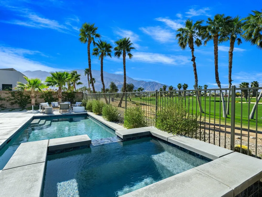 This one-of-a-kind Fig & Nash designed modern home with gorgeous mountain views is in the gated community of Escena! Built in 2023, this 3-bedroom, plus office, 4-bathroom home offers 2,598 sq. ft. of luxurious living space. Situated on a double fairway of the acclaimed Escena Golf Course, the property boasts phenomenal panoramic 180 degree western and northern mountain views. With over $300K in builder and owner upgrades, the home features 12 ft. ceilings, clerestory windows, designer light fixtures and beautiful custom wallpaper. The gourmet Chef's kitchen with a Quartz island, extended cabinetry and a walk-in pantry, features Jenn Air appliances that include a double oven, dishwasher, microwave & refrigerator. Enjoy an open floor plan, luxury vinyl tile (mimicking a hardwood floor look) throughout, a great room with fireplace, wet bar with sink & wine refrigerator, and stackable sliding doors leading out to a beautiful, covered patio and back yard. The gorgeous primary suite has custom vanities & cabinetry, large soaking tub, quartz counters and sliding door access to the pool and spa. The two guest bedrooms, both with well-appointed ensuite bathrooms, are thoughtfully separated from the Primary suite. The outdoor space is an entertainer's dream featuring a covered patio for dining, salt-water, PebbleTec pool with tiled raised spa, and a lovely seating area with firepit to enjoy the gorgeous panoramic mountain views. Additional highlights include motorized blinds throughout, a powder room, laundry room with a sink & cabinetry, 2-car garage with epoxy floor & owned solar. Experience luxury, modern convenience, and spectacular views in this warm and inviting Palm Springs home!