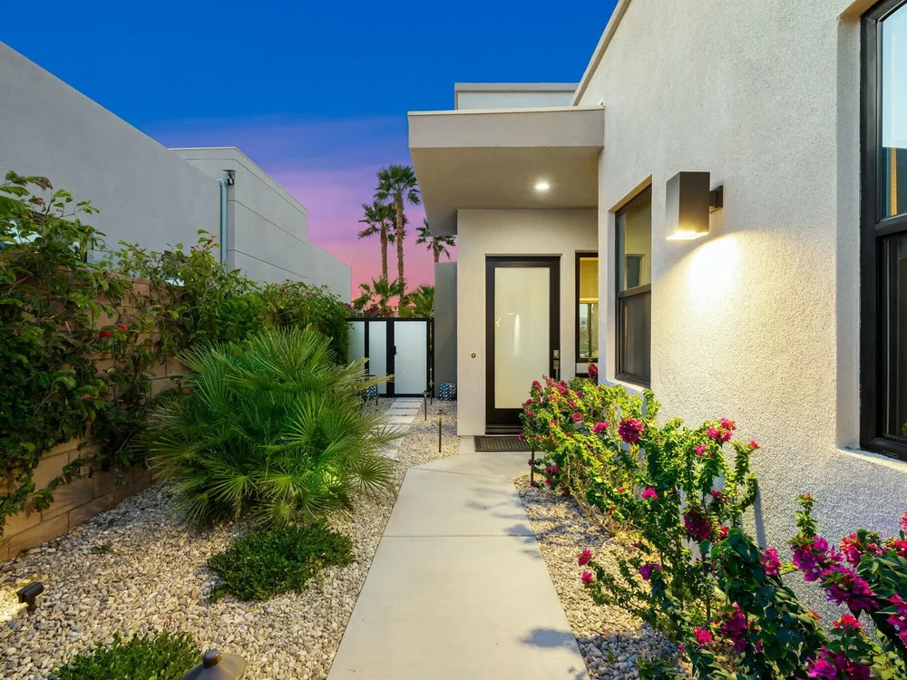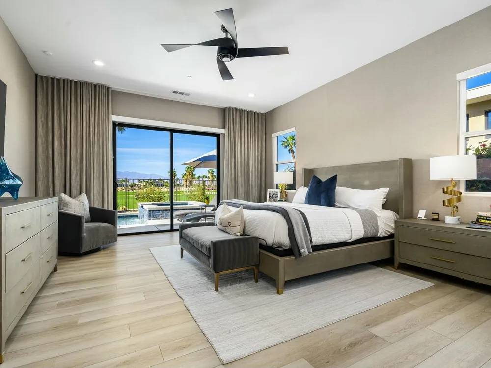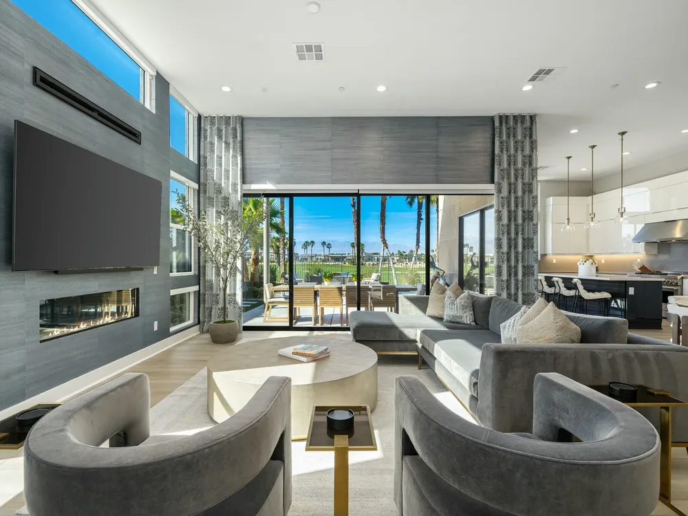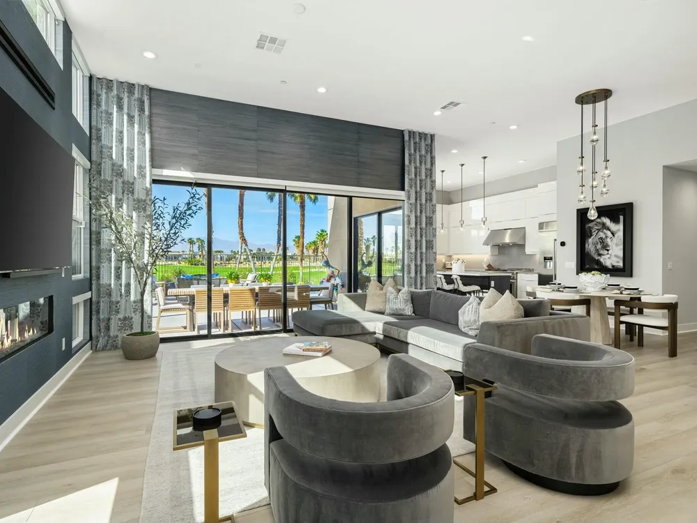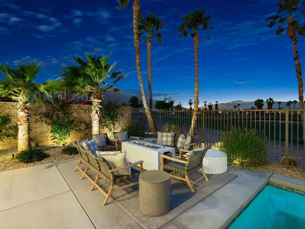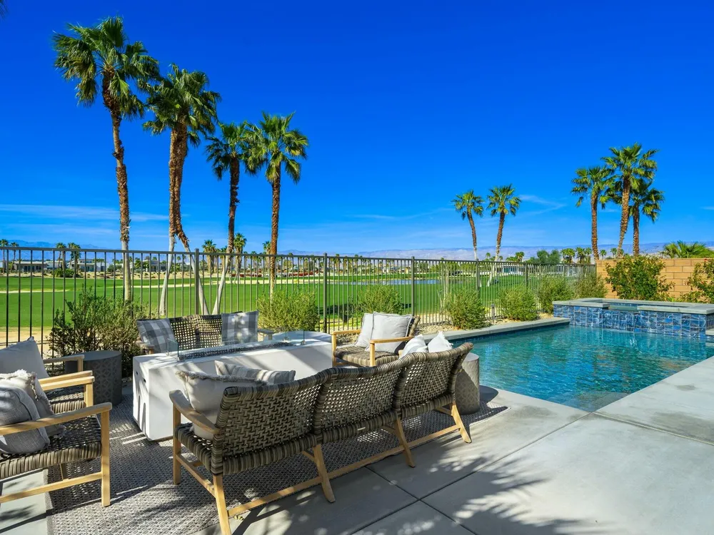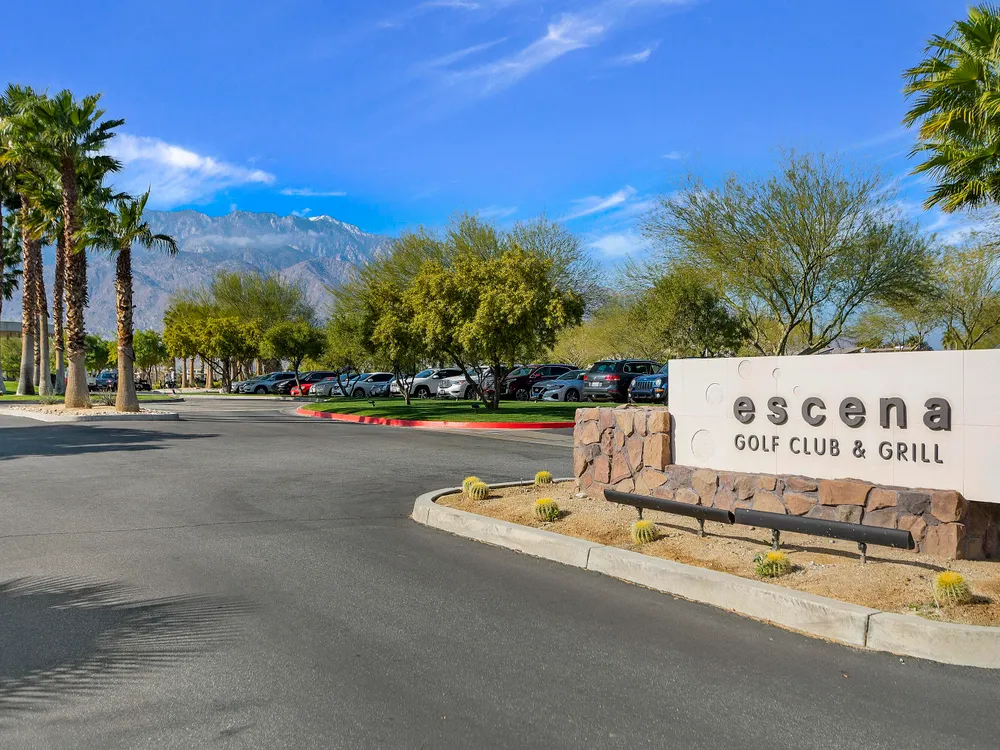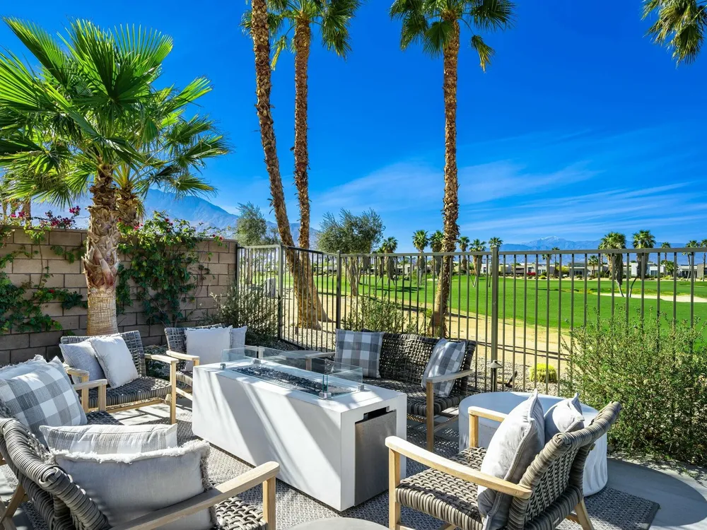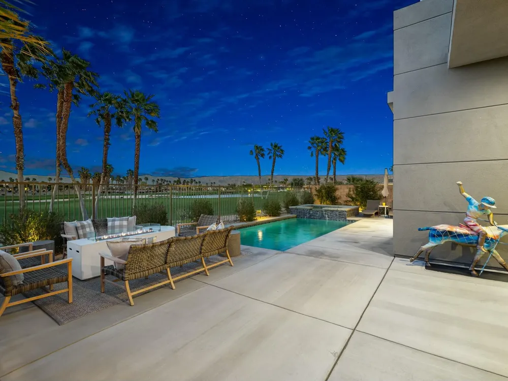 This one-of-a-kind Fig & Nash designed modern home with gorgeous mountain views is in the gated community of Escena! Built in 2023, this 3-bedroom, plus office, 4-bathroom home offers 2,598 sq. ft. of luxurious living space. Situated on a double fairway of the acclaimed Escena Golf Course, the property boasts phenomenal panoramic 180 degree western and northern mountain views. With over $300K in builder and owner upgrades, the home features 12 ft. ceilings, clerestory windows, designer light fixtures and beautiful custom wallpaper. The gourmet Chef's kitchen with a Quartz island, extended cabinetry and a walk-in pantry, features Jenn Air appliances that include a double oven, dishwasher, microwave & refrigerator. Enjoy an open floor plan, luxury vinyl tile (mimicking a hardwood floor look) throughout, a great room with fireplace, wet bar with sink & wine refrigerator, and stackable sliding doors leading out to a beautiful, covered patio and back yard. The gorgeous primary suite has custom vanities & cabinetry, large soaking tub, quartz counters and sliding door access to the pool and spa. The two guest bedrooms, both with well-appointed ensuite bathrooms, are thoughtfully separated from the Primary suite. The outdoor space is an entertainer's dream featuring a covered patio for dining, salt-water, PebbleTec pool with tiled raised spa, and a lovely seating area with firepit to enjoy the gorgeous panoramic mountain views. Additional highlights include motorized blinds throughout, a powder room, laundry room with a sink & cabinetry, 2-car garage with epoxy floor & owned solar. Experience luxury, modern convenience, and spectacular views in this warm and inviting Palm Springs home!