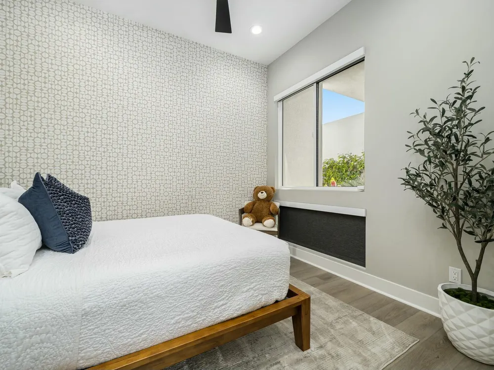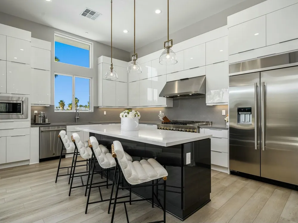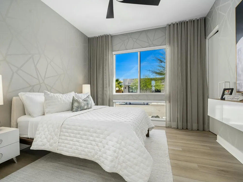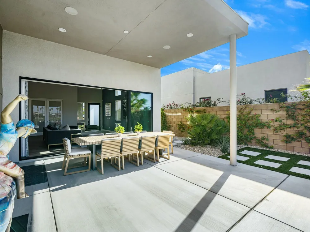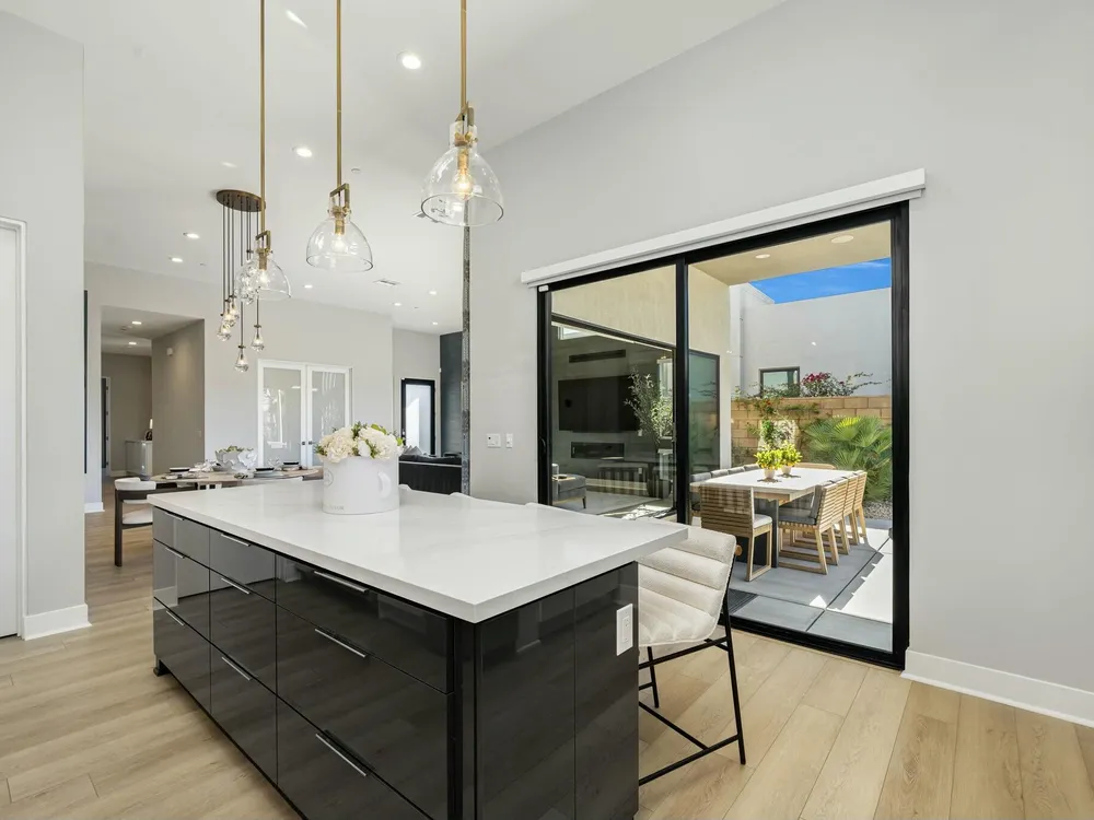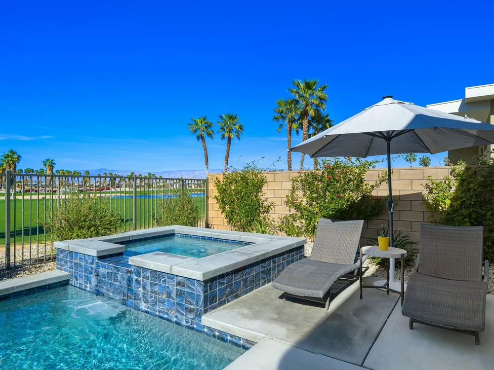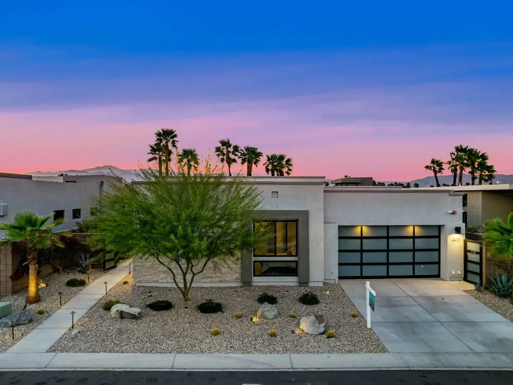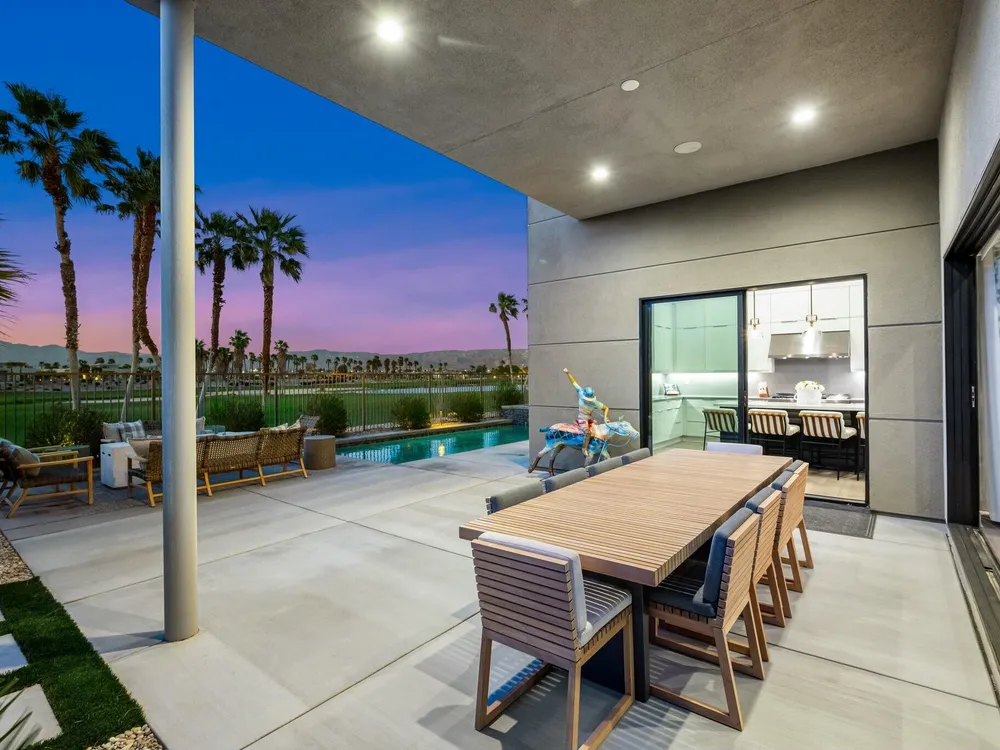 This one-of-a-kind Fig & Nash designed modern home with gorgeous mountain views is in the gated community of Escena! Built in 2023, this 3-bedroom, plus office, 4-bathroom home offers 2,598 sq. ft. of luxurious living space. Situated on a double fairway of the acclaimed Escena Golf Course, the property boasts phenomenal panoramic 180 degree western and northern mountain views. With over $300K in builder and owner upgrades, the home features 12 ft. ceilings, clerestory windows, designer light fixtures and beautiful custom wallpaper. The gourmet Chef's kitchen with a Quartz island, extended cabinetry and a walk-in pantry, features Jenn Air appliances that include a double oven, dishwasher, microwave & refrigerator. Enjoy an open floor plan, luxury vinyl tile (mimicking a hardwood floor look) throughout, a great room with fireplace, wet bar with sink & wine refrigerator, and stackable sliding doors leading out to a beautiful, covered patio and back yard. The gorgeous primary suite has custom vanities & cabinetry, large soaking tub, quartz counters and sliding door access to the pool and spa. The two guest bedrooms, both with well-appointed ensuite bathrooms, are thoughtfully separated from the Primary suite. The outdoor space is an entertainer's dream featuring a covered patio for dining, salt-water, PebbleTec pool with tiled raised spa, and a lovely seating area with firepit to enjoy the gorgeous panoramic mountain views. Additional highlights include motorized blinds throughout, a powder room, laundry room with a sink & cabinetry, 2-car garage with epoxy floor & owned solar. Experience luxury, modern convenience, and spectacular views in this warm and inviting Palm Springs home!