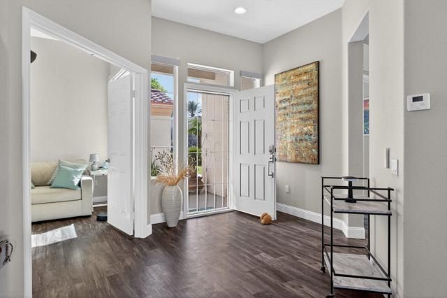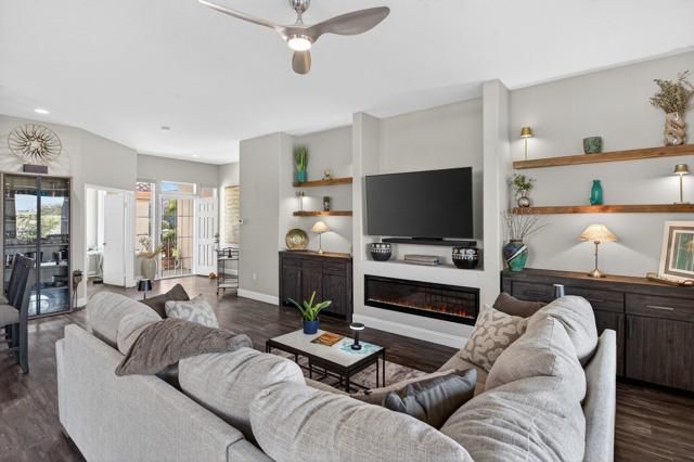 This beautifully updated 1,707 sq. ft. Merion Plan in Heritage Palms Country Club is truly a must-see! Thoughtfully remodeled and meticulously maintained, this home offers the perfect blend of comfort, style, and easy desert living. Step inside to a bright, open, extended great room filled with natural light and anchored by a cozy electric fireplace--perfect for those cool desert evenings. The remodeled chef's kitchen (2023) is the heart of the home, featuring quartz countertops, a custom backsplash, and stainless steel LG appliances. A spacious double-door pantry adds convenience, while the counter seating creates the ideal space for friends and family to gather as you prepare your favorite meals. This popular floor plan offers two bedrooms plus a versatile den. The spacious primary suite showcases elegant beveled ceilings, a large walk-in closet with custom built-ins, and a beautifully remodeled en-suite bath complete with quartz countertops, dual sinks, a shower/tub combination, and a linen closet. Guests will appreciate their own private retreat with built-in closet storage and easy access to the updated guest bath featuring a walk-in shower and quartz countertops. The den, highlighted by double entry doors, provides flexible space for a third bedroom, home office, craft room, or cozy reading retreat. The laundry room includes a utility sink and direct access to the garage, which features epoxy flooring and additional space for a golf cart. Additional upgrades include newer dual-pane windows, laminate flooring, plantation shutters in master bedroom, ceiling fans, a new water heater installed in 2024. Step outside to a beautifully landscaped backyard with artificial turf for low-maintenance enjoyment, along with a fully landscaped front yard. Ideally located close to the clubhouse, this home offers both privacy and convenience. As a resident of Heritage Palms Country Club, you'll enjoy resort-style amenities including an 18-hole championship golf course, fitness center, indoor and outdoor pools, tennis and pickleball courts, an active clubhouse, and a vibrant social calendar. Resort living starts here--don't miss the opportunity to make this exceptional home your own! 🏡🌴