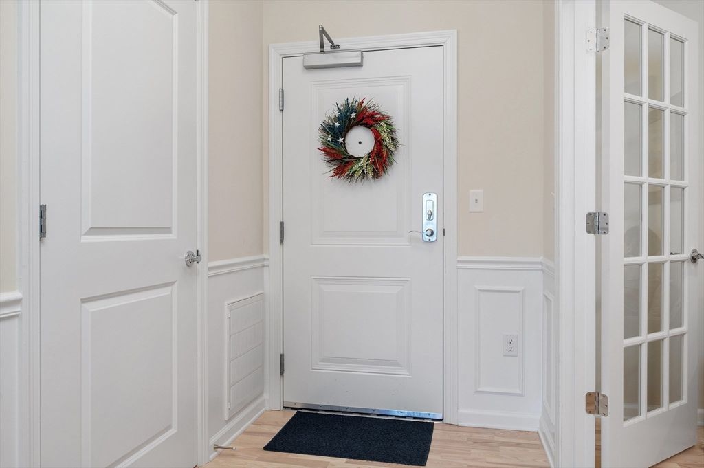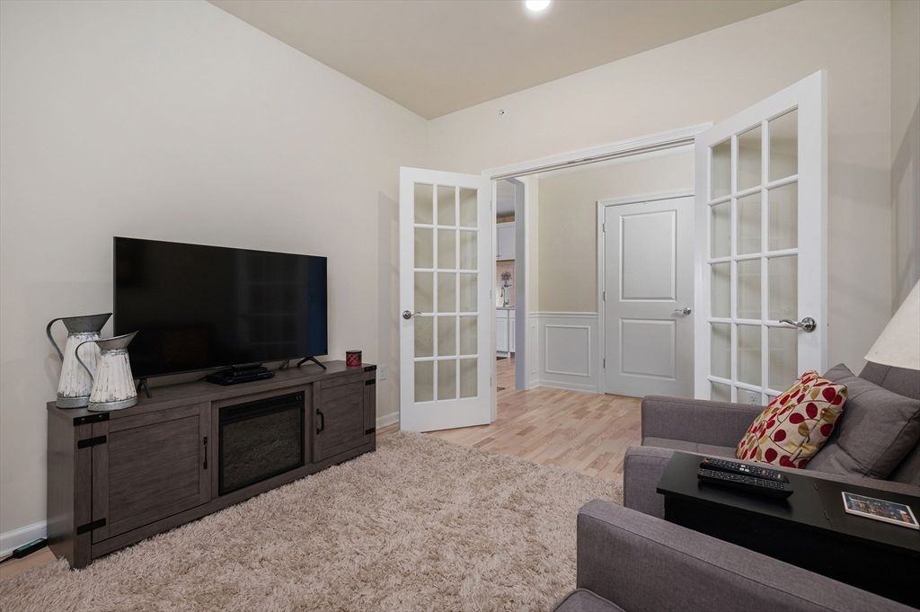 Enjoy easy living in this stunning 1-bedroom + bonus room condo located in the sought-after Chauncy Lake 55+ community by Del Webb. This open-concept unit features white oak wood flooring throughout the main living area, combining elegance and function in every detail. The kitchen boasts quartz countertops, soft-close cabinets with crown molding, a beautiful tile backsplash, stainless steel appliances, recessed lighting, and a center island — perfect for entertaining. The living room opens to a private balcony with scenic views, ideal for relaxing or hosting guests. The spacious primary bedroom includes a charming bay window, and a walk-in closet. A versatile bonus room with French doors provides flexibility for a home office or guest room. Additional highlights include a dedicated laundry room with washer & dryer a storage space. Enjoy full access to Del Webb’s resort-style amenities, including a heated pool, fitness center, tennis, pickle ball & Bocce Ball
