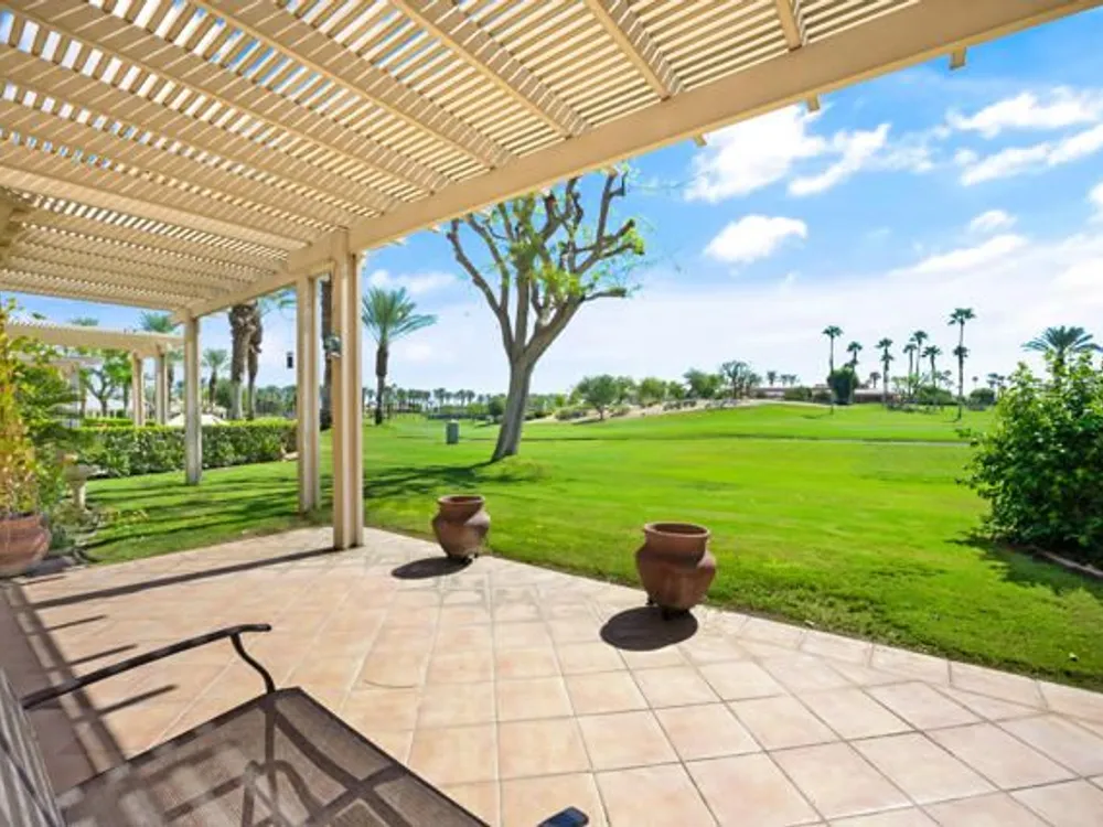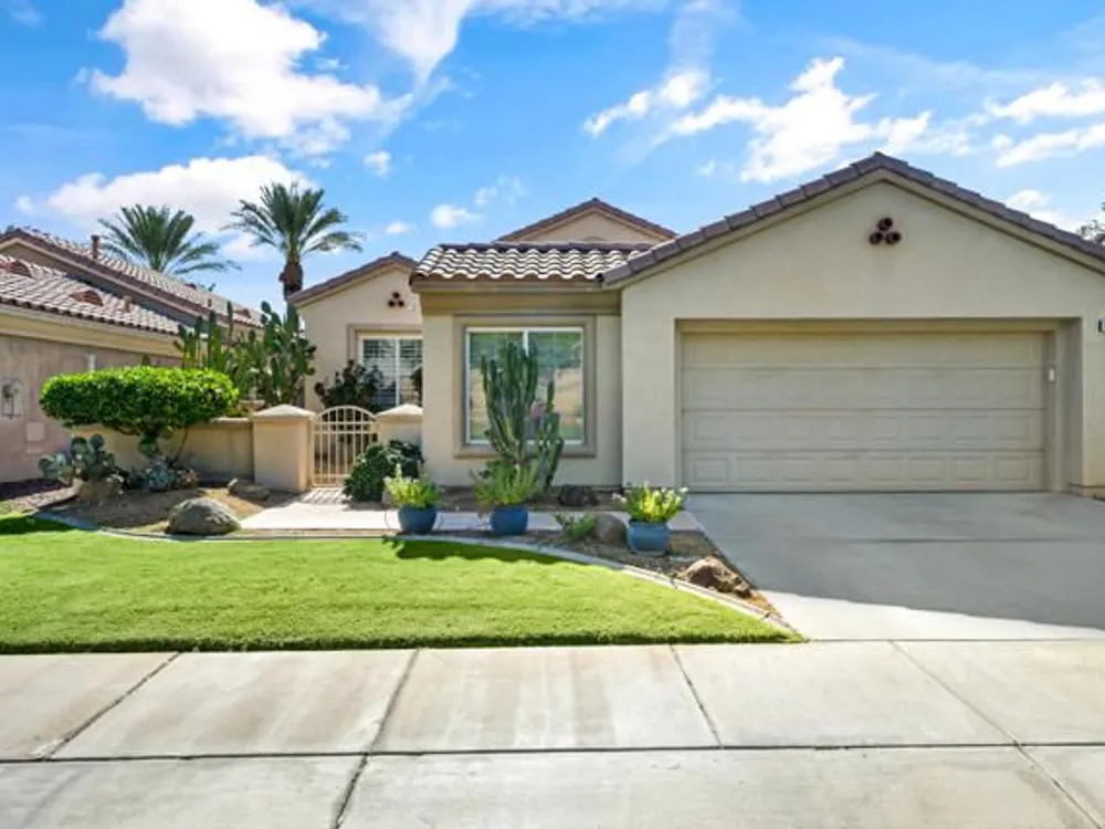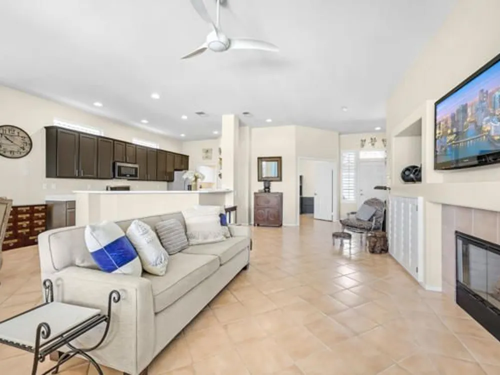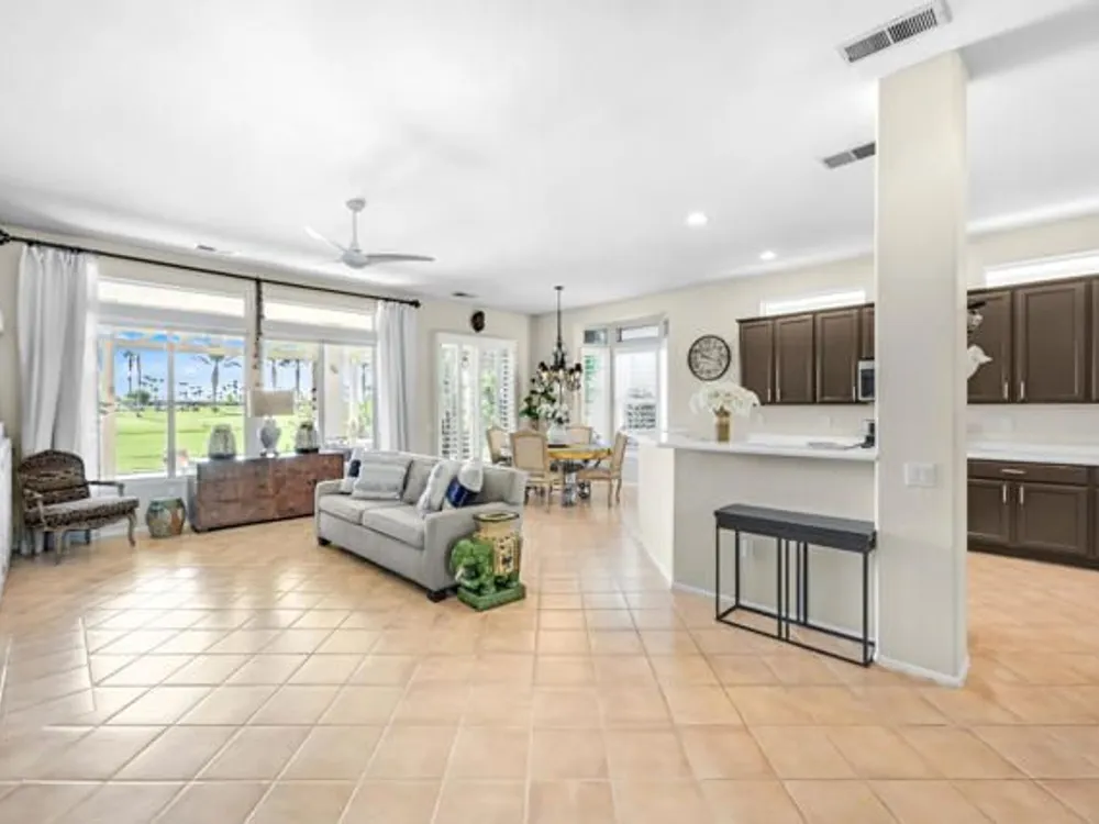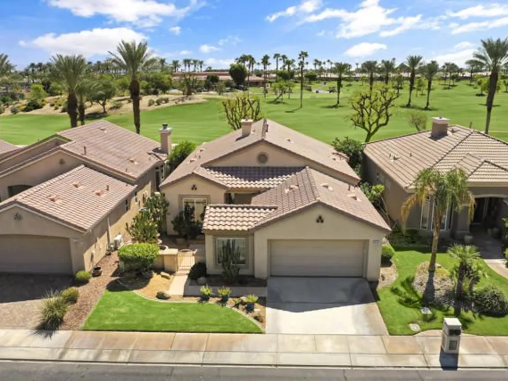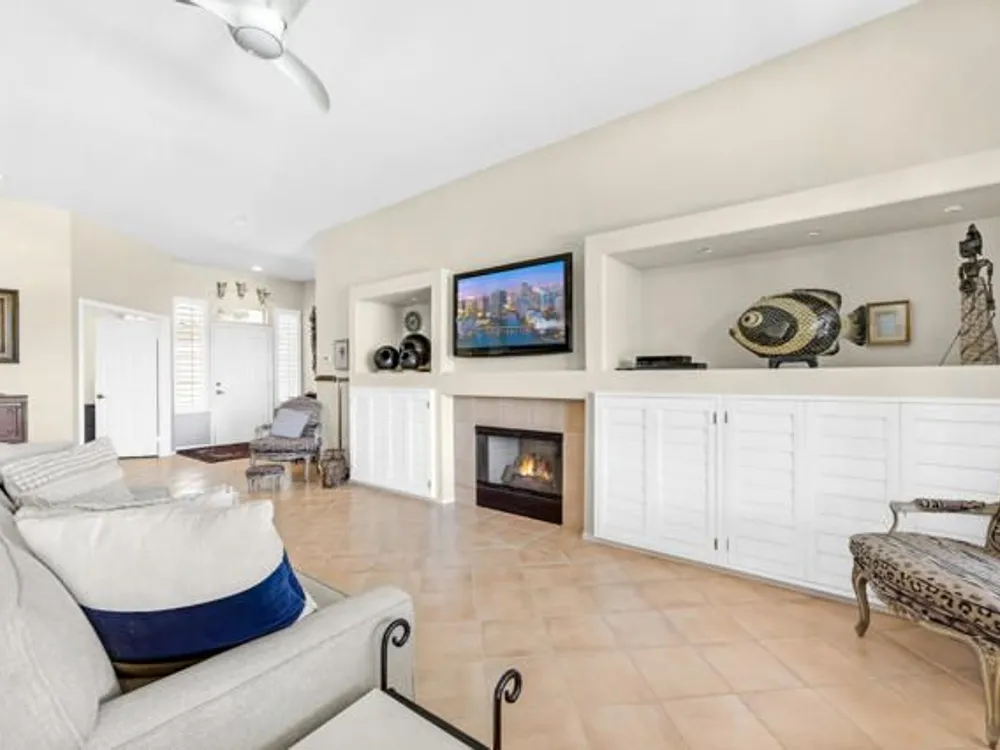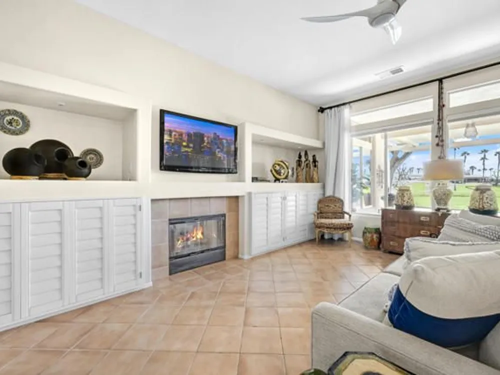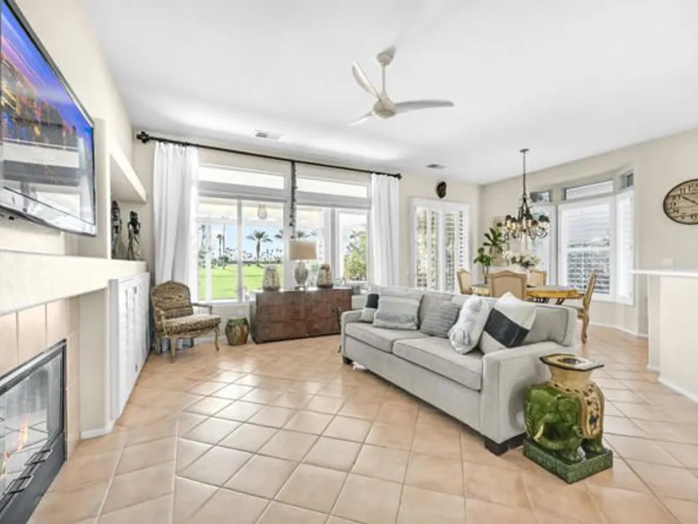 Welcome to Heritage Palms, a premier 55+ gated golf course community in the Coachella Valley. This beautifully maintained single-story home offers 1,707 sq. ft. of living space with tile flooring throughout and a prime golf course setting on Hole #2 of the 18-hole championship course. Inside, you'll find a spacious living/dining room combo with a cozy fireplace, a versatile den, and plantation shutters. The kitchen features stainless steel appliances, a walk-in pantry, a breakfast counter bar, and ample cabinetry. The primary suite is highlighted by a large picture window with seating, while the en-suite bath includes dual vanities, a walk-in shower with grab bars and a built-in bench, and a generous walk-in closet. An additional bedroom and bath provide comfortable accommodations for guests. Step outside to a covered patio with tiled flooring, perfect for enjoying sweeping golf course views year-round. As a resident of Heritage Palms, you'll enjoy access to the 18-hole championship golf course, clubhouse, fitness center, indoor and outdoor pools, tennis and pickleball courts.