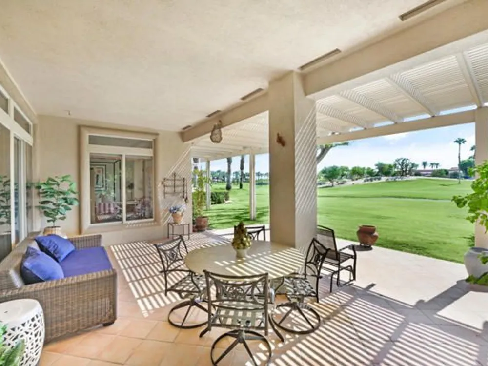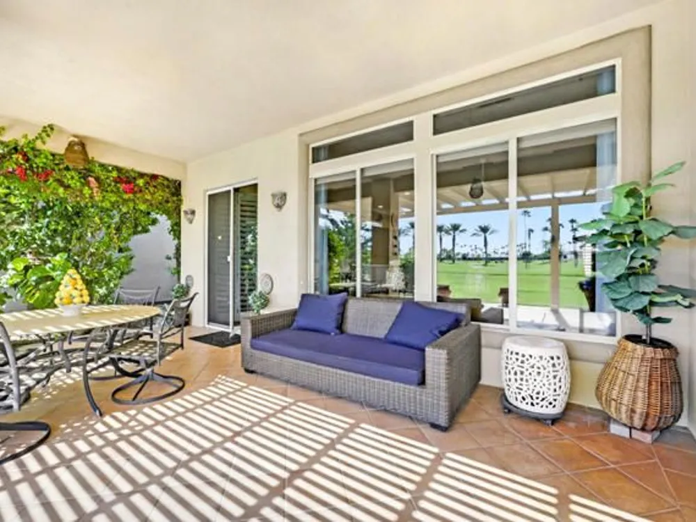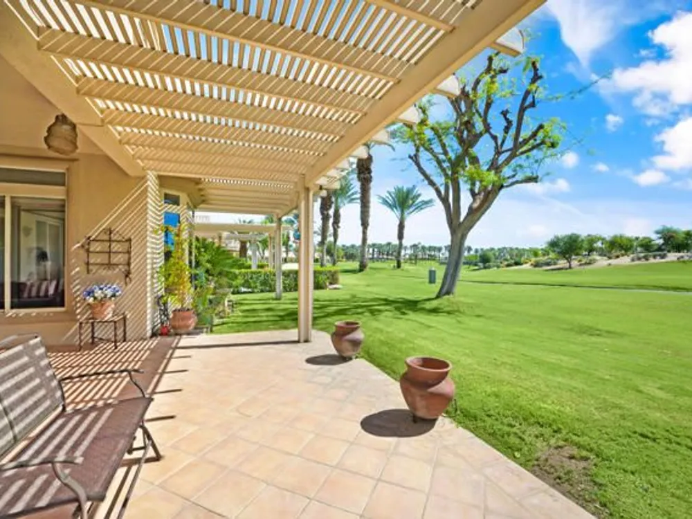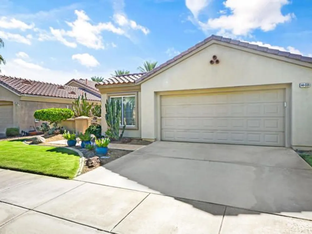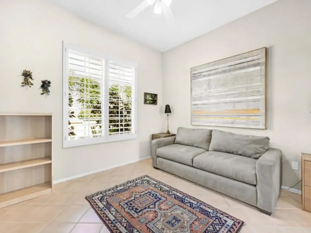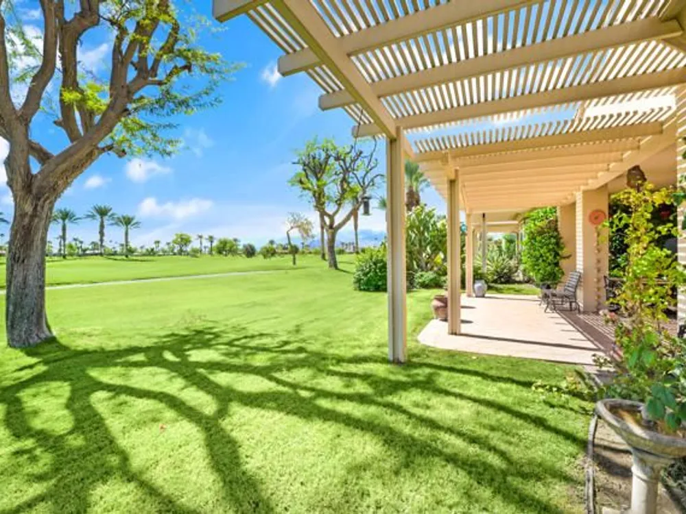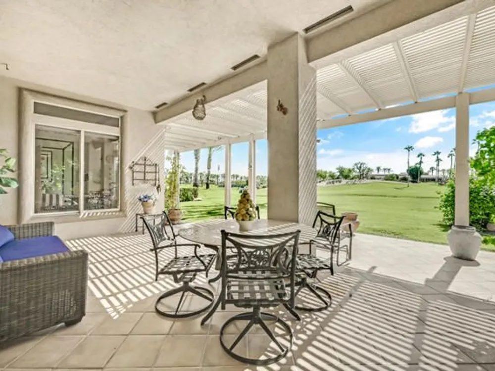 Welcome to Heritage Palms, a premier 55+ gated golf course community in the Coachella Valley. This beautifully maintained single-story home offers 1,707 sq. ft. of living space with tile flooring throughout and a prime golf course setting on Hole #2 of the 18-hole championship course. Inside, you'll find a spacious living/dining room combo with a cozy fireplace, a versatile den, and plantation shutters. The kitchen features stainless steel appliances, a walk-in pantry, a breakfast counter bar, and ample cabinetry. The primary suite is highlighted by a large picture window with seating, while the en-suite bath includes dual vanities, a walk-in shower with grab bars and a built-in bench, and a generous walk-in closet. An additional bedroom and bath provide comfortable accommodations for guests. Step outside to a covered patio with tiled flooring, perfect for enjoying sweeping golf course views year-round. As a resident of Heritage Palms, you'll enjoy access to the 18-hole championship golf course, clubhouse, fitness center, indoor and outdoor pools, tennis and pickleball courts.