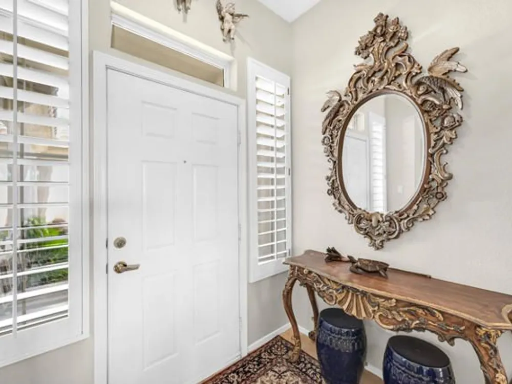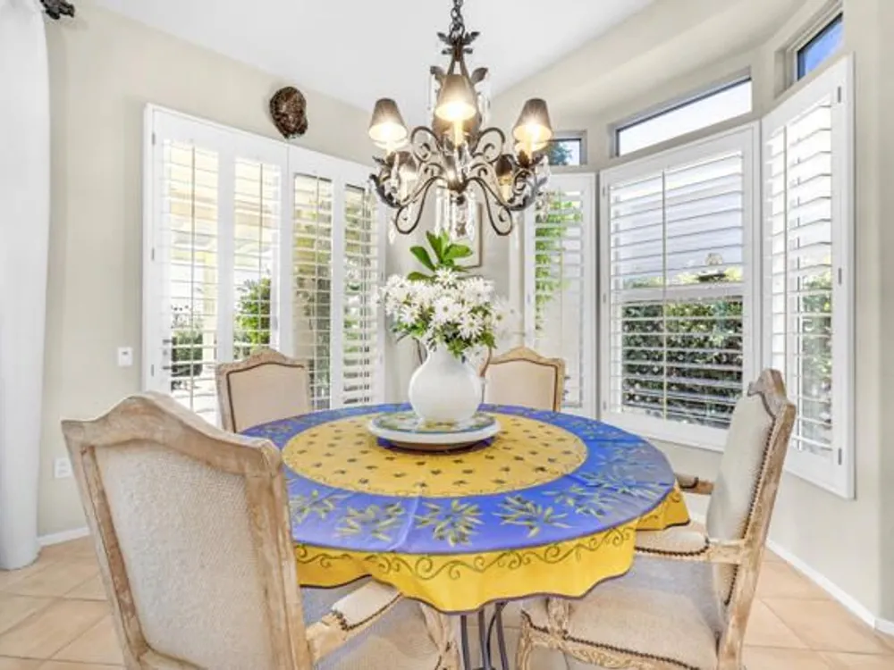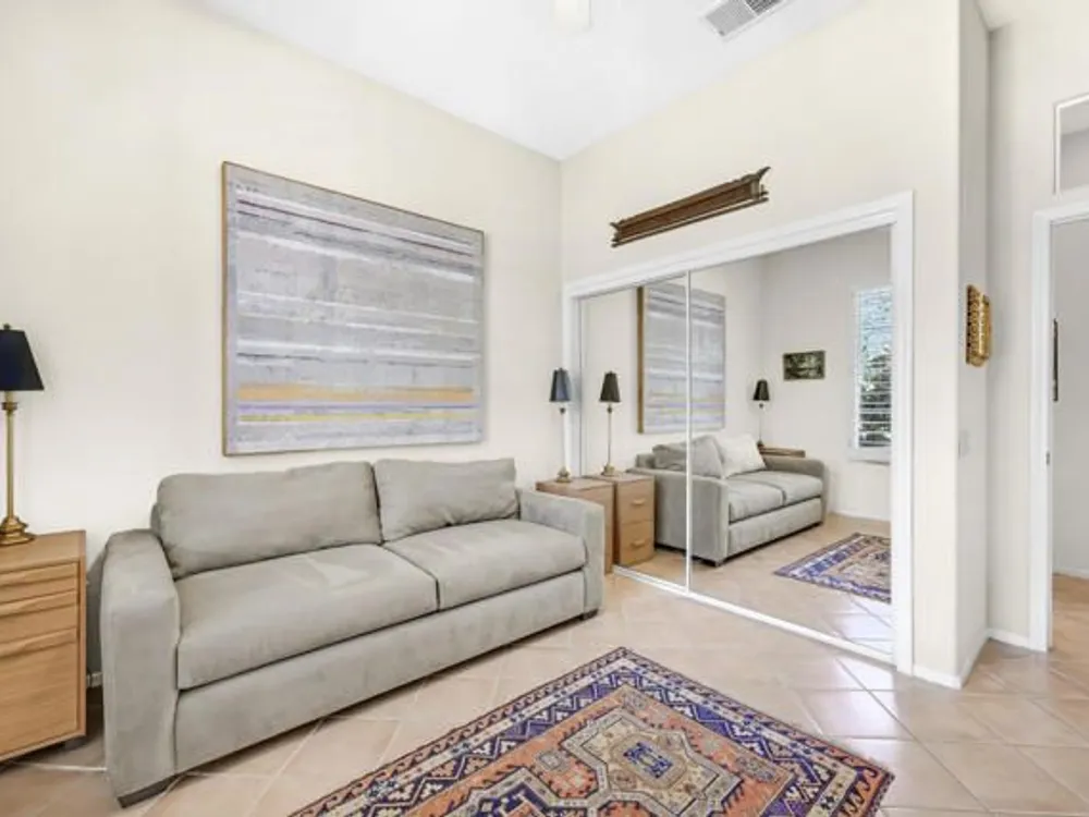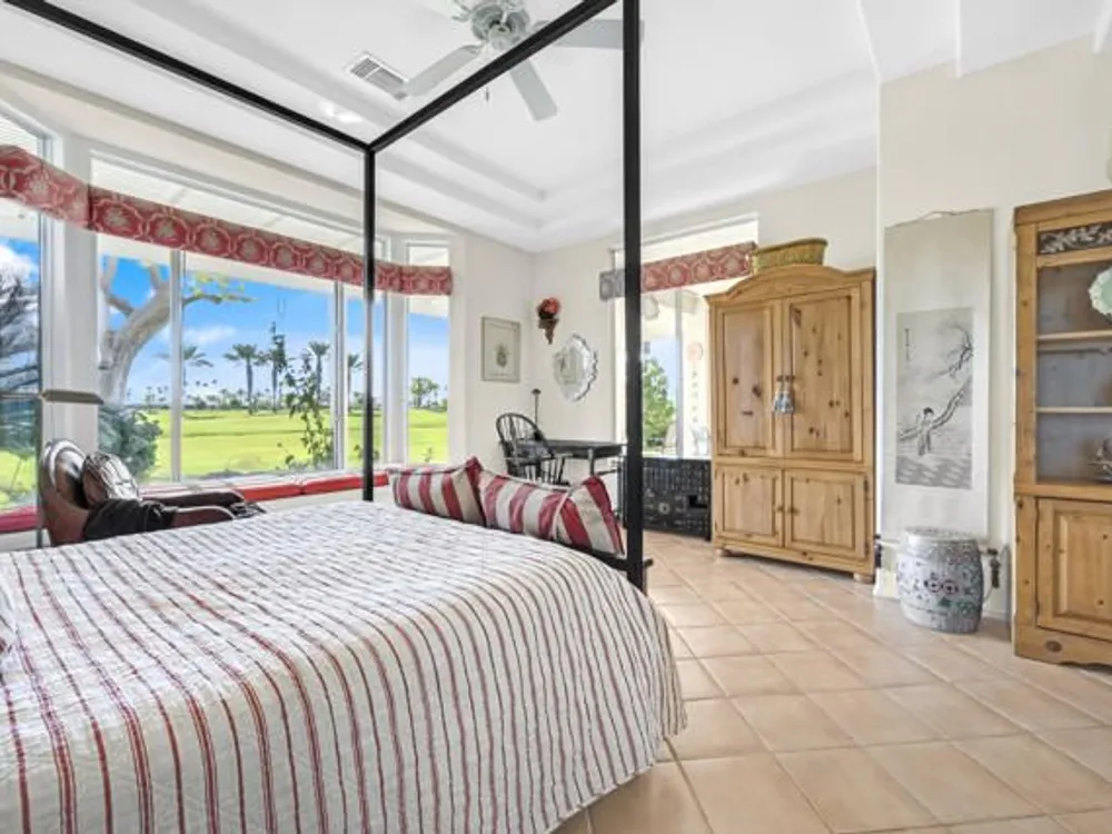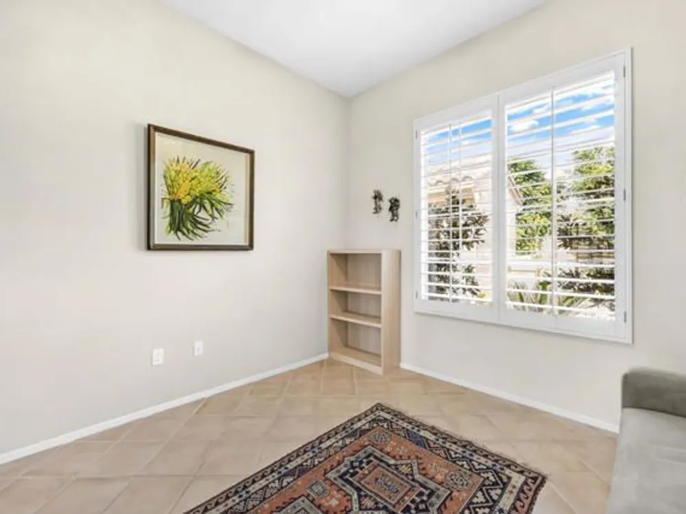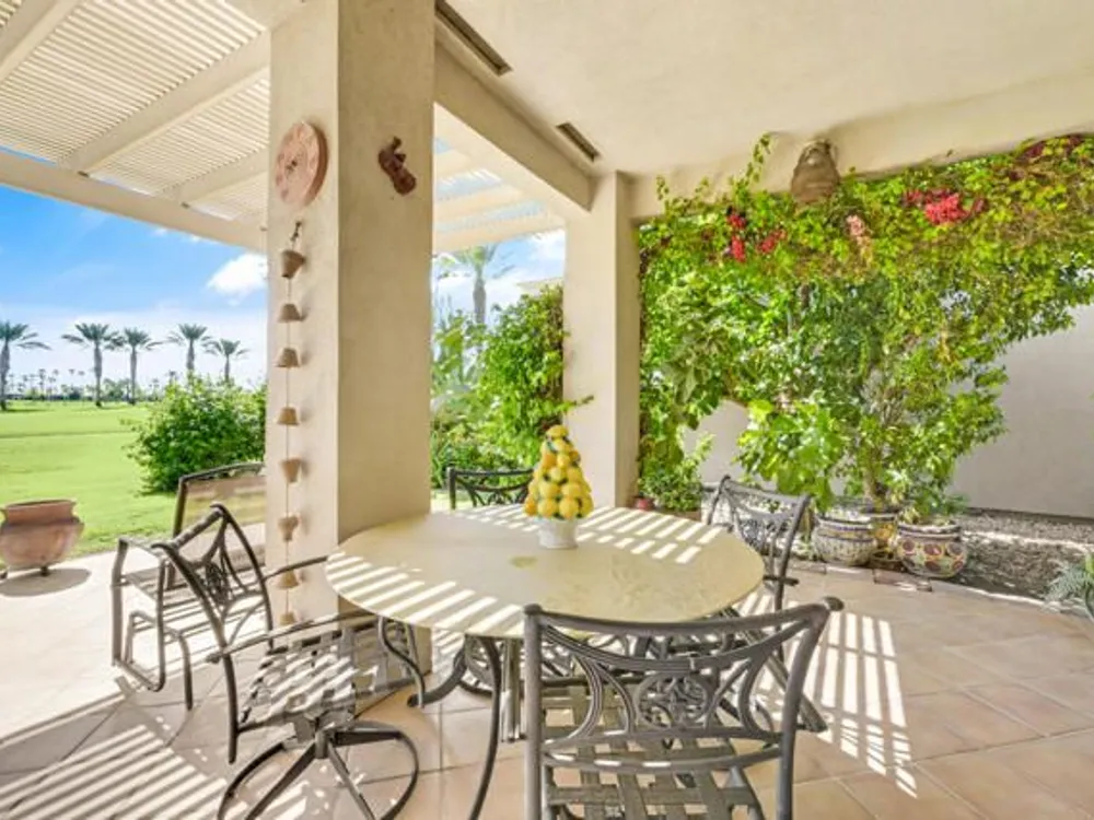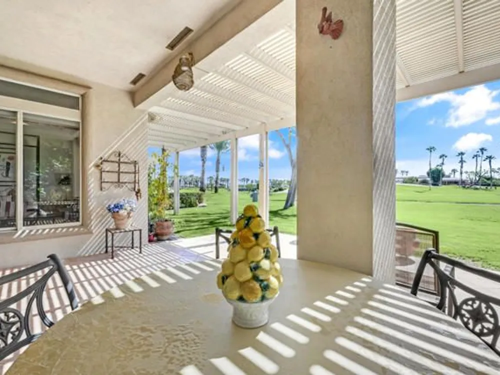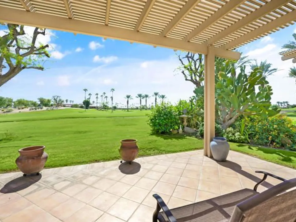 Welcome to Heritage Palms, a premier 55+ gated golf course community in the Coachella Valley. This beautifully maintained single-story home offers 1,707 sq. ft. of living space with tile flooring throughout and a prime golf course setting on Hole #2 of the 18-hole championship course. Inside, you'll find a spacious living/dining room combo with a cozy fireplace, a versatile den, and plantation shutters. The kitchen features stainless steel appliances, a walk-in pantry, a breakfast counter bar, and ample cabinetry. The primary suite is highlighted by a large picture window with seating, while the en-suite bath includes dual vanities, a walk-in shower with grab bars and a built-in bench, and a generous walk-in closet. An additional bedroom and bath provide comfortable accommodations for guests. Step outside to a covered patio with tiled flooring, perfect for enjoying sweeping golf course views year-round. As a resident of Heritage Palms, you'll enjoy access to the 18-hole championship golf course, clubhouse, fitness center, indoor and outdoor pools, tennis and pickleball courts.