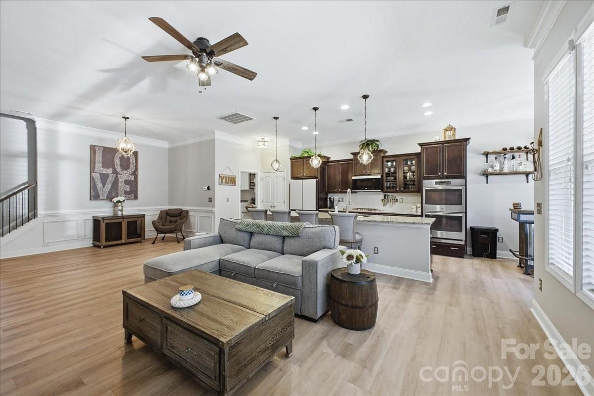 Move in ready home on a private corner lot in The Vineyards, offering resort-style amenities and easy access to Charlotte, the Whitewater center, and the airport. This light-filled home features an open-concept layout, modern upgrades throughout, and a backyard ready for relaxing or entertaining. Recent updates include brand-new LVP flooring, fresh Agreeable Gray paint throughout, and updated light fixtures and ceiling fans across the entire home. The kitchen has been upgraded with new Samsung appliances including refrigerator, dishwasher, and microwave, and features custom built-in shelving behind the bar for added style and storage. The spacious primary suite offers a stylish retreat with a barn door entry into the bathroom. Additional upgrades include improved lighting in the gym and bedrooms, plus added garage ceiling shelving for extra storage. A hot tub hookup is already installed, making the backyard ready for your future outdoor oasis. Situated on a premium corner lot with professional landscaping, this home offers added privacy and great curb appeal. The Vineyards community offers resort-style amenities, including two pools, dog park, private boat ramp, tennis courts, pickleball courts, bocce ball, pavilion and picnic areas, and a brand-new clubhouse coming in 2026. Conveniently located near shopping, dining, the Whitewater Center, Uptown Charlotte, Downtown Belmont, and the airport, this home combines location, lifestyle, and move-in ready convenience. This is a great opportunity to get into one of the area’s most desirable communities — schedule your showing today.