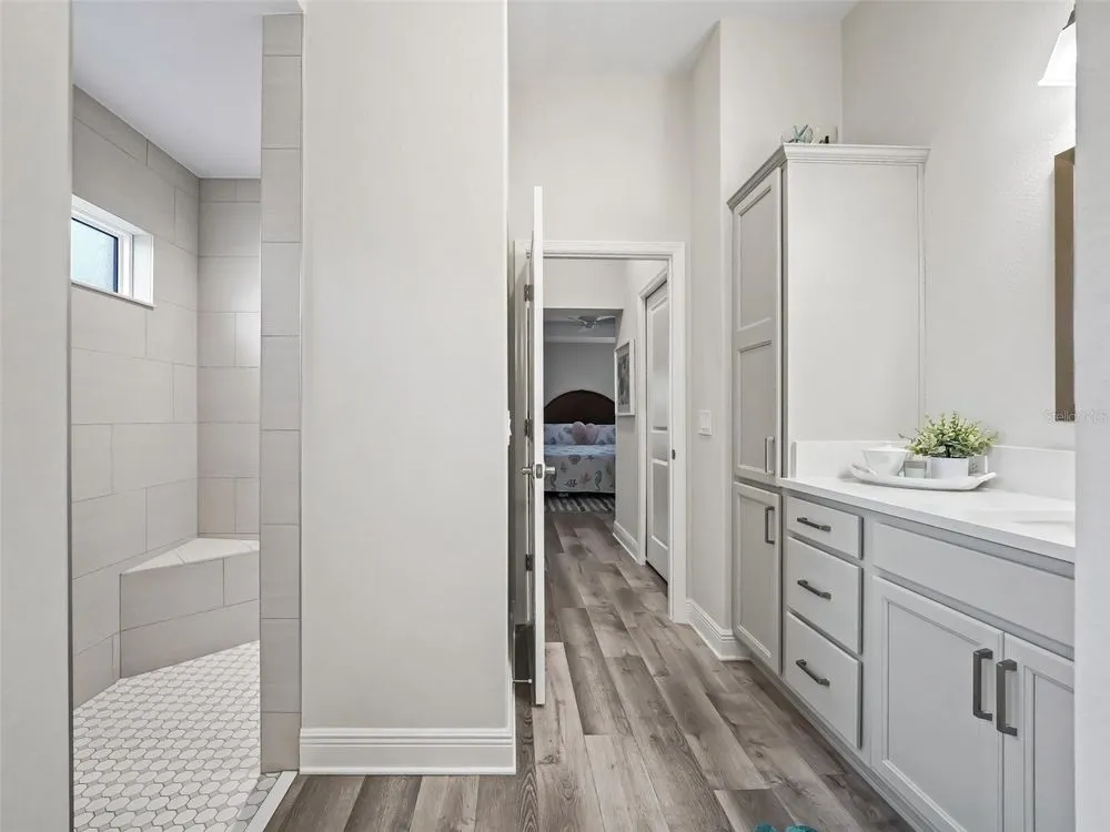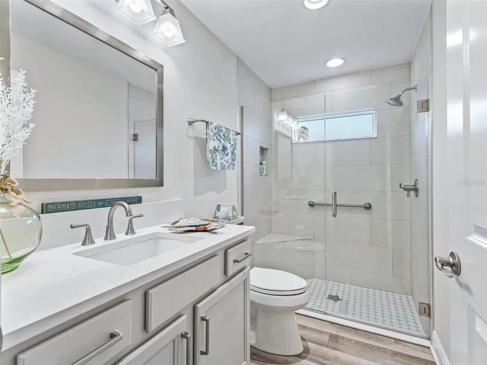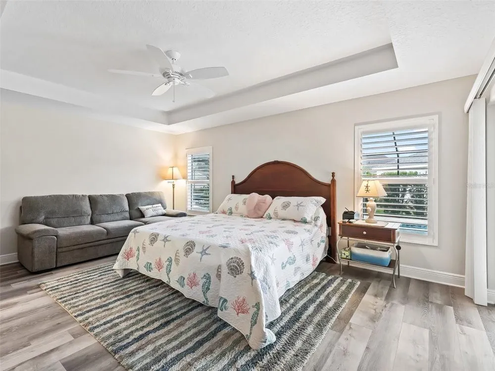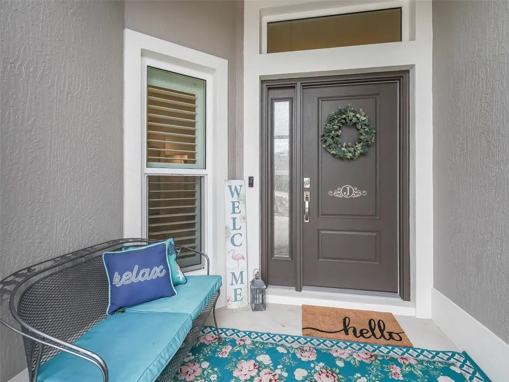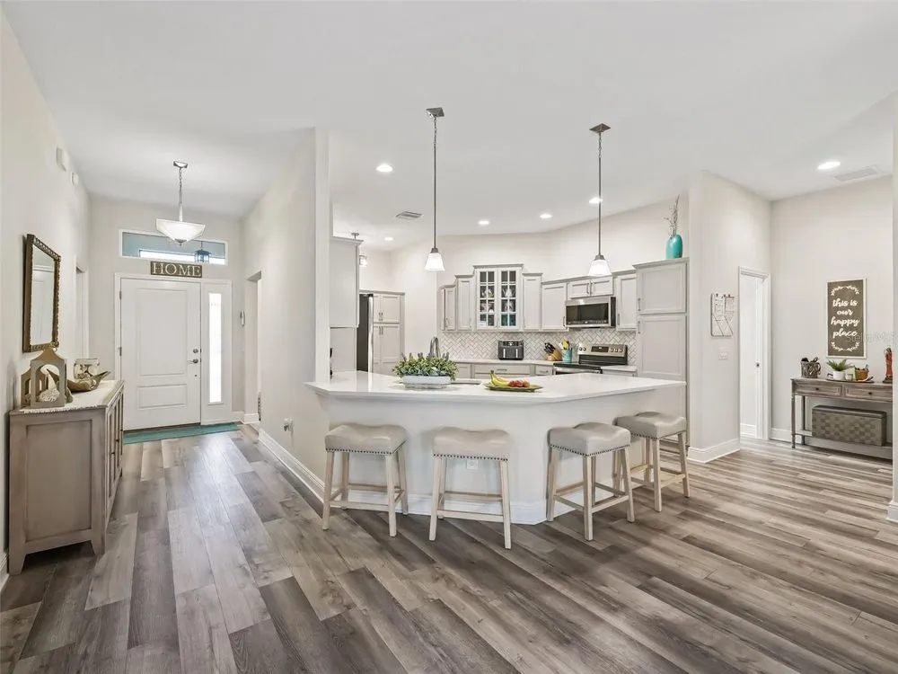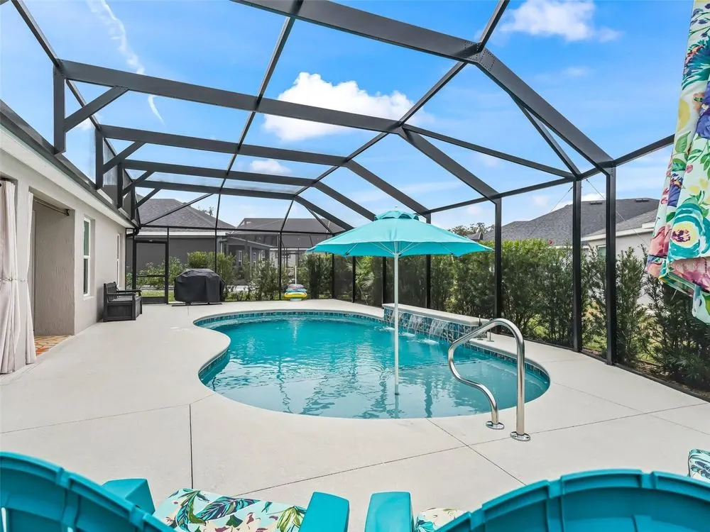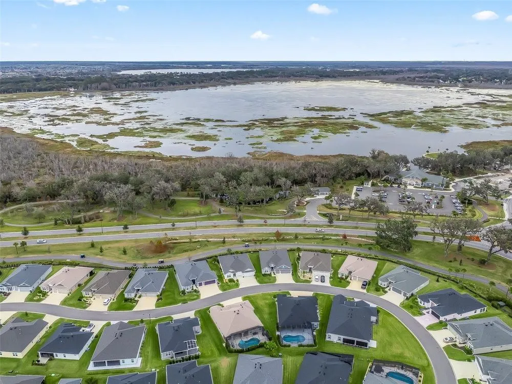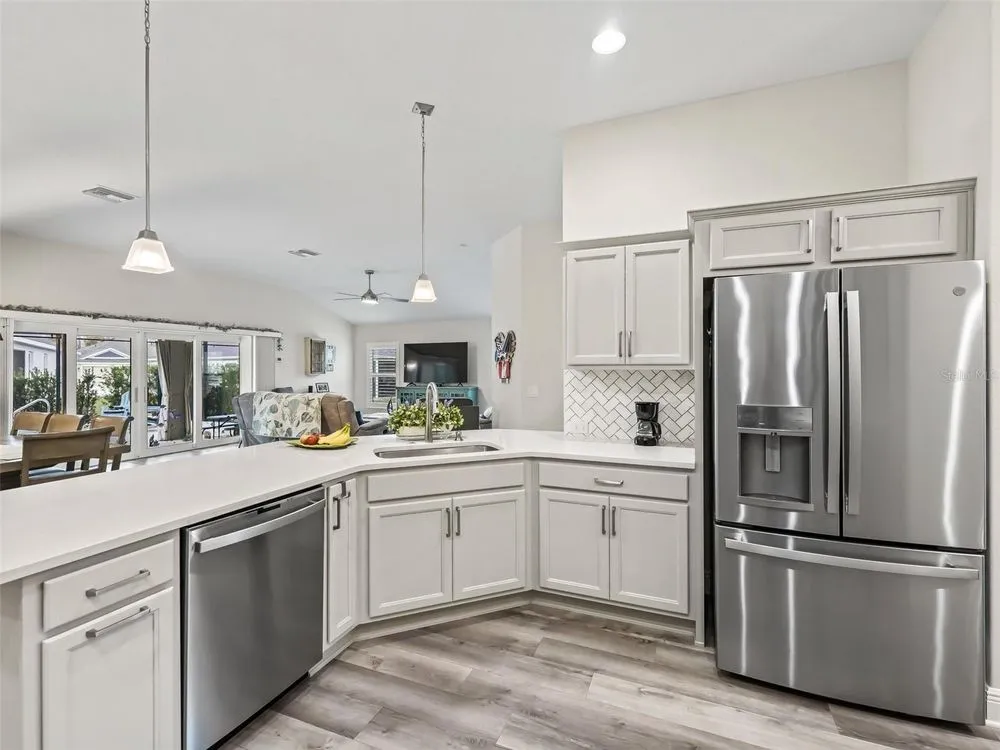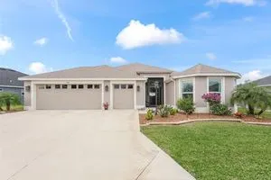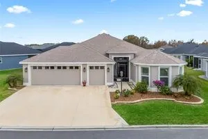 Welcome to this beautifully custom-designed 3-bedroom, 2-bathroom Expanded Begonia POOL Home, located in the desirable Village of Richmond. With over 2,000 square feet of luxurious living space and only 2 1/2 years old, this thoughtfully designed pool home offers both elegance and functionality. As you approach the property you will notice the professional landscaping and custom screened entryway. Step inside to find luxury vinyl plank flooring and plantation shutters on windows. The open floor plan features high ceilings, creating a bright and spacious atmosphere. The heart of the home is the chef’s kitchen, featuring extra cabinets, quartz countertops, a stainless steel sink and appliances, and an open layout overlooking the Dining and Living space making it ideal for entertaining. The primary suite is a true retreat, complete with dual walk-in closets, sliders leading to the lanai/pool, and a spa-like bathroom with quartz countertops, dual sinks, a separate water closet, and a Roman Shower. Guests will enjoy the privacy of their own wing, separated by a pocket door, providing a serene and comfortable space. The front bedroom is enhanced by charming bay windows, perfect for a sitting area with streaming natural light. Disappearing sliders off the living area lead to a private outdoor oasis with a lanai measuring 30x8 and an expanded patio area with a sparkling gas-heated saltwater pool, and being under a birdcage makes it perfect for relaxing or hosting gatherings. An expanded 2-car garage (by 4 feet with an 18-foot garage door) with a golf cart garage is epoxy-coated and provides ample storage for vehicles and hobbies. This home truly embodies the luxury and lifestyle of The Villages. Don’t miss your opportunity to make it yours! Close to Brownwood Paddock Square, recreation centers, shopping, dining, golf/sports, and easy access in and out of the Villages.