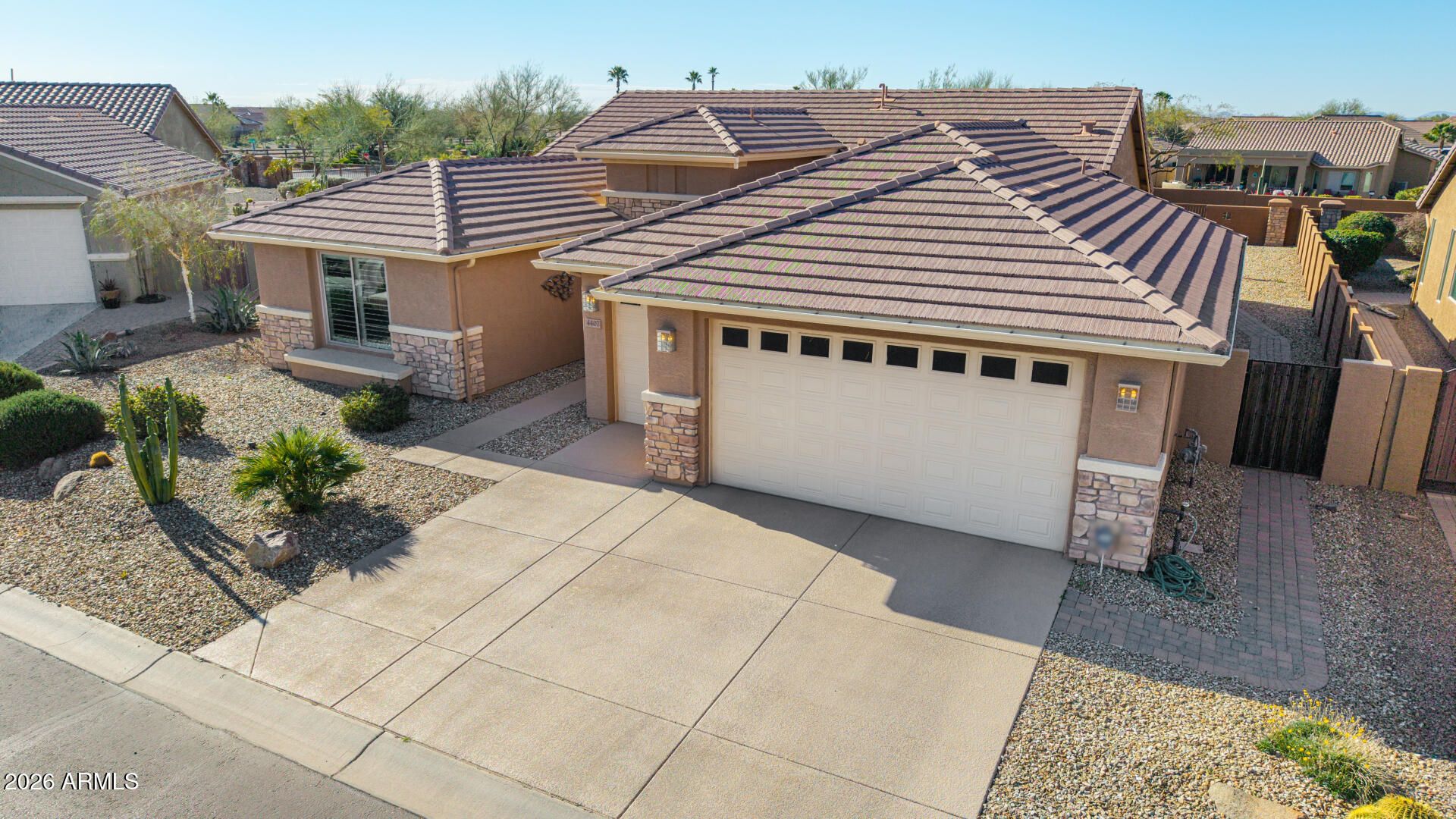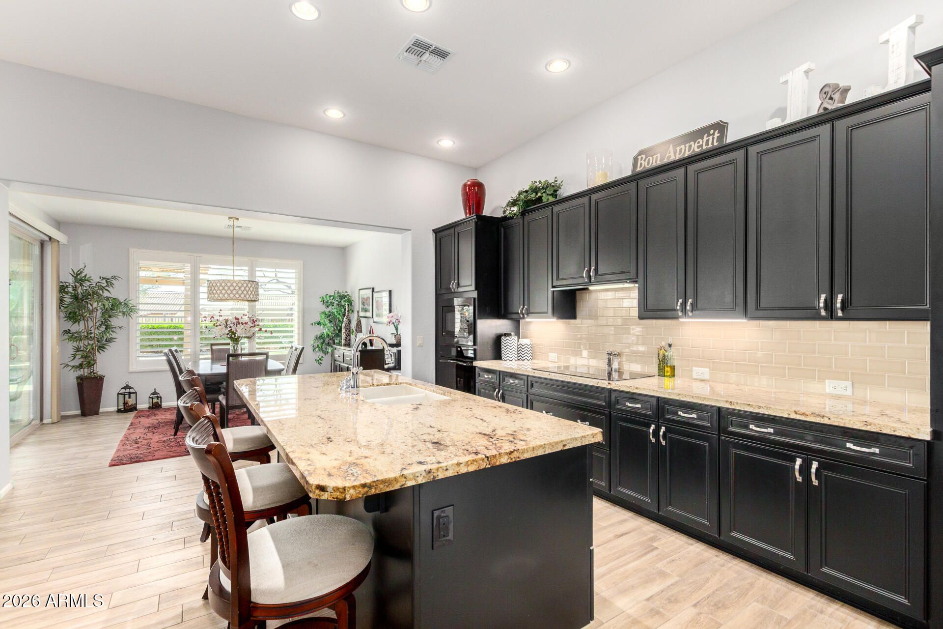 Stunning Merano Model Home with Beautiful 'California' Pool ready to enjoy! 2 Master Suites with 2.5 Bathrooms, Separate Den, Laundry room with sink & Cabs, Washer & Dryer. Gourmet Kitchen has built-in Ovens (M/W & convection combo wall Oven), 42'' Cabinets with Lighting, Granite Counters, one-level Island, roll-out shelves. Newer LG Refrigerator and Pantry. Lovely Dining Room views to Pool & Patio. Grand Living Room with Accent Wall. Primary has Bay Window bump-out, Large Walk-in Closet, Primary Bathroom has upgraded dual vanities, over-mount sinks, framed mirrors. 2nd large Bedroom w/Ensuite. Beautiful wood-look Tile Floors, Shutters. Perfect Garage w/4 ft EXT to both 2 Car and Golf Cart Garage. Enjoy the Covered Patio before jumping into your private Heated POOL under Arizona Sunsets! The PATIO area is open and inviting to enter the Beautiful private heated POOL. Landscaping accents the pool decking and vey private enclosed yard. This is your DREAM come true....See it today!