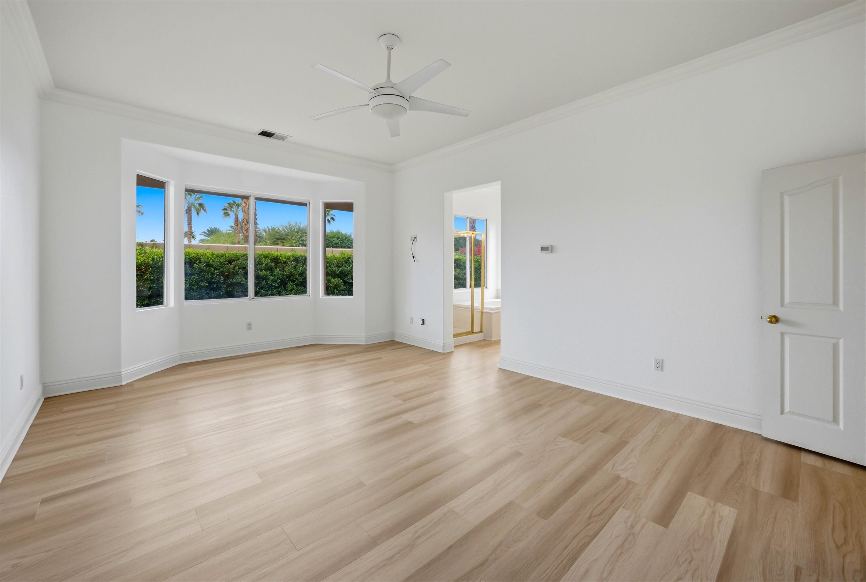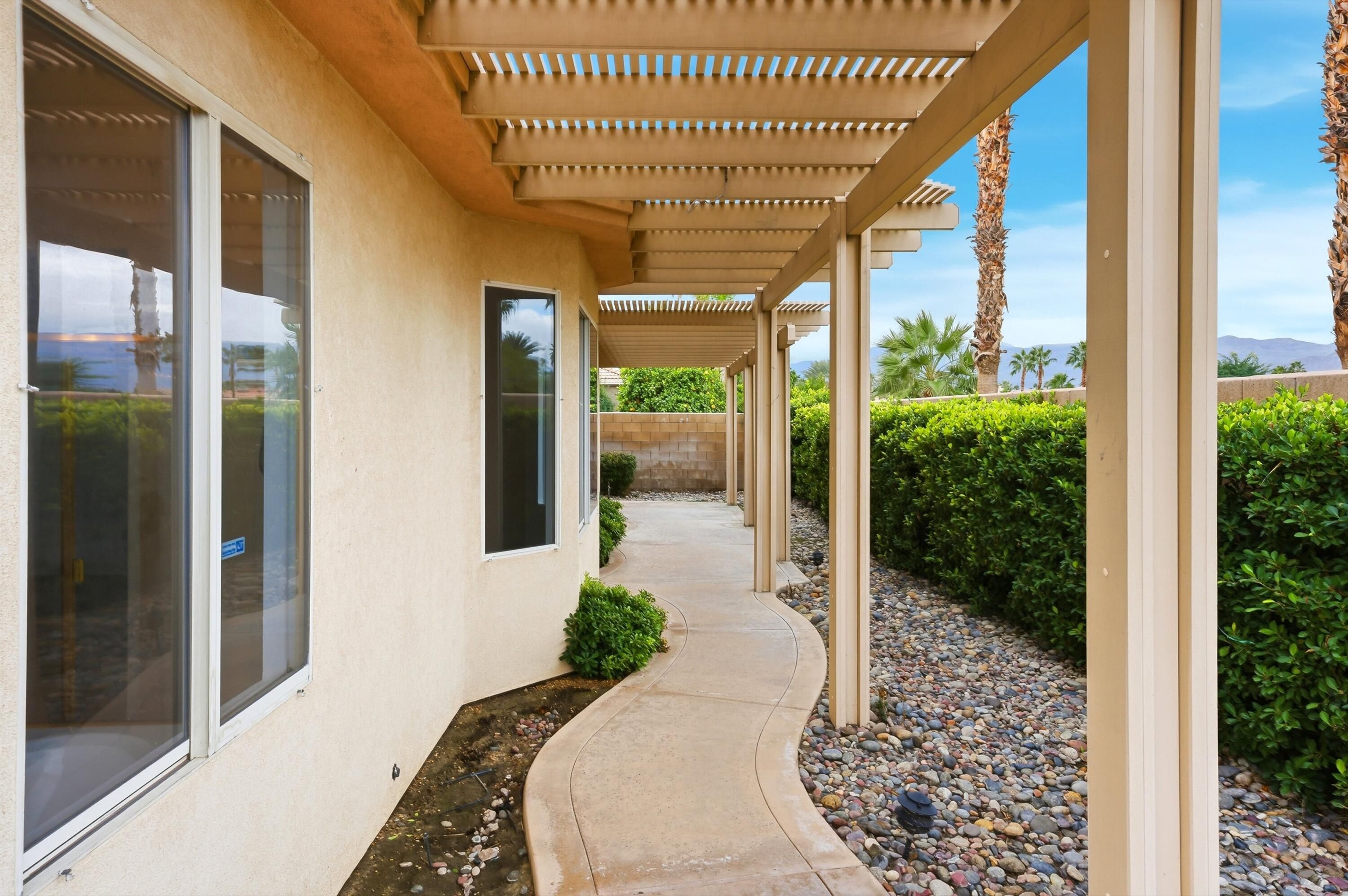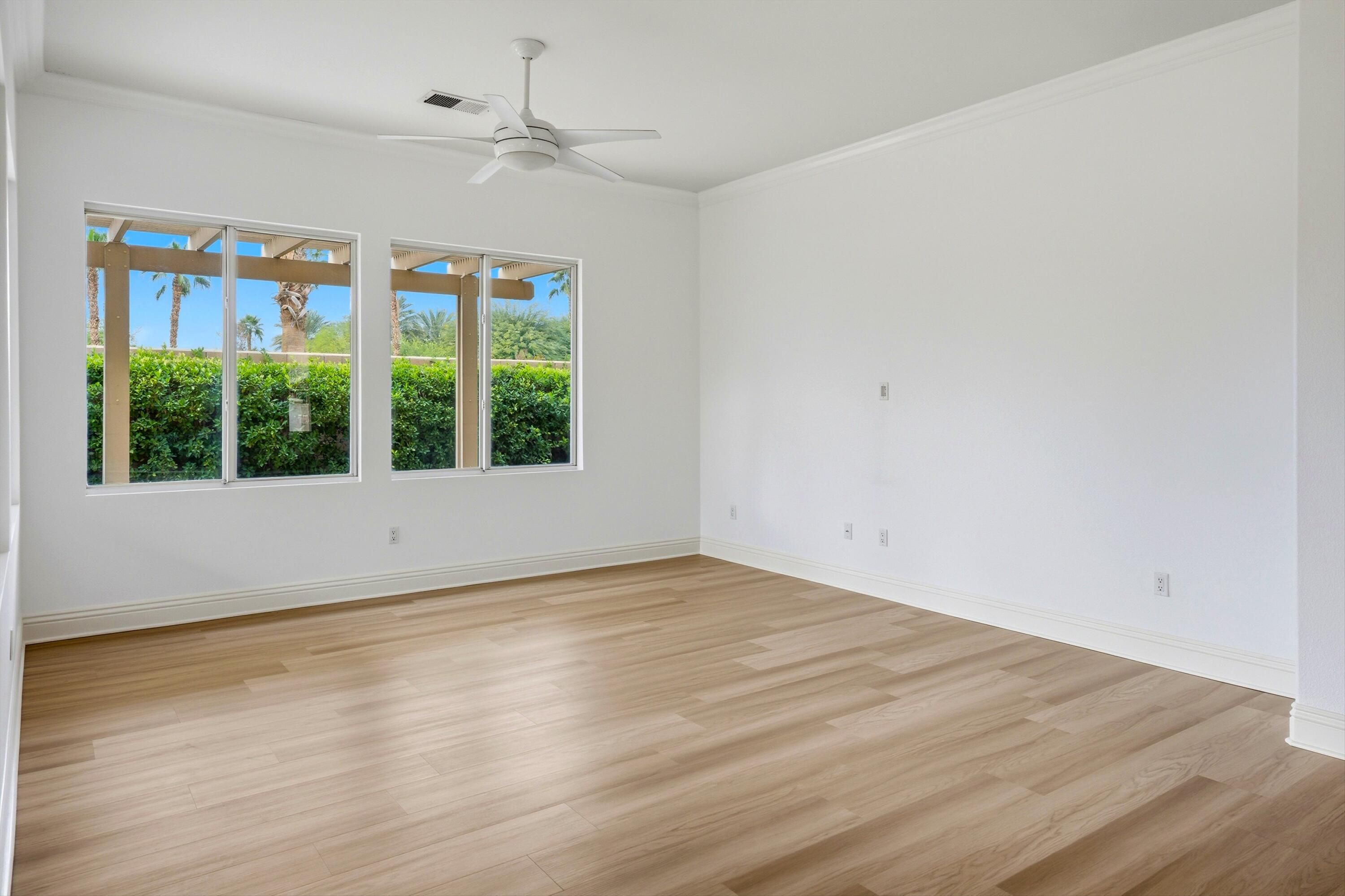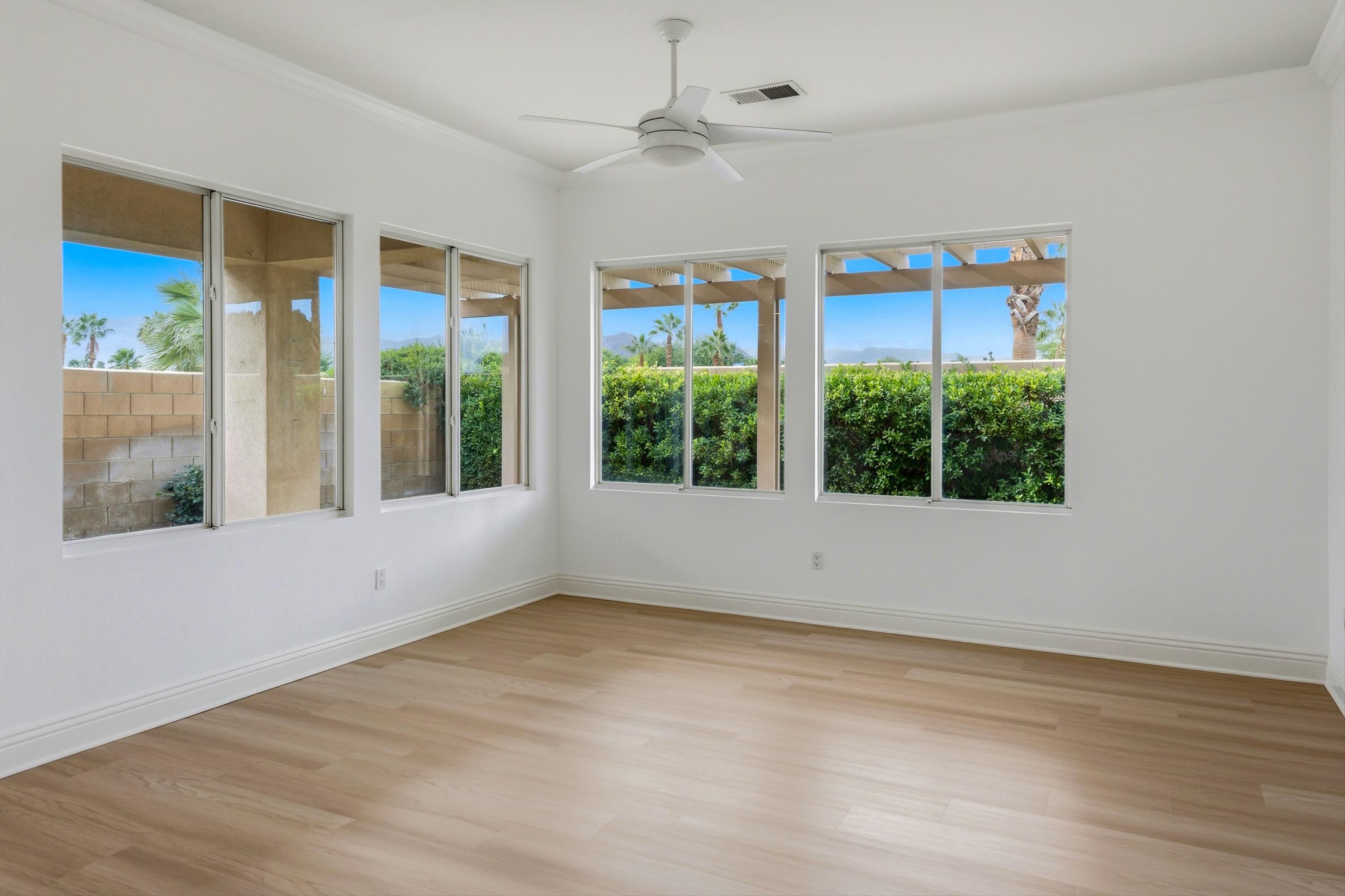 Located in the beautiful Heritage Palms Country Club, a premier 55+ resort-style community, this beautifully maintained 2-bedroom, 2-bath home with a versatile office/den or guest room featuring double doors offers comfort, style, and exceptional desert living. A convenient separate laundry room with washer and dryer opens directly to the attached two-car garage. Spanning 2,052 sq. ft., this spacious residence features an open floor plan enhanced by new luxury vinyl flooring, fresh interior paint, and new baseboards throughout, making it truly move-in ready. Additional highlights include a gas stove, ceiling fans, abundant natural light, thoughtful finishes, and a walk-in shower. The property offers a large, usable entry courtyard and side yard—perfect for relaxing or entertaining—along with beautiful mountain views and a quiet street location. Priced to sell, this home delivers outstanding value and lifestyle. Residents of Heritage Palms enjoy world-class amenities, including an 18-hole championship golf course, indoor and outdoor pools, pickleball and tennis courts, a fully equipped fitness center, grill room and restaurant, card and billiards rooms, and an active calendar of social clubs and events. Cable TV is included in the HOA, with monthly dues of $600. Ideally located just minutes from the Indian Wells Tennis Garden, additional top-rated golf courses, upscale shopping, Costco, grocery stores, and Trader Joe's, this exceptional home offers the perfect desert oasis and a lifestyle worth living. Nice listing. Under 'What's Special': Bonus Room - new interior paint - new luxury vinyl floors - walk in shower and separate tub - open great room - kitchen island- Heritage Palm Amenities Included
