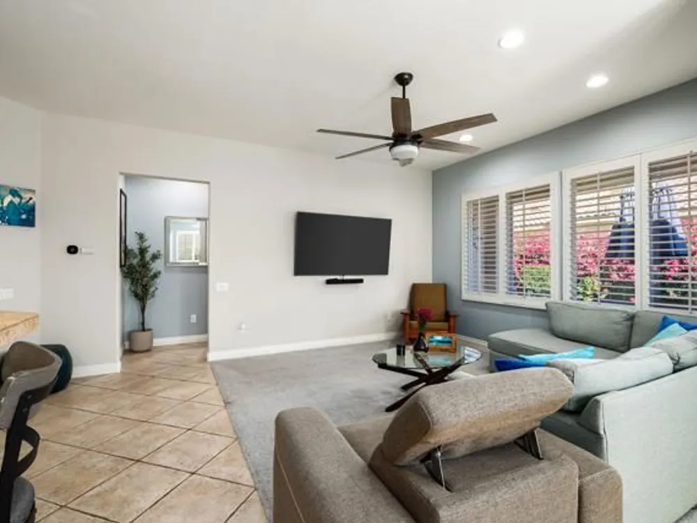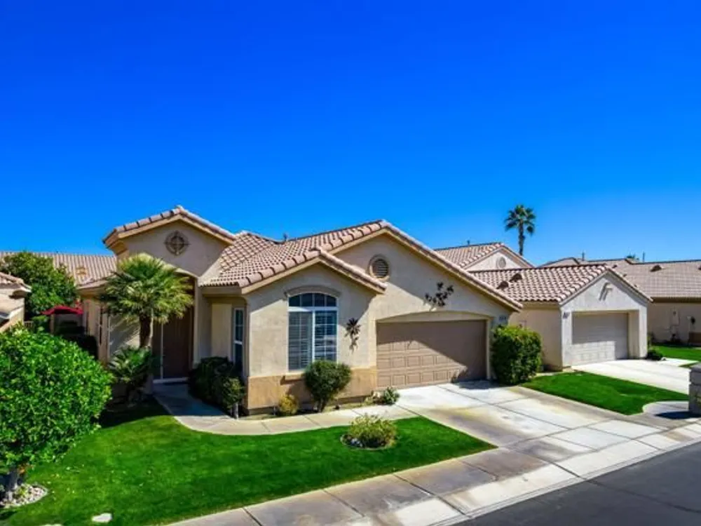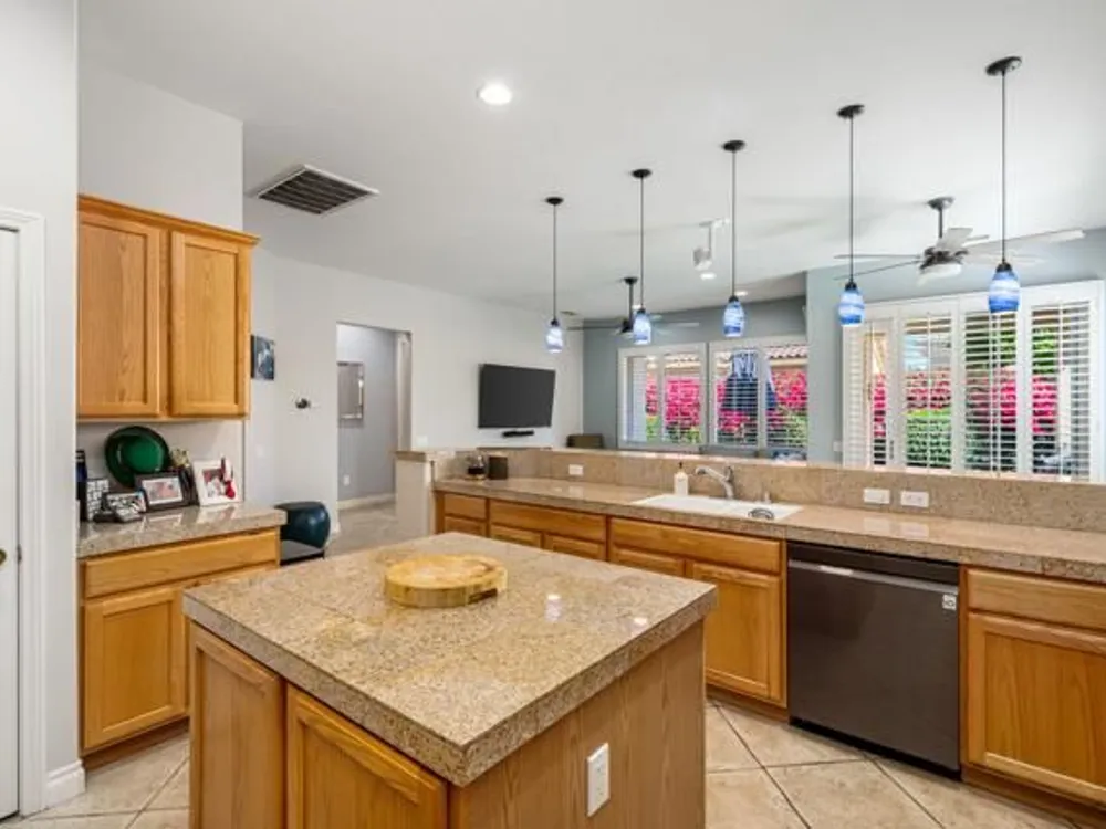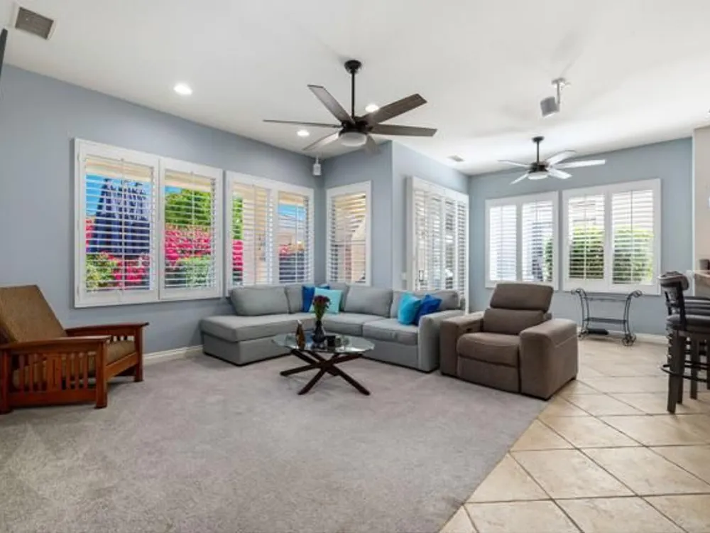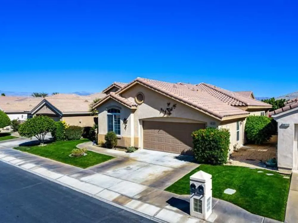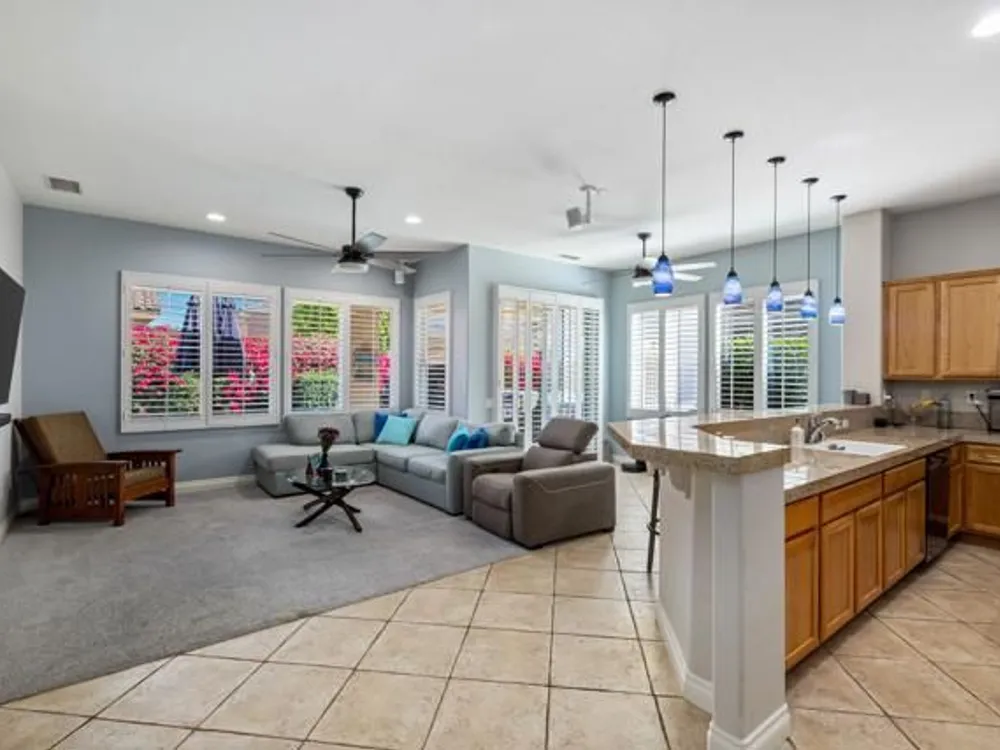 Nestled within the esteemed Heritage Palms Country Club, 44110 Royal Troon Drive in Indio, California, offers a harmonious blend of comfort and elegance. This meticulously maintained residence features 2 bedrooms and 2 full bathrooms across 1,885 square feet of living space. The open-concept design is enhanced by high ceilings, tile flooring, and plantation shutters throughout, creating a bright and inviting atmosphere.The spacious kitchen is a chef's delight, equipped with granite tile countertops, an island, and a breakfast bar, making it ideal for both everyday meals and entertaining. The master suite provides a serene retreat, complete with a generous walk-in closet and an en-suite bathroom featuring dual sinks and a separate soaking tub. Additional amenities include an indoor laundry room with upper cabinets and a utility sink, ensuring convenience and ample storage.