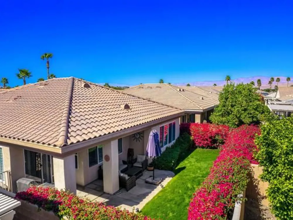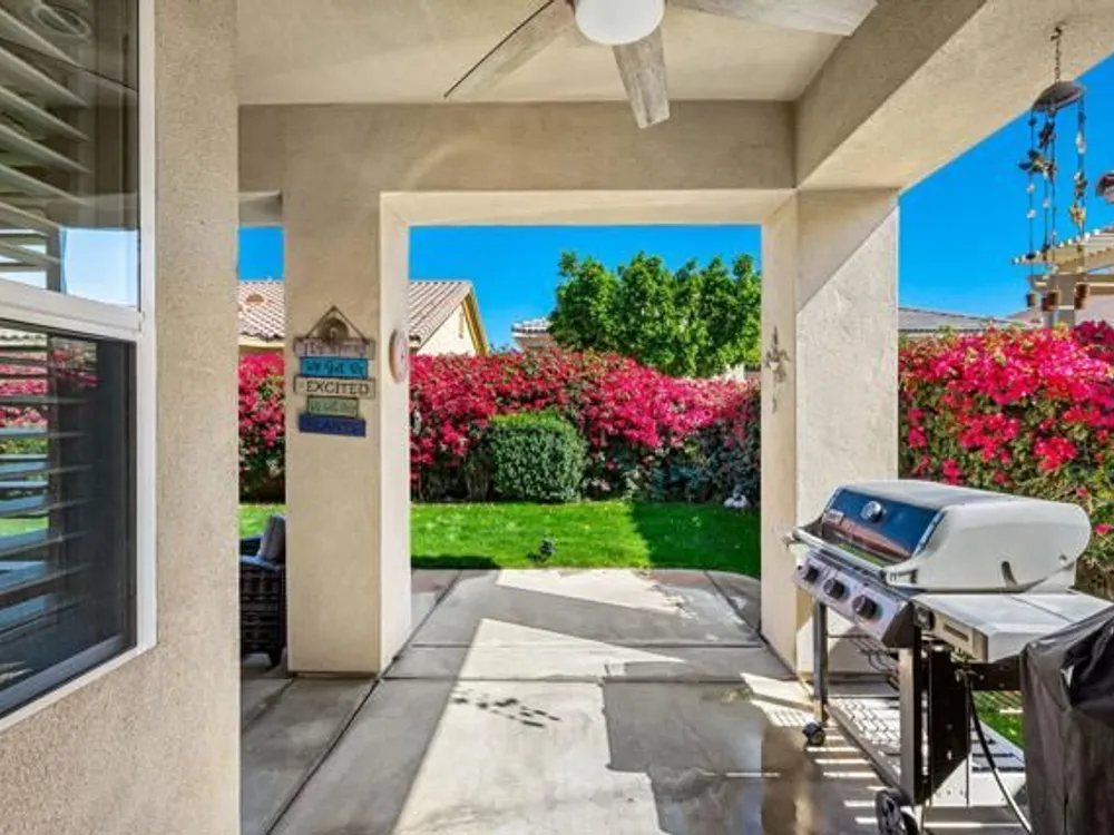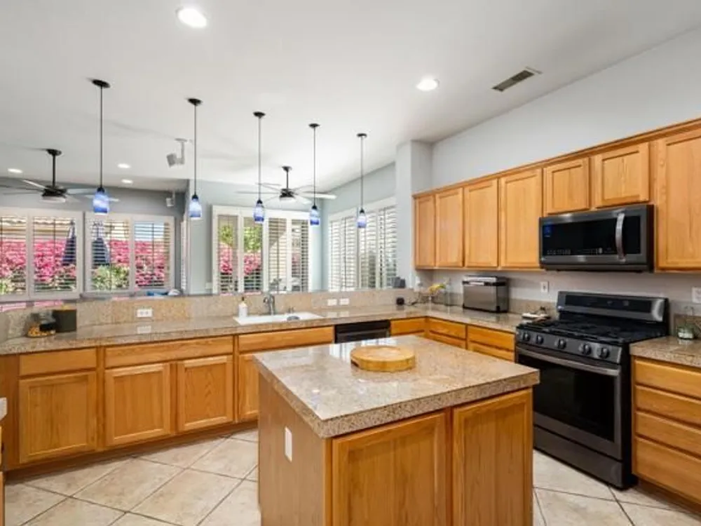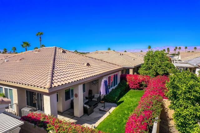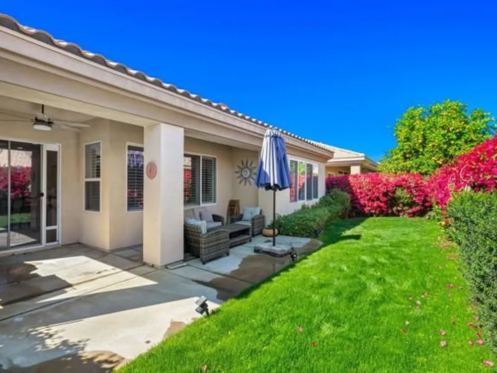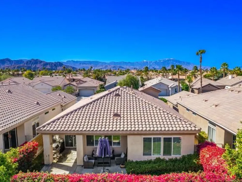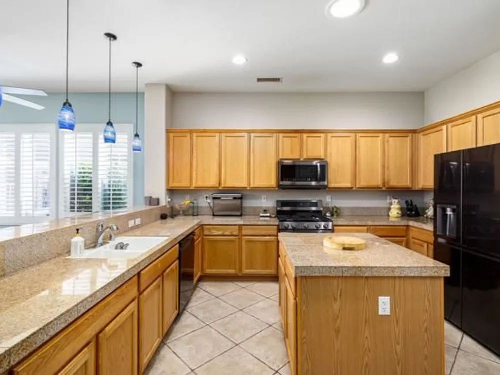 Nestled within the esteemed Heritage Palms Country Club, 44110 Royal Troon Drive in Indio, California, offers a harmonious blend of comfort and elegance. This meticulously maintained residence features 2 bedrooms and 2 full bathrooms across 1,885 square feet of living space. The open-concept design is enhanced by high ceilings, tile flooring, and plantation shutters throughout, creating a bright and inviting atmosphere.The spacious kitchen is a chef's delight, equipped with granite tile countertops, an island, and a breakfast bar, making it ideal for both everyday meals and entertaining. The master suite provides a serene retreat, complete with a generous walk-in closet and an en-suite bathroom featuring dual sinks and a separate soaking tub. Additional amenities include an indoor laundry room with upper cabinets and a utility sink, ensuring convenience and ample storage.