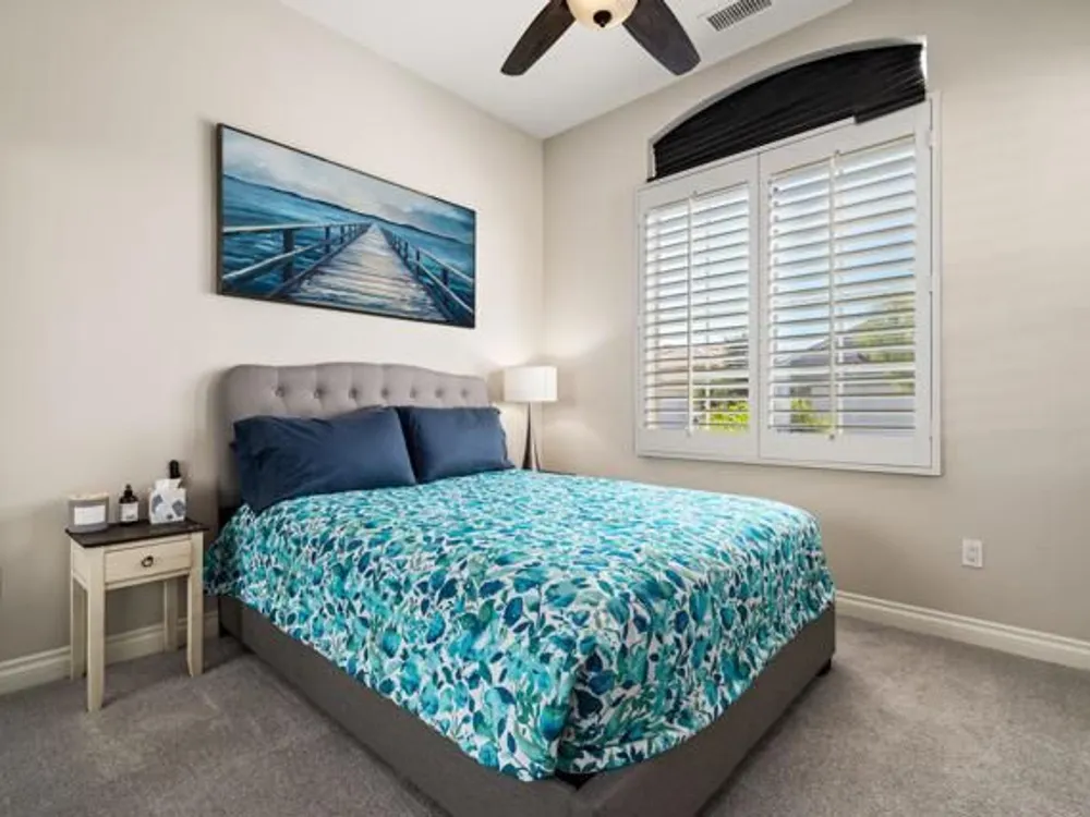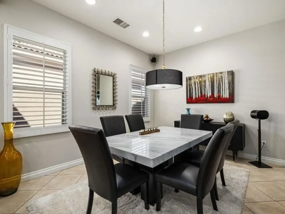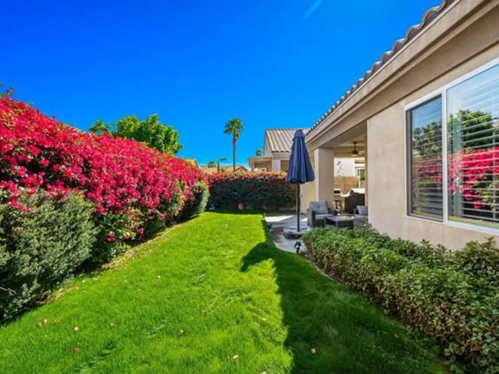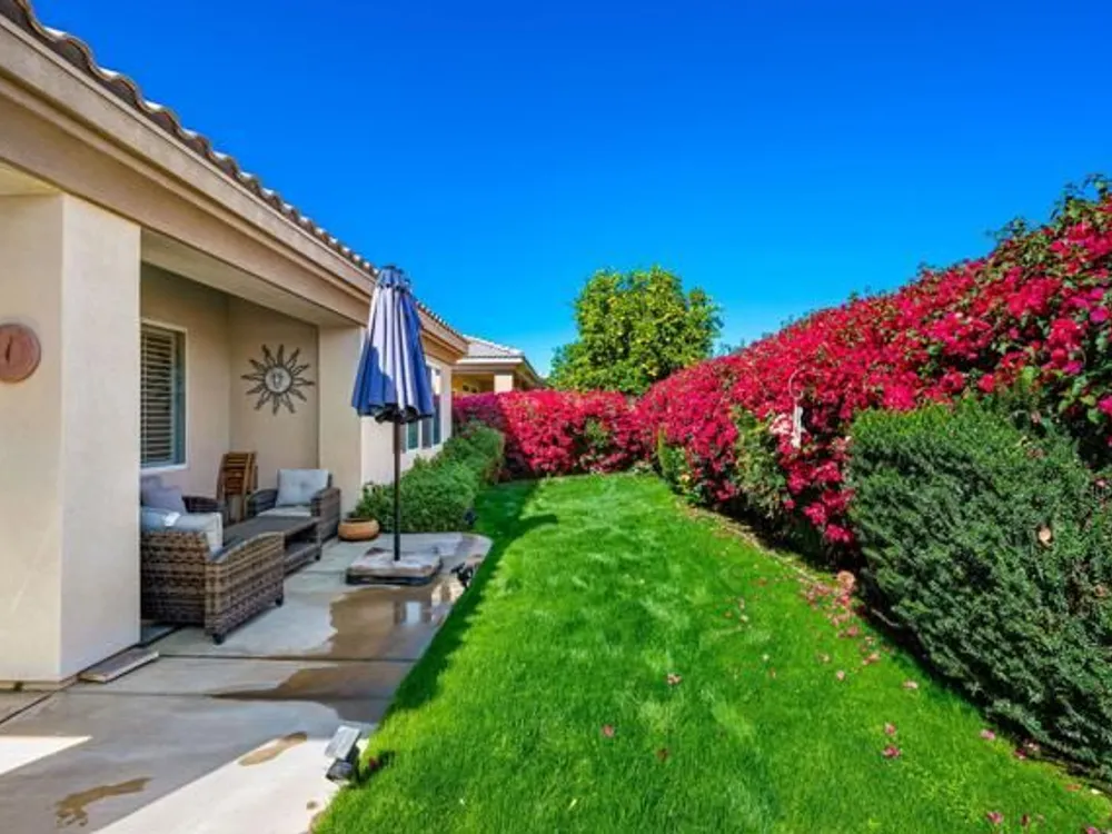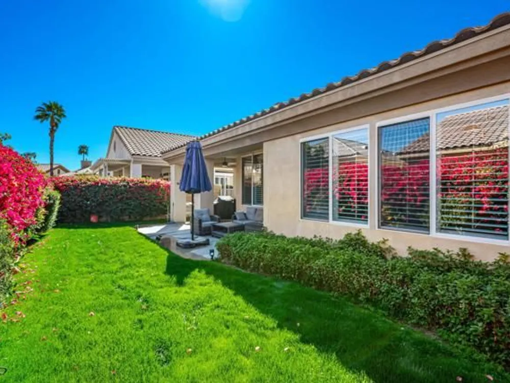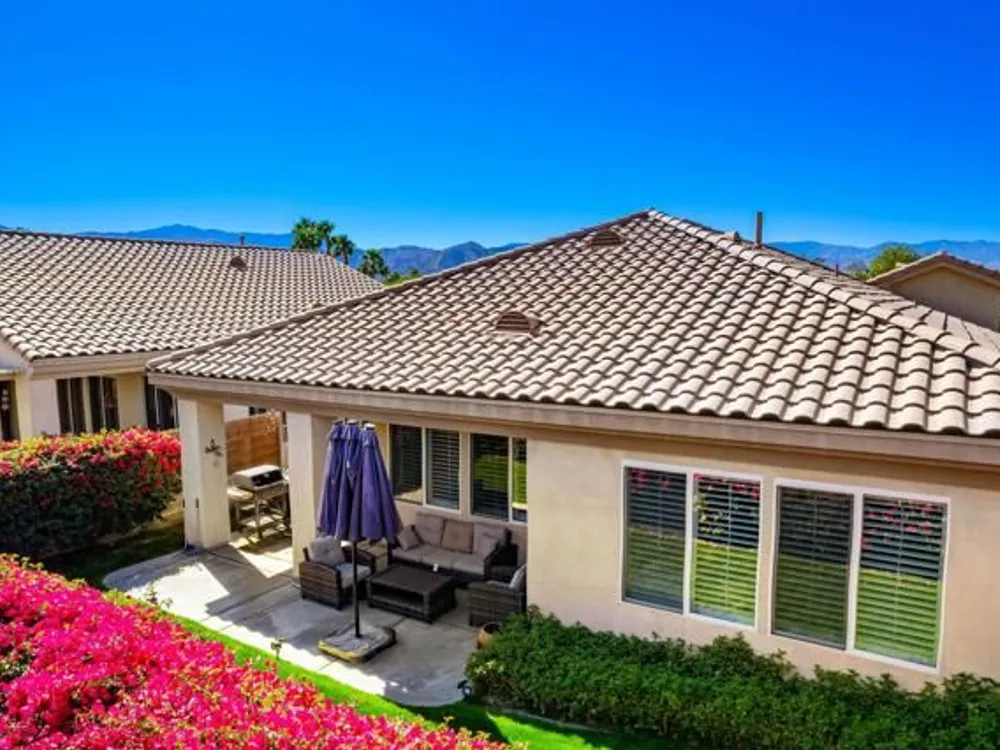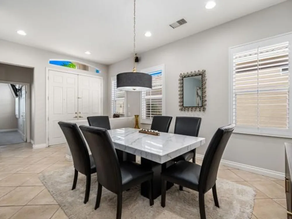 Nestled within the esteemed Heritage Palms Country Club, 44110 Royal Troon Drive in Indio, California, offers a harmonious blend of comfort and elegance. This meticulously maintained residence features 2 bedrooms and 2 full bathrooms across 1,885 square feet of living space. The open-concept design is enhanced by high ceilings, tile flooring, and plantation shutters throughout, creating a bright and inviting atmosphere.The spacious kitchen is a chef's delight, equipped with granite tile countertops, an island, and a breakfast bar, making it ideal for both everyday meals and entertaining. The master suite provides a serene retreat, complete with a generous walk-in closet and an en-suite bathroom featuring dual sinks and a separate soaking tub. Additional amenities include an indoor laundry room with upper cabinets and a utility sink, ensuring convenience and ample storage.