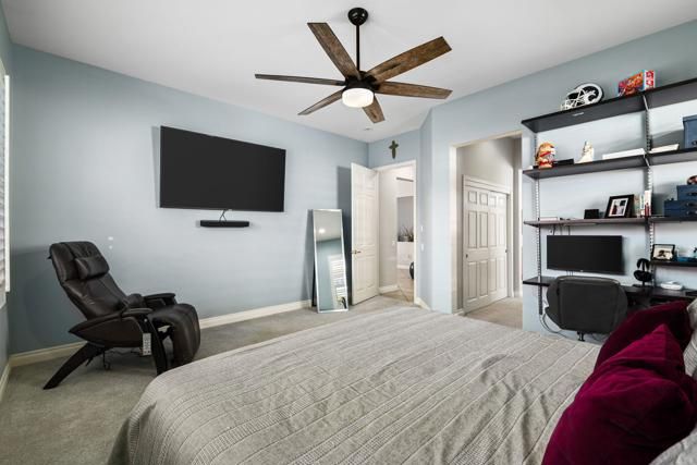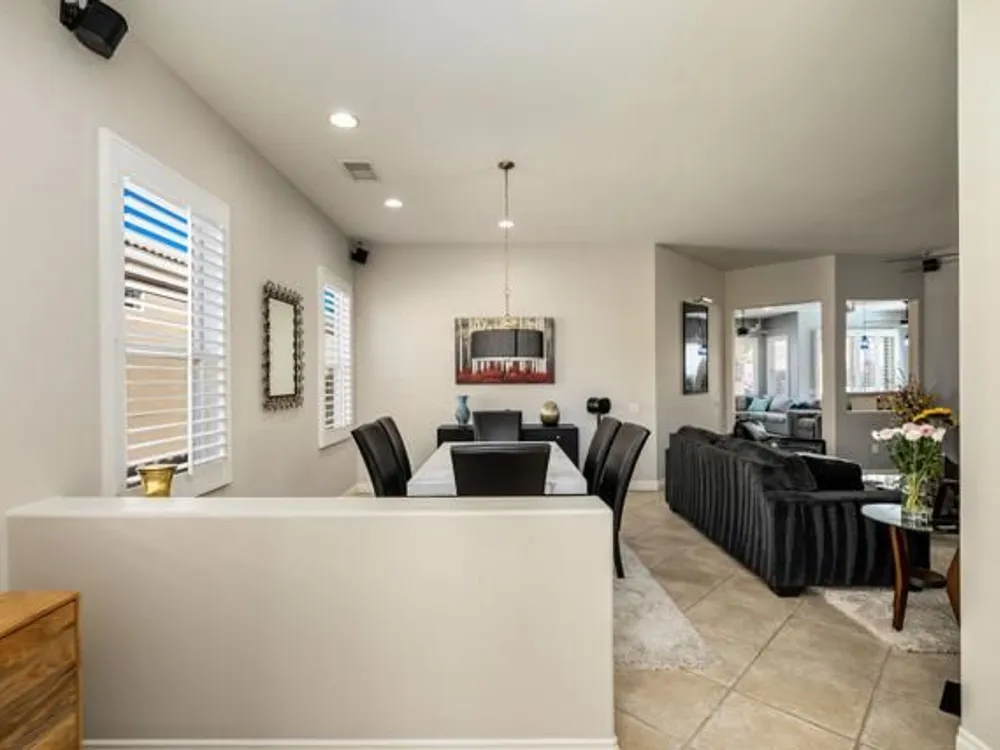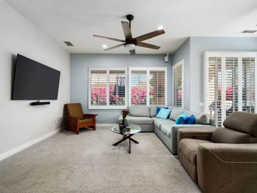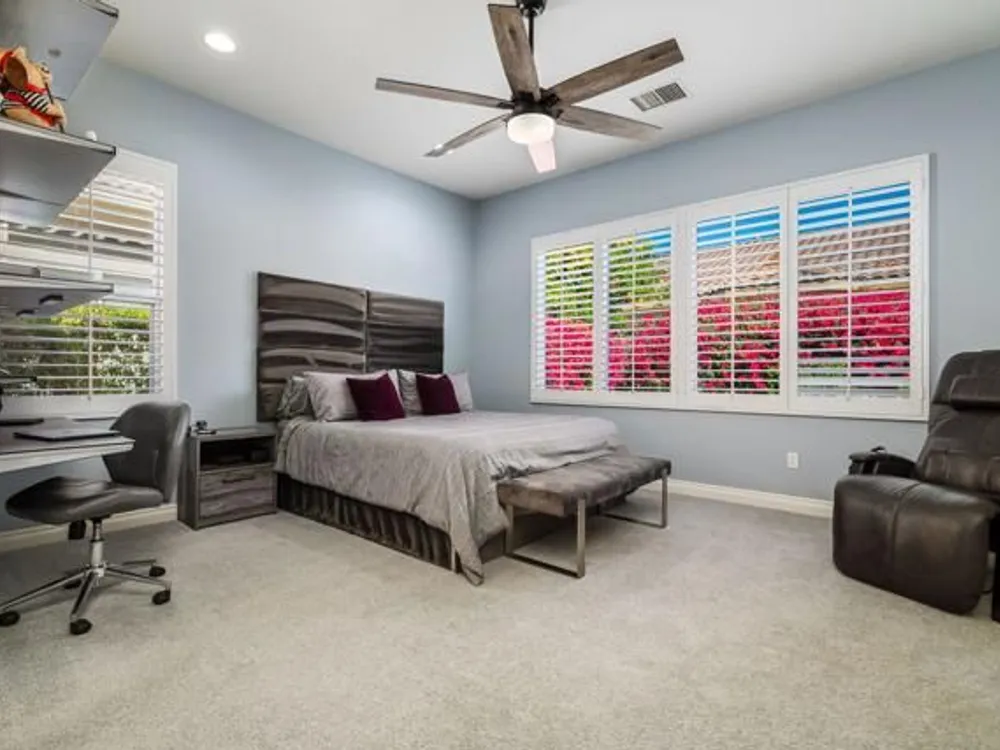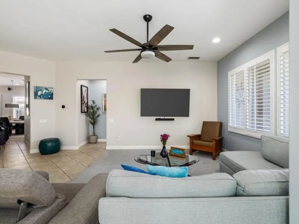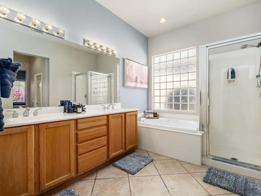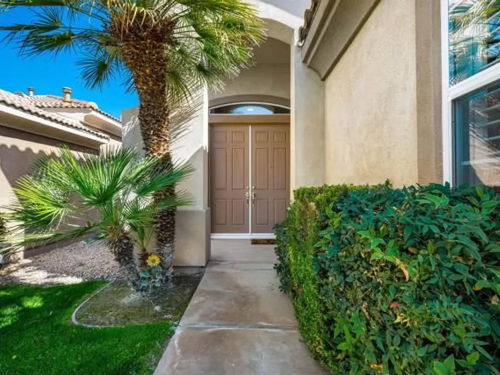 Nestled within the esteemed Heritage Palms Country Club, 44110 Royal Troon Drive in Indio, California, offers a harmonious blend of comfort and elegance. This meticulously maintained residence features 2 bedrooms and 2 full bathrooms across 1,885 square feet of living space. The open-concept design is enhanced by high ceilings, tile flooring, and plantation shutters throughout, creating a bright and inviting atmosphere.The spacious kitchen is a chef's delight, equipped with granite tile countertops, an island, and a breakfast bar, making it ideal for both everyday meals and entertaining. The master suite provides a serene retreat, complete with a generous walk-in closet and an en-suite bathroom featuring dual sinks and a separate soaking tub. Additional amenities include an indoor laundry room with upper cabinets and a utility sink, ensuring convenience and ample storage.