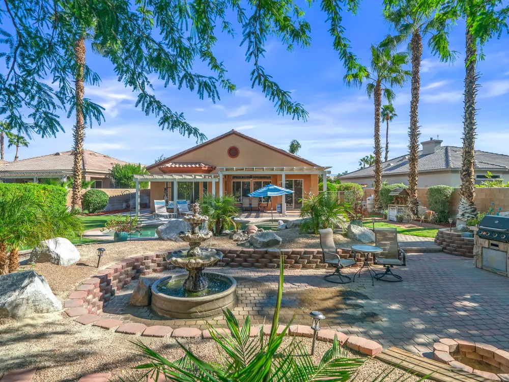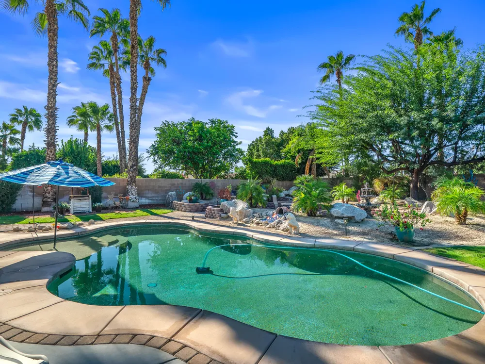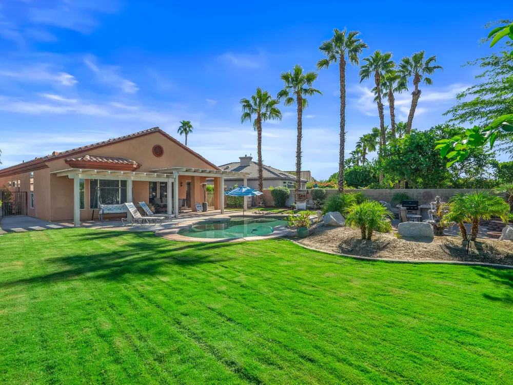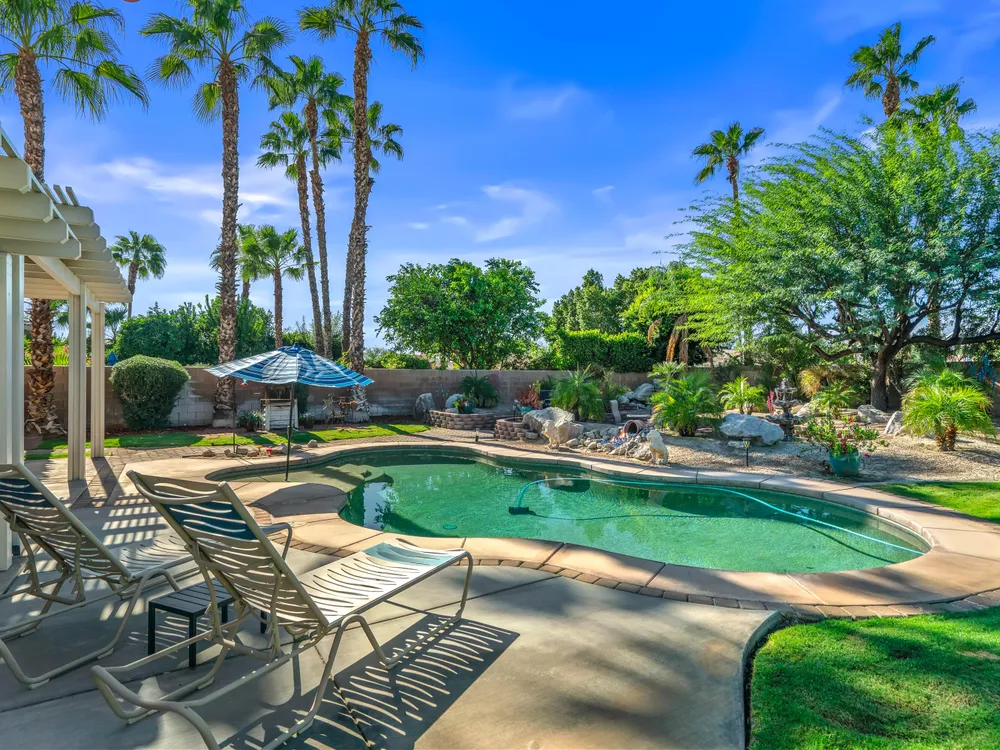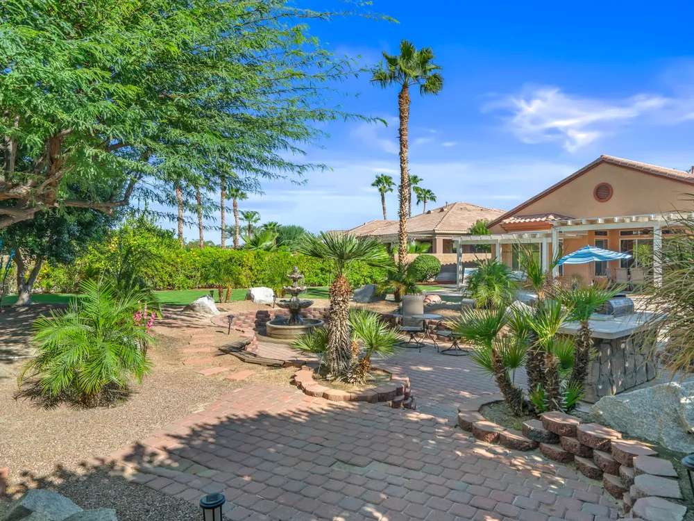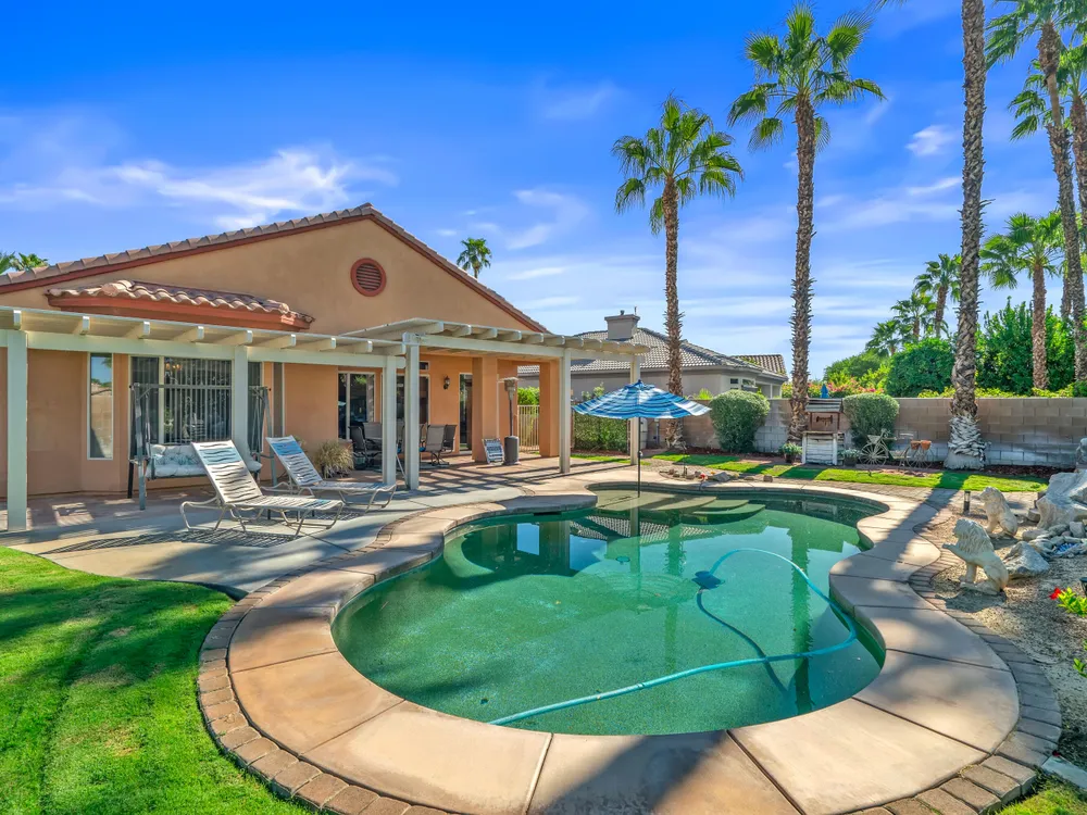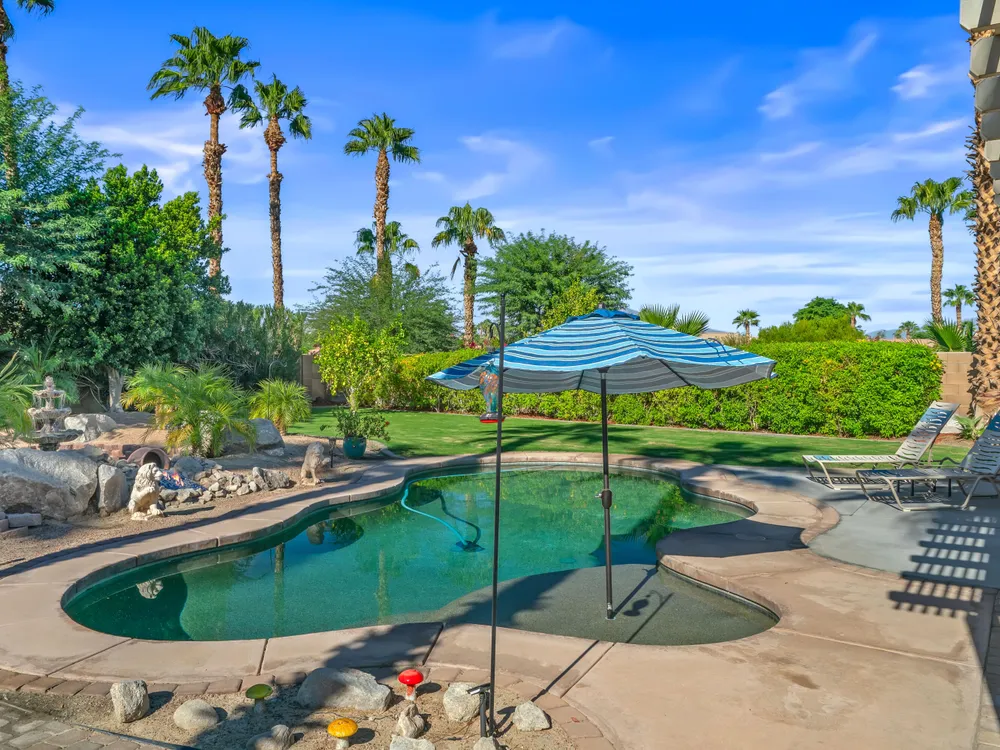 OWNER MAY CONSIDER LEASE. Stunning home in beautiful adult community......rare, large yard with tropical pool oasis. Welcome to your dream home in a highly sought-after golf community! This beautifully updated, open floor plan residence offers the perfect blend of luxury, comfort, and outdoor living. Step into a tropical backyard paradise featuring a BBQ, sparkling pool, waterfall, fountain, lush landscaping, and multiple seating areas ideal for relaxing or entertaining guests. The sunset and mountain views are wonderful and the house is situated on the front of the lot to enhance the view and reduce street noise. Inside, enjoy a spacious layout with an optional office/Den, newer appliances and an indoor laundry room for added convenience. The large primary suite is a true sanctuary, featuring a custom walk-in closet and plenty of space to unwind after a long day. Included in your dues are security, cable TV, internet and amenities! The community offers full security, a dining clubhouse, banquet room, meeting rooms, card rooms, library, billiard room, 18-hole golf course, pro shop, tennis, pickle ball, fitness center, indoor lap pool and outdoor pool and spa with views of the golf course and south facing mountains. The community also has many social groups to choose from! (Owner is licensed Realtor)