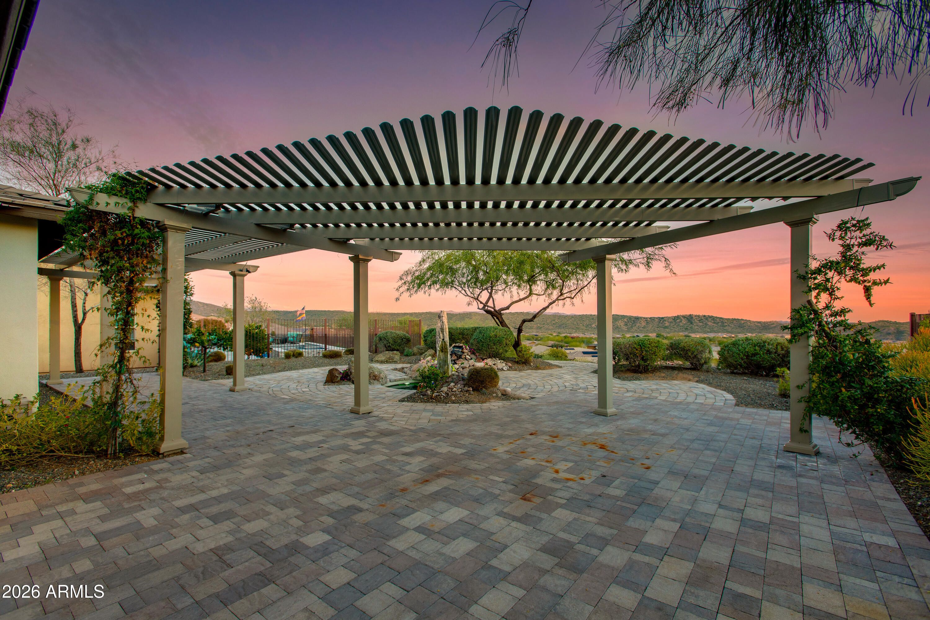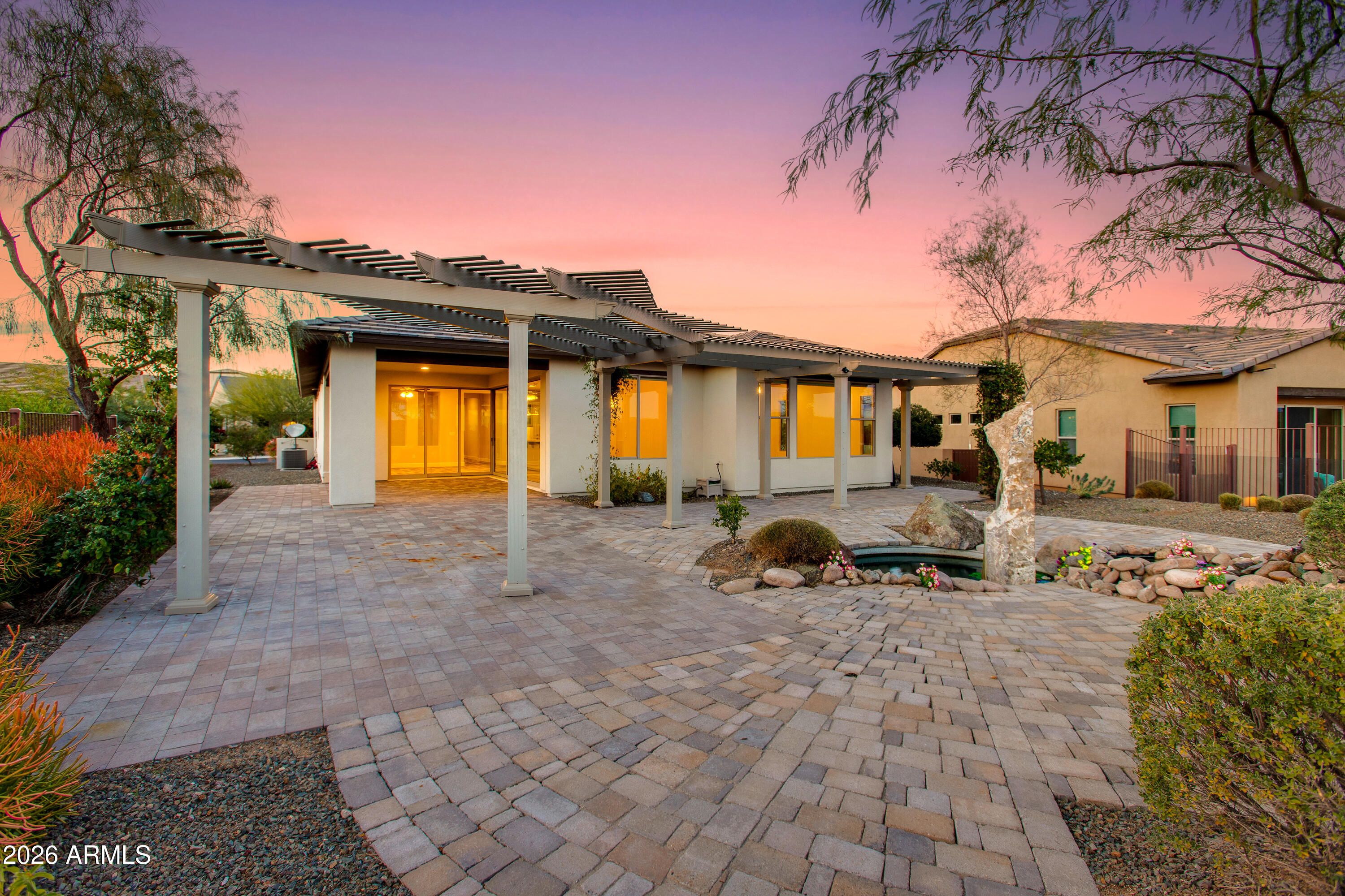 ENJOY PANORAMIC DESERT MOUNTAIN VIEWS from this Shea-built home, perfectly positioned on an elevated homesite with unobstructed vistas & exceptional outdoor hosting space. Entertainer's dream featuring expanded outdoor living w/custom water feature & expansive pergola—ideal for hosting or relaxing against a dramatic desert backdrop. Thoughtfully designed 1,945sq ft includes 2 bed, 2 bath & den.Extensive upgrades include corner multi-slide doors for seamless indoor-outdoor flow, engineered stone countertops, upgraded cabinetry w/soft-close drawers, Café built-in appliances, designer lighting & upgraded flooring throughout w/no carpet. Additional storage & workspace in laundry. Rare buildable side yard allows space for guest casita, extra garage or pool. A true rare find at Wickenburg Ranch