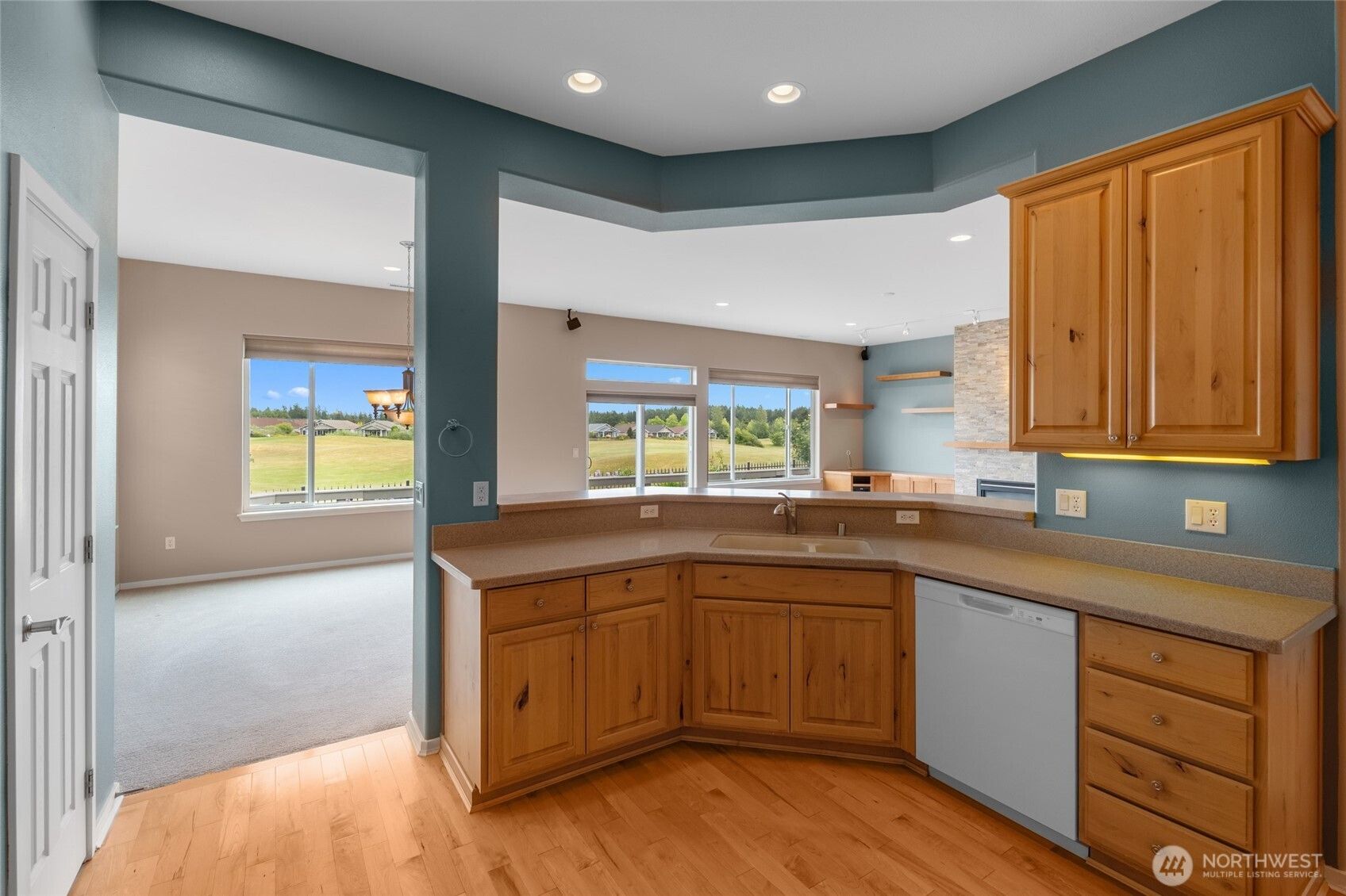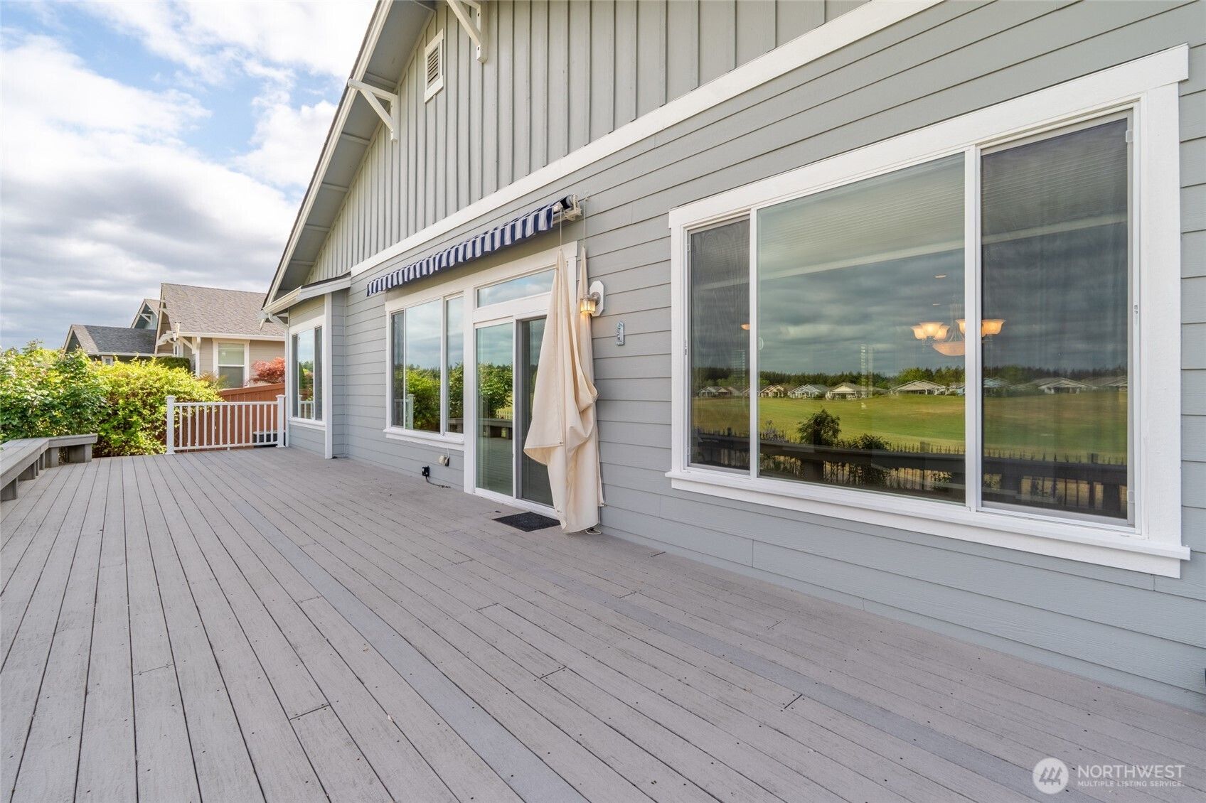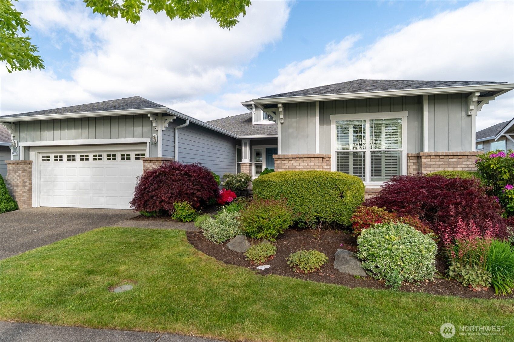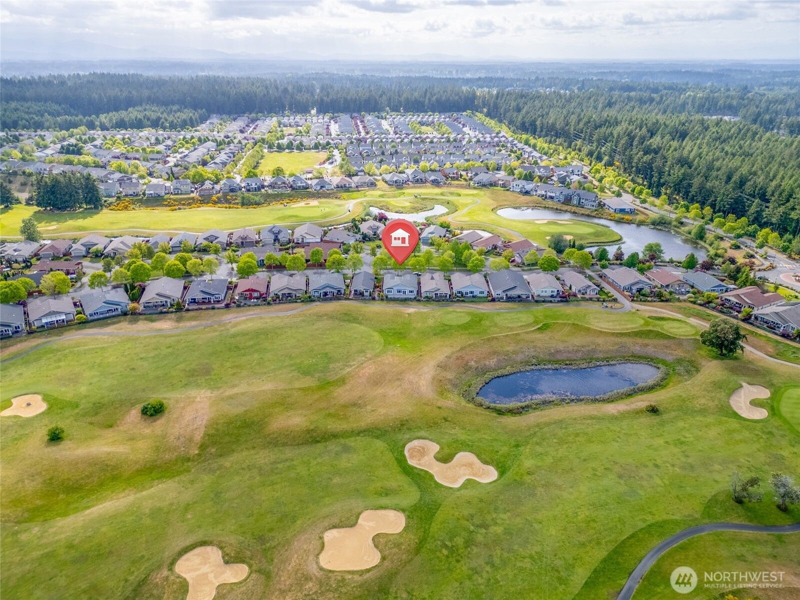 Enjoy panoramic views of three fairways and the majestic silhouette of Mount Rainier from this stunning 2,200 sq ft Bellevue floor plan in Jubilee, a premier 55+ active adult community. The spacious great room features a floor-to-ceiling brick fireplace and custom built-ins, flowing to a 600 sq ft deck with power awning. The gourmet kitchen boasts Silestone countertops, alder cabinets, and new appliances. Two bedroom suites plus a private den offer flexible living. The luxurious primary bath includes quartz counters and a heated walk-in spa tub. Enjoy top-tier amenities: golf, swimming, fitness, pickleball, tennis, a lodge, pool, and a scenic beach trail.