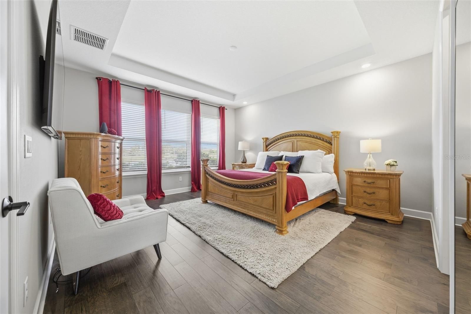 - Ceiling Fan(s), Crown Molding, Eat-in Kitchen, High Ceilings, Kitchen/Family Room Combo, Open Floorplan, Main Level Primary, Split Bedrooms, Thermostat, Tray Ceiling(s), Walk-In Closet(s), Window Treatments