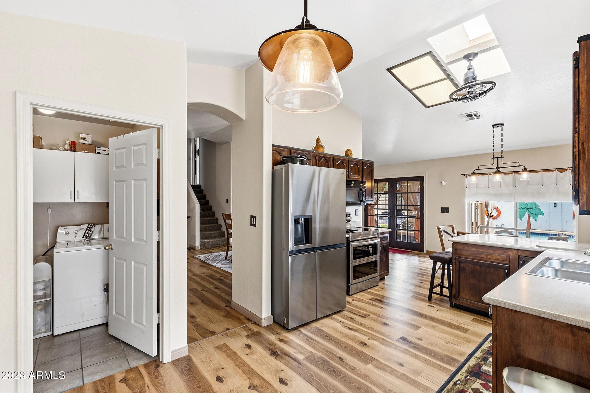Corner Lot Living! This tri-level home offers a functional layout with vaulted ceilings & tons of natural light. The main level features a formal dining area with large French doors to the backyard, alongside a kitchen with dark wood cabinetry, pantry space, breakfast bar & eat-in area. The lower level includes a family room with a wood-burning fireplace, plus two bedrooms & a full bath. Upstairs, the primary suite features private balcony access, dual vanities, custom tile shower & walk-in closet, along with two additional bedrooms & full bath. The backyard offers a covered patio, sparkling pool & grassy area with block fencing, plus direct-access 3 car garage. Community amenities include parks, playgrounds, sport courts, plus a pool & rec center. Easy access to I-10, Loop 202, shopping, dining, Tempe Sports Complex & more!