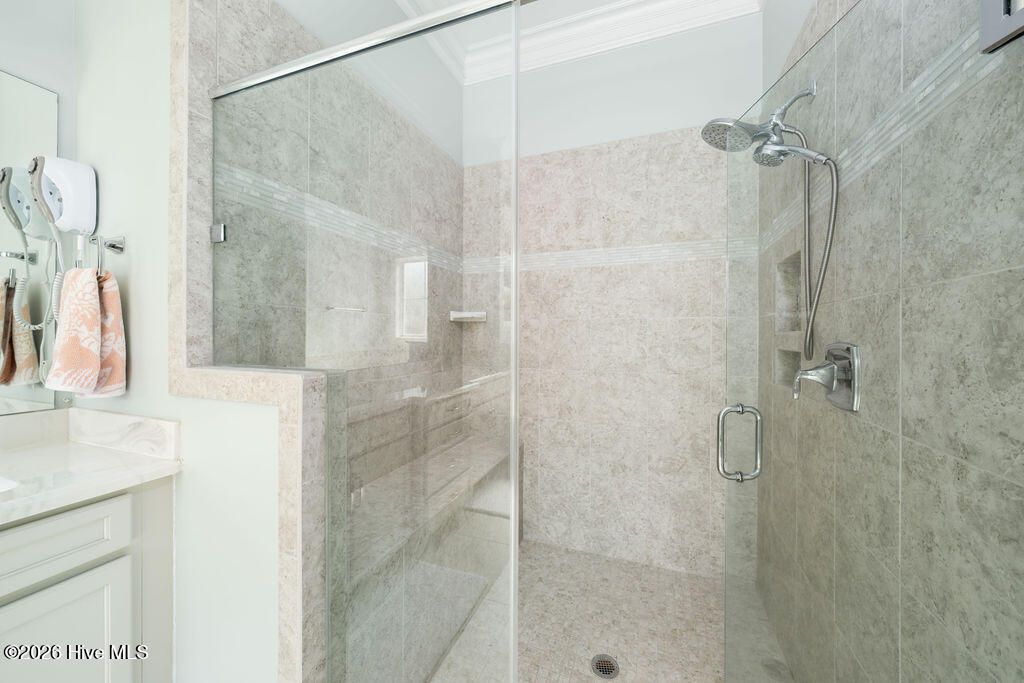 - Master Downstairs, Walk-in Closet(s), High Ceilings, Entrance Foyer, Solid Surface, Bookcases, Kitchen Island, Ceiling Fan(s), Pantry, Walk-in Shower