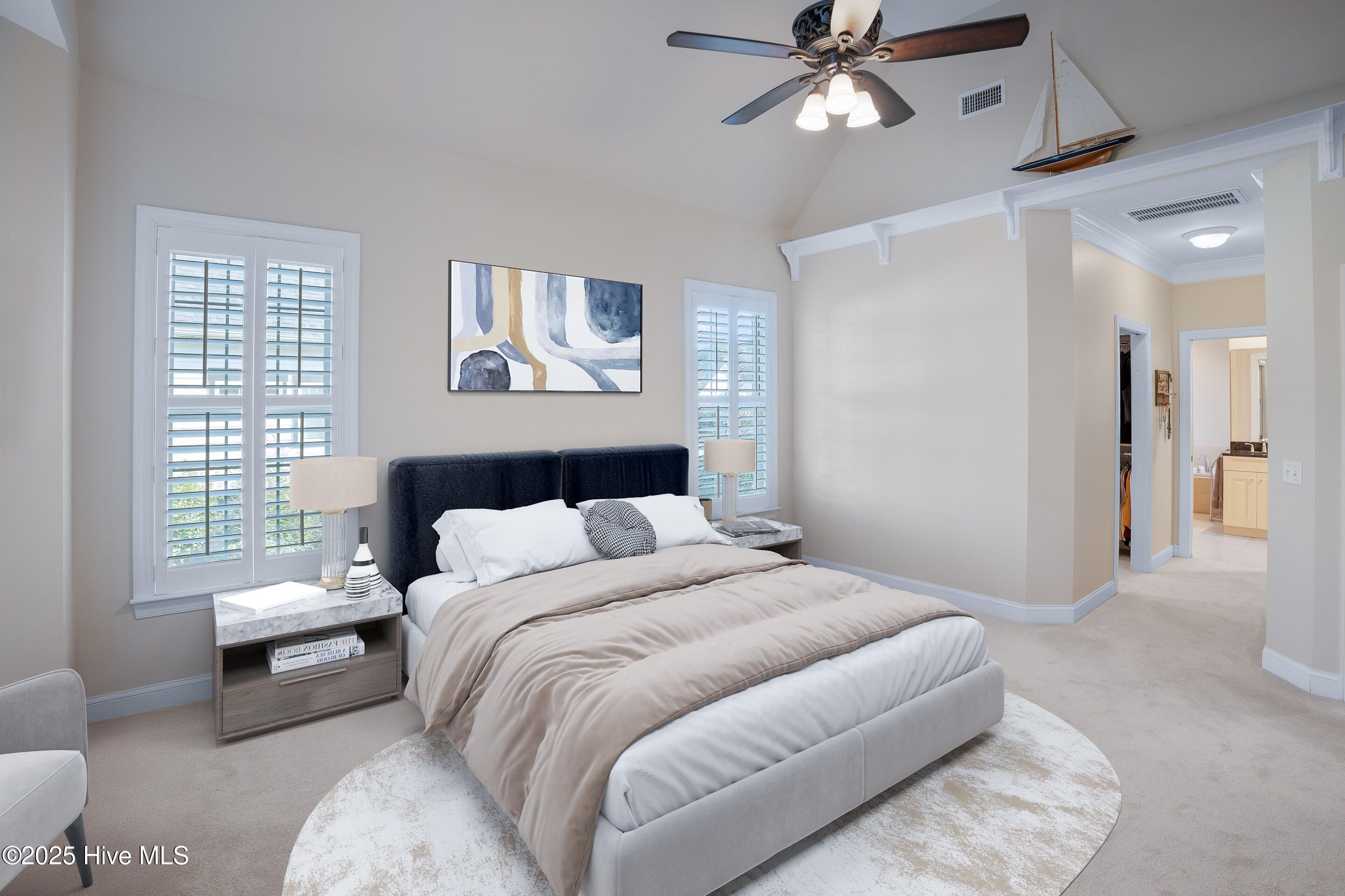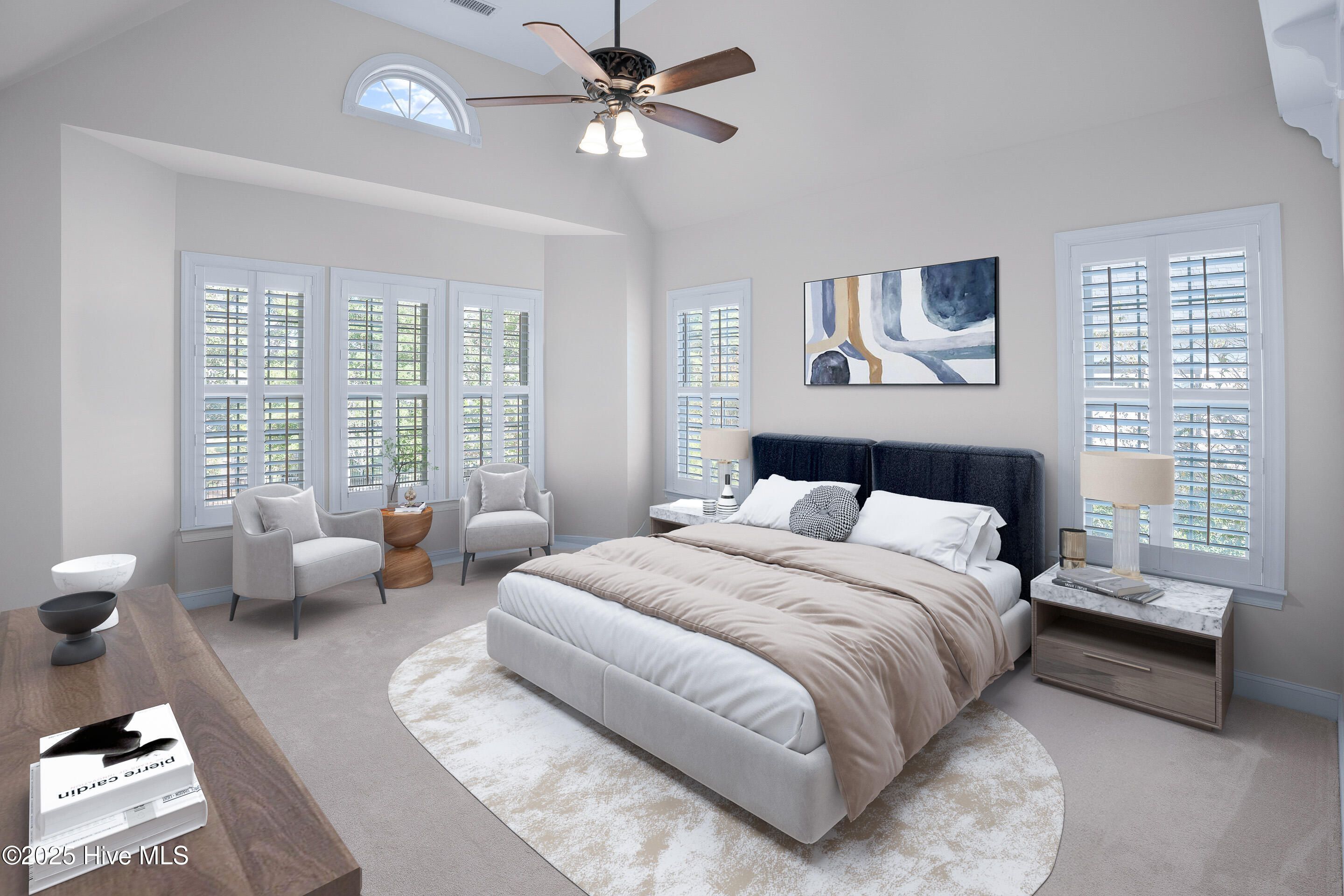 - Master Downstairs, Walk-In Closet(s), Vaulted Ceiling(s), High Ceilings, Bookcases, Kitchen Island, Ceiling Fan(s), Pantry, Walk-In Shower, Blinds, Eat-in Kitchen