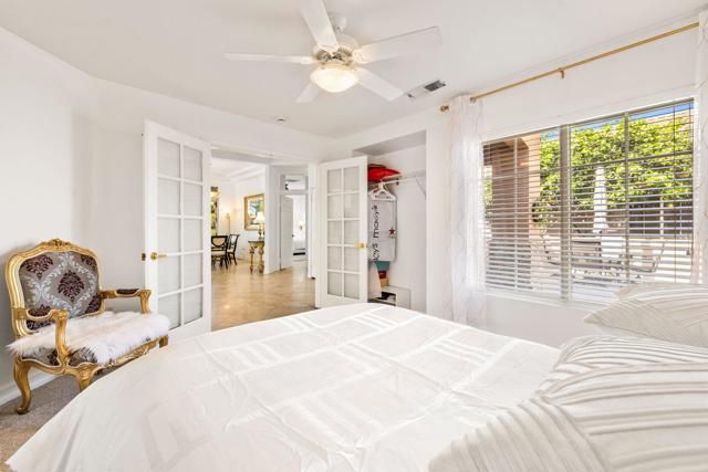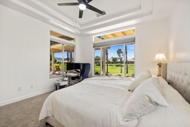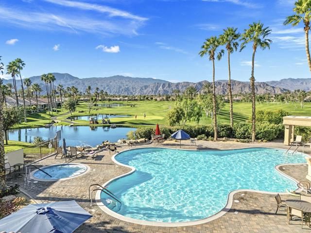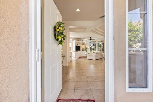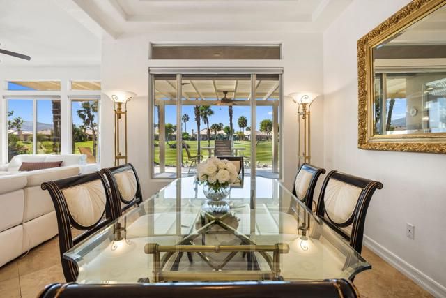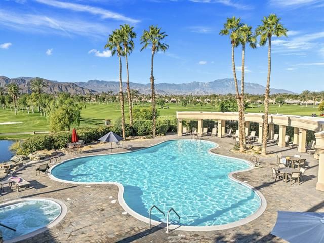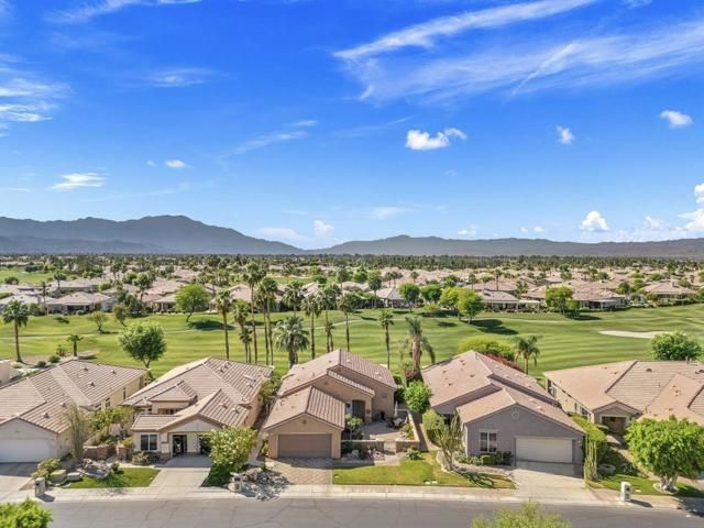 Offered in the sought-after Heritage Palms Country Club, this upgraded residence delivers a perfect balance of relaxed desert living and refined design. The popular 2-bedroom plus den floorplan has been reimagined to function as a true 3-bedroom home, with the den enclosed and enhanced by the addition of a closet--ideal for guests, workspace, or added flexibility. From the moment you arrive, the home stands out with its stone-accented exterior, paver driveway, and inviting courtyard. Inside, the main living area is designed for easy living and entertaining, featuring oversized tile set on the diagonal, elevated baseboards, a custom media built-in, and an abundance of natural light. Recent updates include new paint, new carpeting in all bedrooms and new window coverings throughout, adding a clean, cohesive finish. The kitchen is both functional and stylish, appointed with rich custom cabinetry, slab granite counters with a streamlined single-level island, stainless steel appliances, and modern pendant lighting that anchors the space. Both bathrooms have been refreshed with a contemporary touch, showcasing walk-in tile showers, updated vanities, stone countertops, and upgraded fixtures. Outdoors, the backyard is designed to take full advantage of the surroundings, with a generous covered patio featuring flagstone detailing, an Alumawood structure, built-in BBQ, and open views across the fairway to the mountains beyond. Major systems have been addressed with a newer A/C and water heater, and the garage includes the added convenience of a laundry sink. Residents of Heritage Palms enjoy access to a premier 55+ lifestyle, including championship golf, resort-style pools (indoor and outdoor), pickleball and tennis, a full fitness center, clubhouse dining, and an active calendar of social events.