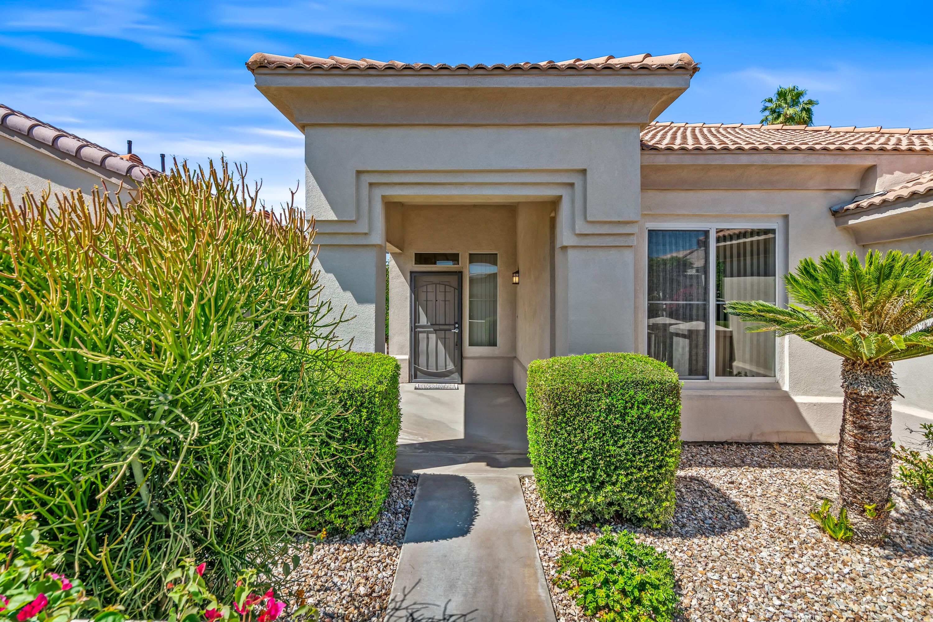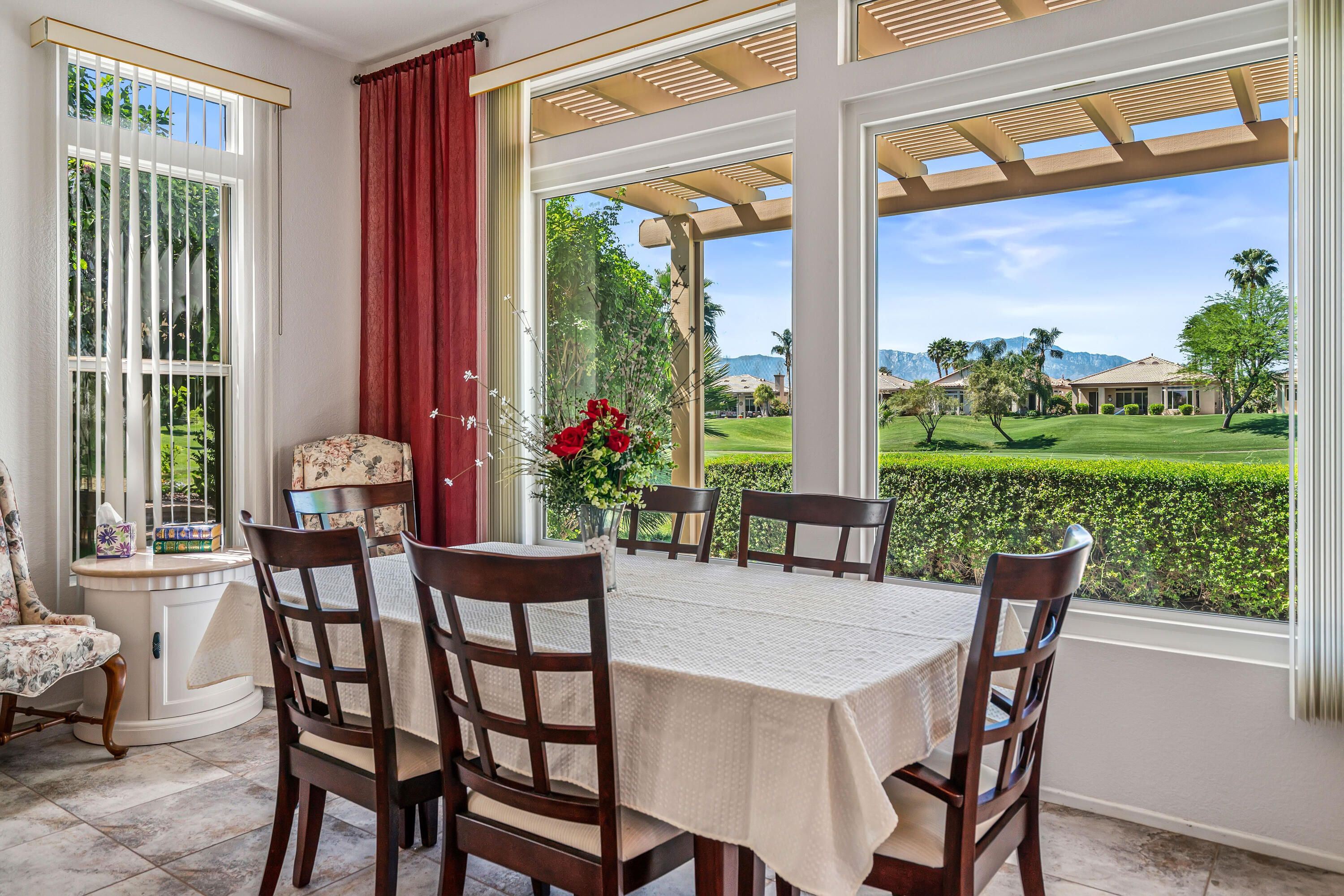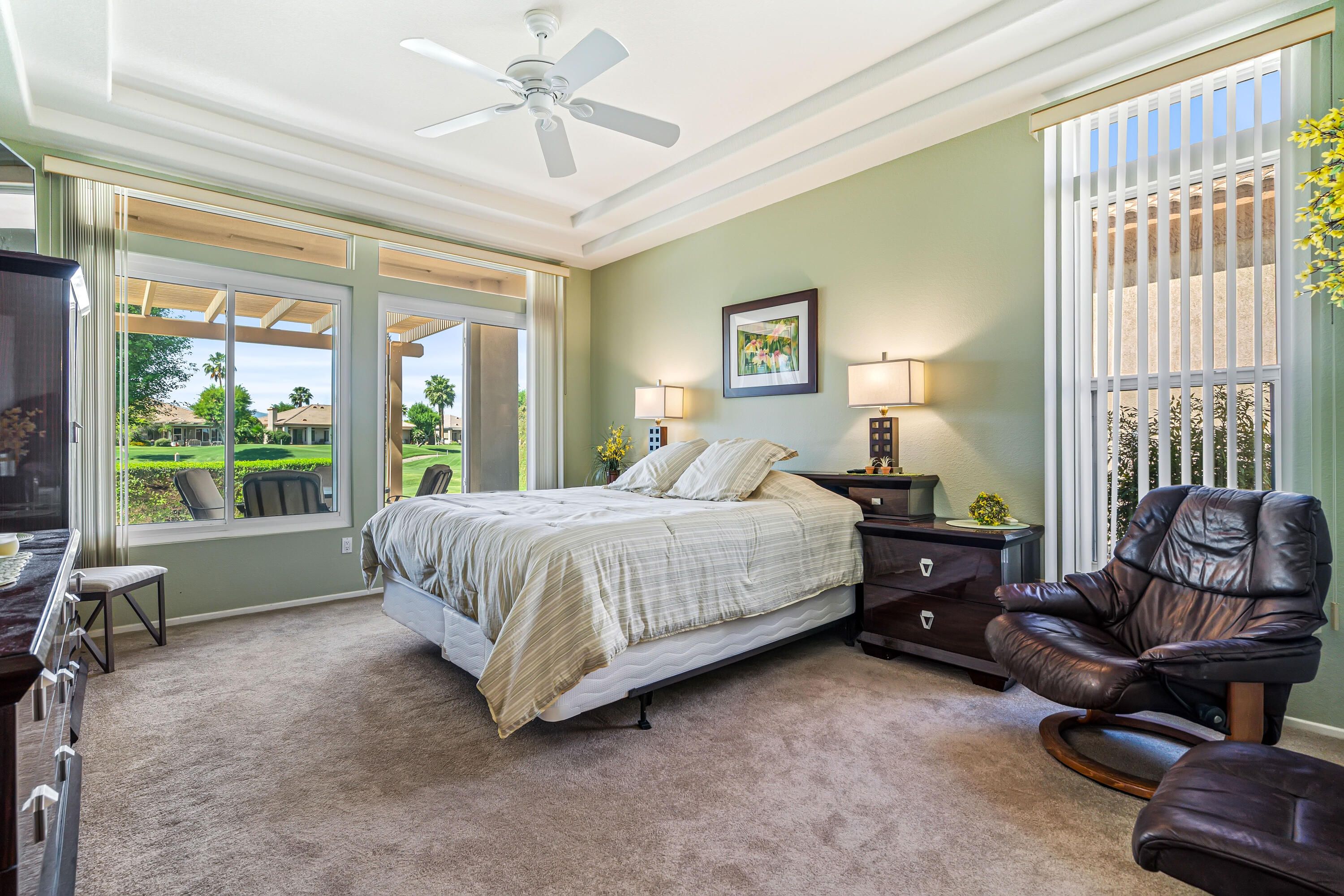 Fantastic Mountain, Fairway and Beautiful Sunset Views from this beautiful and popular 2061 sq.ft. home! Featuring 2 BDRMS PLUS a Den, granite slab kitchen counters an open design layout and being offered FURNISHED. The large primary bedroom has dual walk-in closets, dual vanities and custom window replacements. The guest bedroom was customized to the larger version and the dbl door den is being utilized as a 3rd bedroom. All of the fairway/mountain view windows have also been updated/replaced. Additional upgrades include an entry courtyard, both A/C units & the water heater have been replaced, artificial front yard turf,, Toto commodes and an extended aluminum rear patio cover also been added. Heritage Palms is a premier adult community featuring an 18 hole championship golf course, indoor & outdoor pools, pickleball & tennis courts, fitness center, grill room, card rooms, billiards room, social clubs & more.