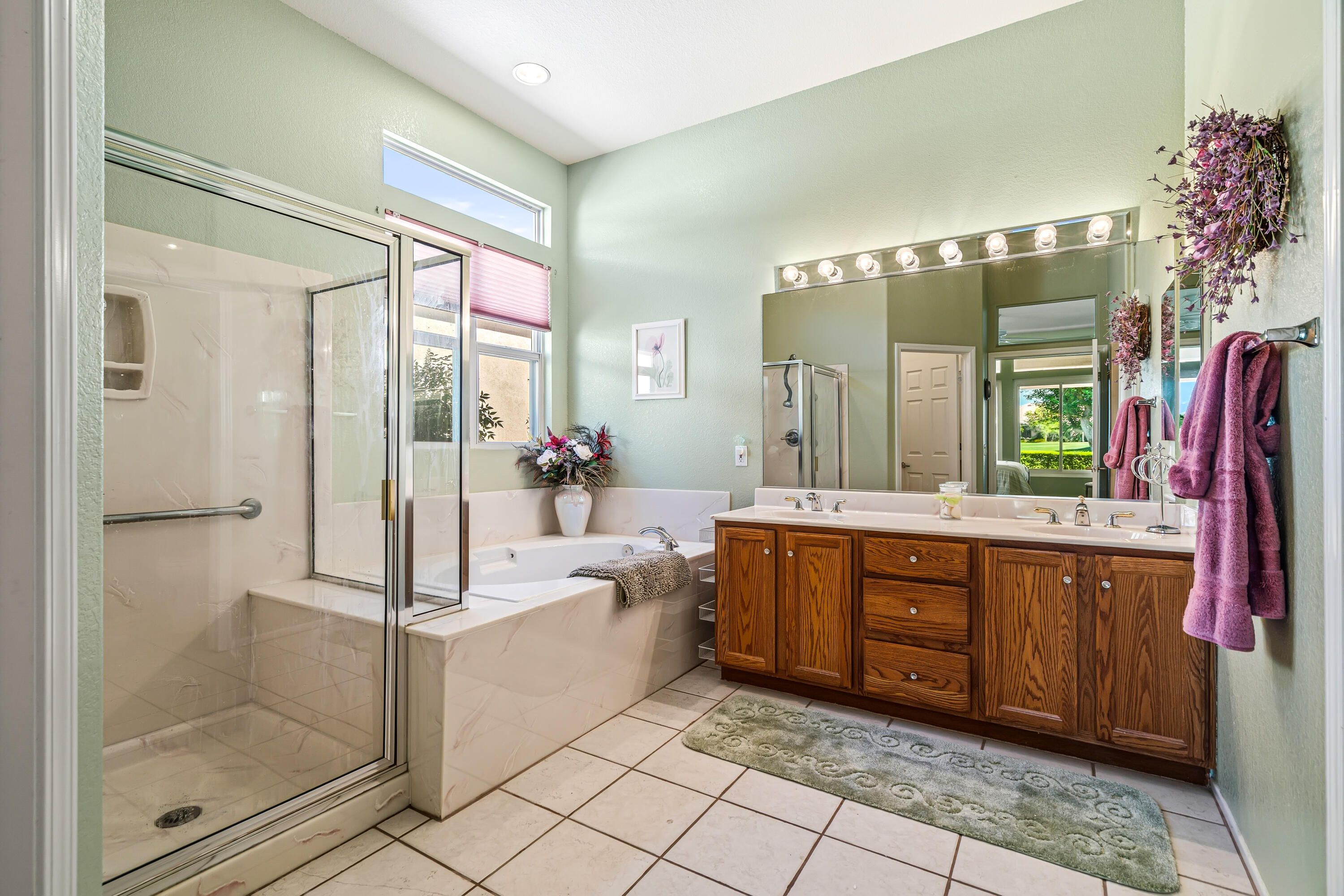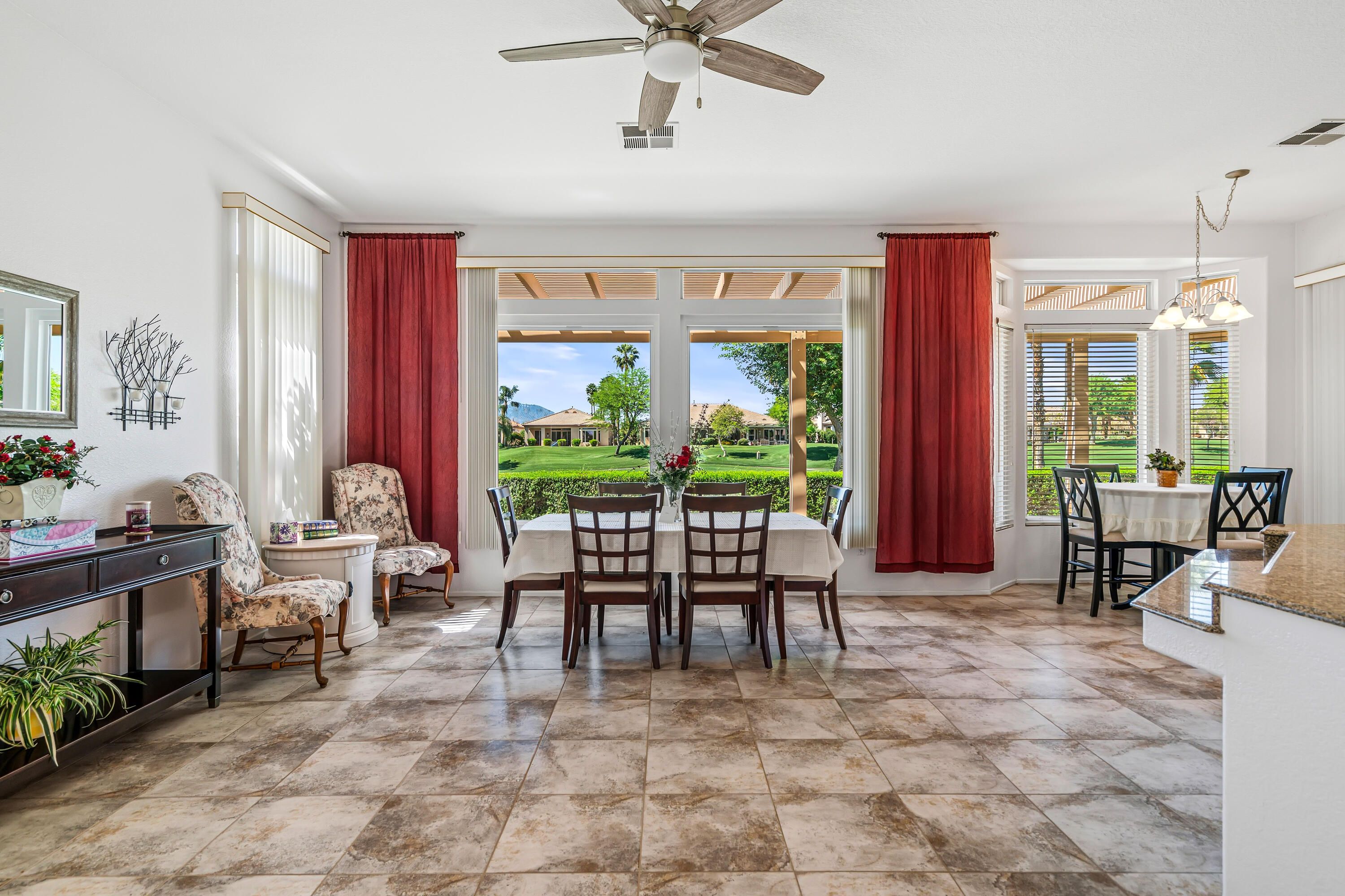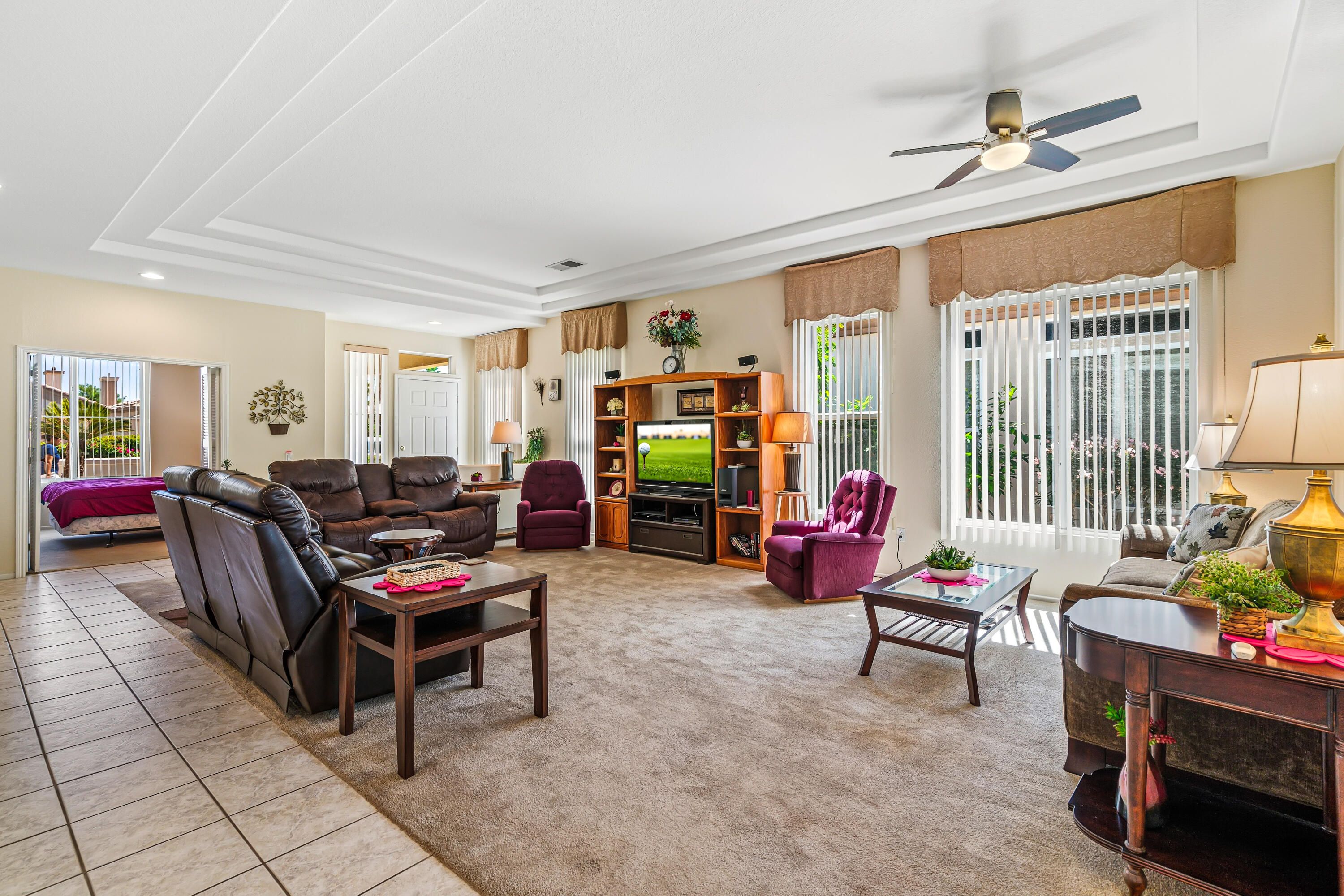 Fantastic Mountain, Fairway and Beautiful Sunset Views from this beautiful and popular 2061 sq.ft. home! Featuring 2 BDRMS PLUS a Den, granite slab kitchen counters an open design layout and being offered FURNISHED. The large primary bedroom has dual walk-in closets, dual vanities and custom window replacements. The guest bedroom was customized to the larger version and the dbl door den is being utilized as a 3rd bedroom. All of the fairway/mountain view windows have also been updated/replaced. Additional upgrades include an entry courtyard, both A/C units & the water heater have been replaced, artificial front yard turf,, Toto commodes and an extended aluminum rear patio cover also been added. Heritage Palms is a premier adult community featuring an 18 hole championship golf course, indoor & outdoor pools, pickleball & tennis courts, fitness center, grill room, card rooms, billiards room, social clubs & more.