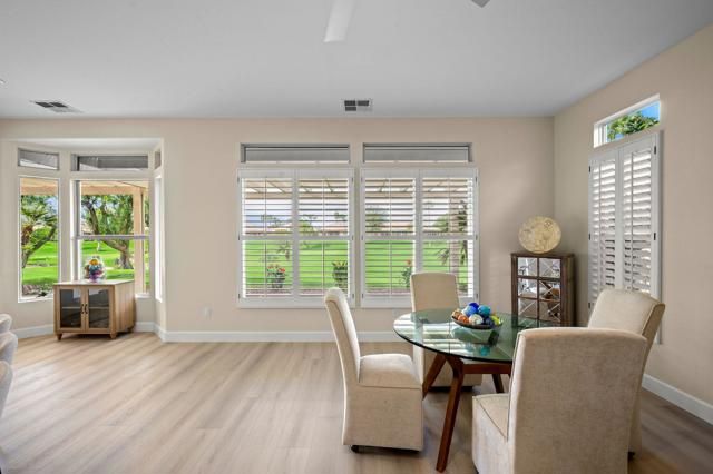 Gorgeous light and bright recently remodeled spacious floorplan offering 2 bedrooms plus a versatile den with double doors. From the moment you enter this stunning home the spaciousness and openness welcome you. Starting with new flooring throughout and the refreshed kitchen and baths have 6 slabs of beautiful new quartz surfaces with oversized kitchen island perfect to gather around. New appliances and a beautiful natural stone quartzite fireplace make the kitchen and dining room the place to be. Primary bedroom has two walk-in closets with organizers. The bathrooms are gorgeous with new tile, quartz and new modern fixtures. Primary has a soaking tub and separate shower. New exterior and interior paint including new baseboards, door hardware, updated lighting inside and outside all add to the move in ready features of this home. The exterior landscape has been refreshed to showcase the stunning views of the golf course and mountains. Relax in your own private pool and spa with new Pentair equipment to access the pool and spa settings from your phone. Have the spa hot and ready from your phone anytime. This backyard oasis with a built in BBQ and sparkling pool and spa are perfect for unwinding at the end of the day or for entertaining. Situated in a prime location on the golf course away from the cart path. The double garage also has a golf cart garage parking area and lots of storage cabinets. The HOA dues include Cable TV and access to all the clubhouse and social amenities, card rooms, billard tables, pickle ball and tennis courts, fitness room and indoor pool. This residence provides for an unmatched luxury lifestyle in a friendly 55+ resort community. Located just minutes from shopping, dining, entertainment and freeways.