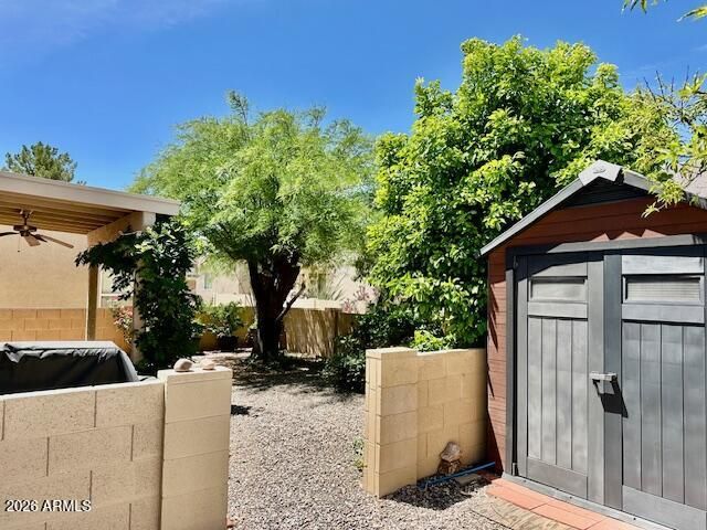 Light-filled and full of charm, this adorable 1-bedroom, 2-bath home with a 2-car garage offers comfort, convenience, and beautifully maintained surroundings. The inviting front yard features lush landscaping, while the backyard feels like your own private park, complete with fruit trees, vibrant rose bushes, and automated irrigation on timers for both front and back. Inside, you'll find a spacious family room and a perfectly sized dining area, ideal for everyday living or entertaining. The home includes an indoor washer and dryer, along with a convenient guest bathroom. The bright and versatile Arizona room offers abundant natural light and flexible space for hobbies, relaxation, or additional living use. A storage shed is included and perfectly suited for all your gardening tools and needs. The resort fee includes your property taxes, trash collection, the clubhouse, media room, many activities, heated pool & spa, lovely fitness center. There's also a natures walking trial, pickleball courts and large & small dog park. Love where you live!