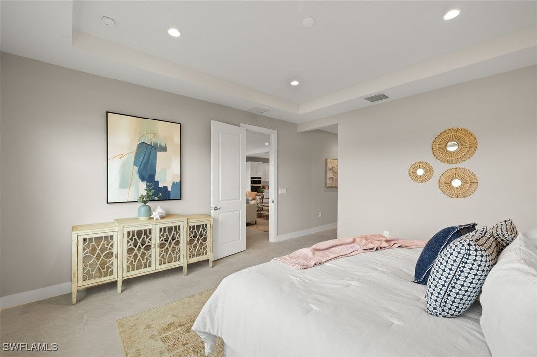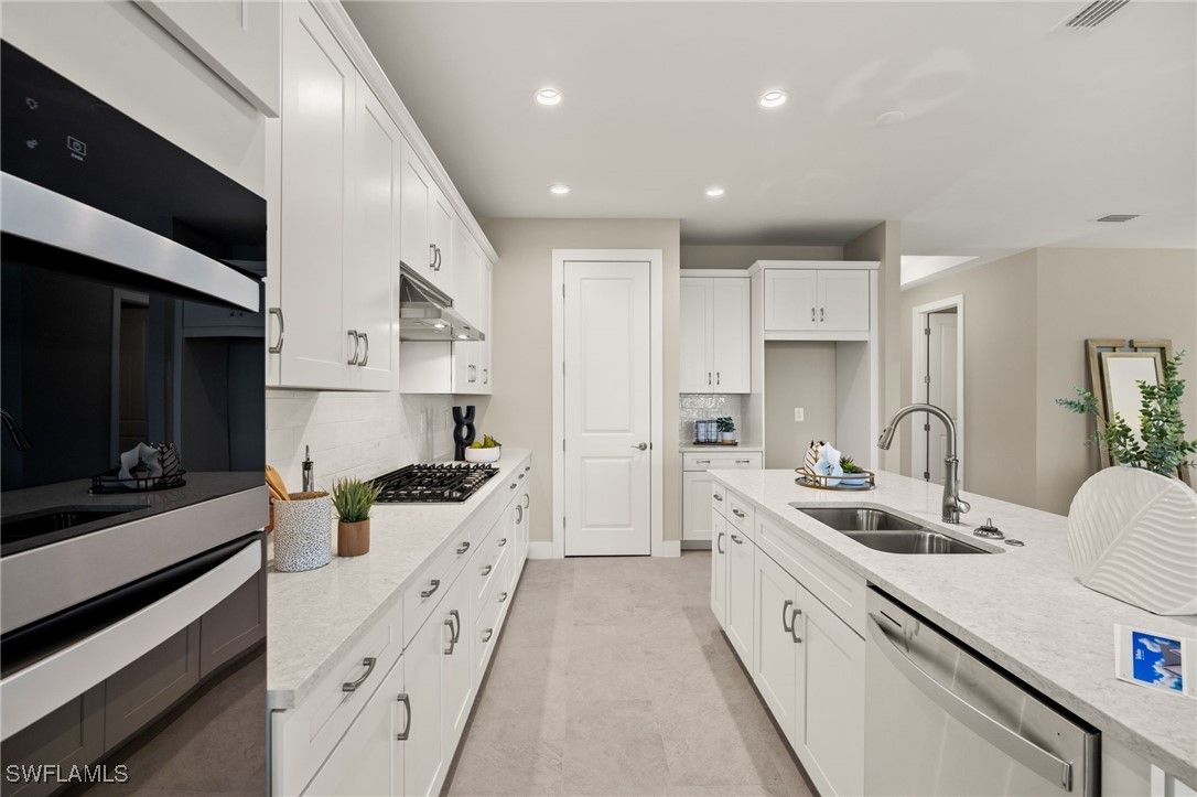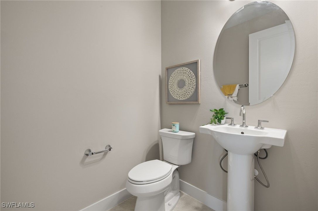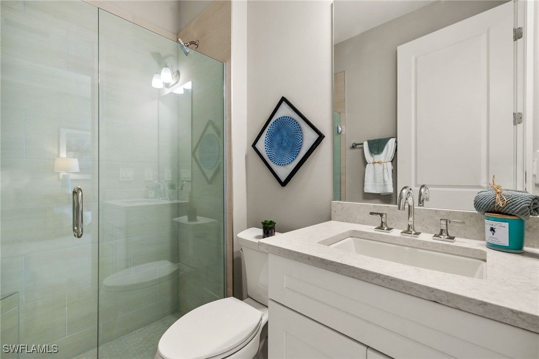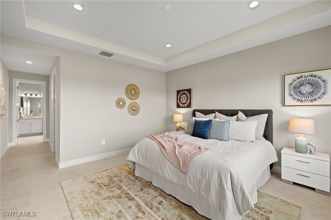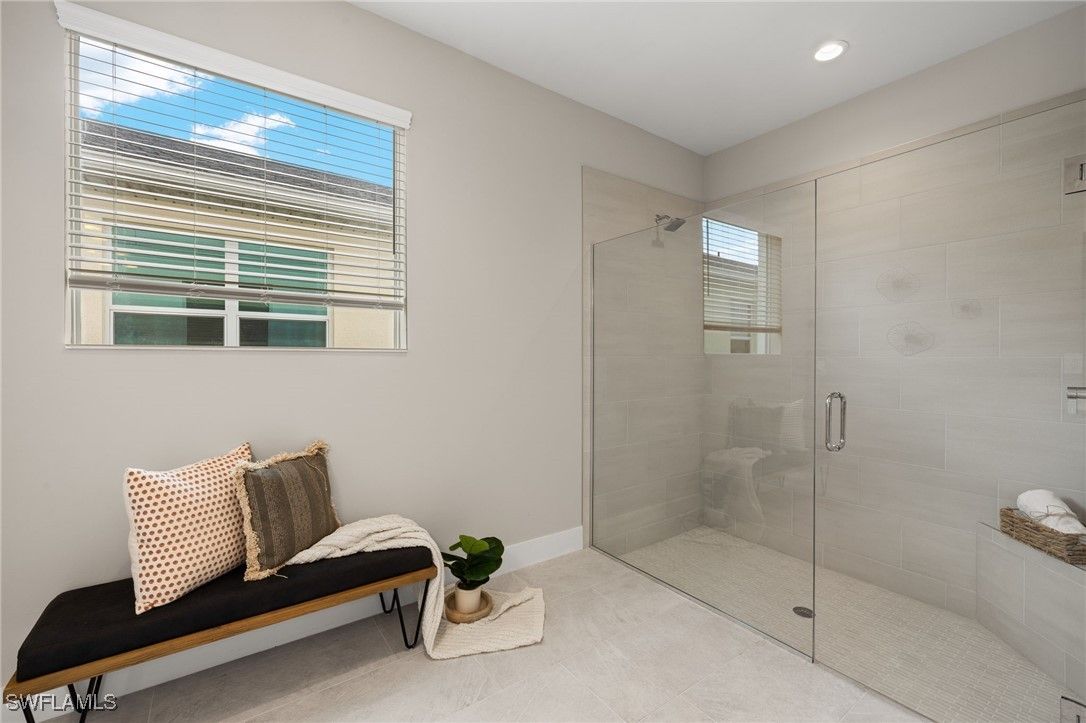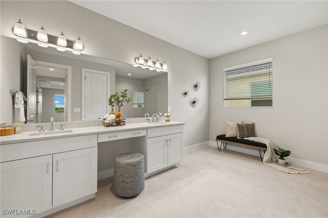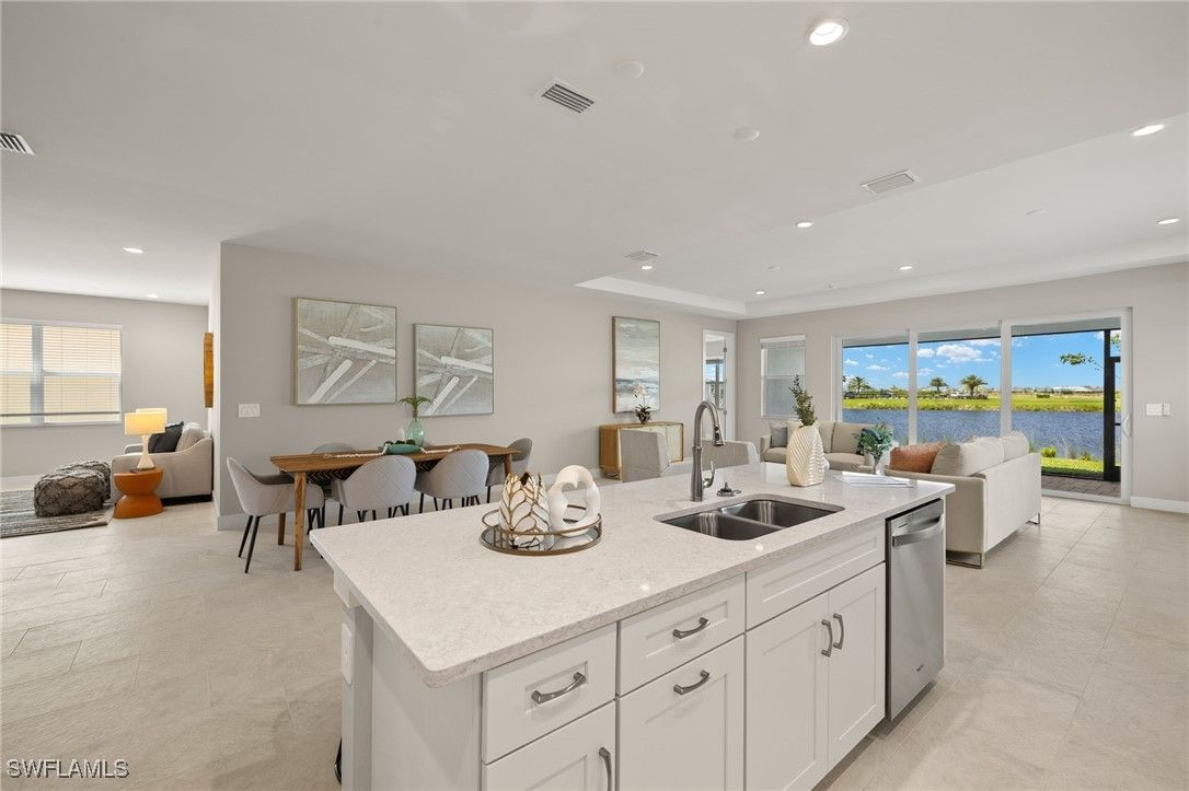 This breathtaking new construction waterfront home in Babcock Ranch, FL offers the perfect blend of luxury, comfort, and tranquility. Ideally situated with northern rear exposure, the property showcases long, peaceful water views that bathe the living spaces in soft, natural light throughout the day. From the moment you step inside, the home welcomes you with a spacious, open-concept layout and beautiful tile flooring that flows seamlessly throughout—offering a clean, modern look with no carpet in sight. At the heart of the home is the designer kitchen, which is both stylish and functional. It features gleaming quartz countertops, rich wood cabinetry, stainless steel appliances, an oversized center island with breakfast bar seating, and abundant storage space. Whether preparing everyday meals or entertaining guests, this space is perfectly equipped for both. The kitchen opens effortlessly to the casual dining area and expansive great room, all with sweeping views of the water that lend a resort-like ambiance to everyday living. Slide open the glass doors to access the large, screen-enclosed lanai—a private outdoor retreat overlooking the lake. Pre-plumbed for a future outdoor kitchen, this space is perfect for sunset dinners, quiet mornings with coffee, or weekend gatherings with family and friends. The luxurious primary suite offers a true sanctuary, complete with serene water views and a spa-inspired bathroom featuring quartz countertops, dual sinks with wood cabinetry, an oversized walk-in shower with dual showerheads, and elegant tile finishes throughout. Two additional bedrooms, connected by a beautifully appointed Jack and Jill bathroom, offer both privacy and comfort for guests or family members. This bath, like the primary, includes quartz countertops and coordinating wood cabinetry, providing a consistent sense of quality and style. A versatile flex room adds further appeal, easily serving as a home office, fitness space, media room, or anything your lifestyle demands. Additional highlights include impact-resistant windows and doors for added security and peace of mind, designer-curated finishes throughout, and a prime location within Babcock Ranch—the nation’s first solar-powered town. With resort-style amenities and easy access to nature trails, community events, pools, and local shopping and dining, this home is more than just a place to live—it’s a lifestyle. Don’t miss your chance to own this extraordinary waterfront retreat. Please see MLS supplements for interior design/floor plan layout.