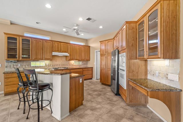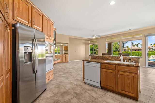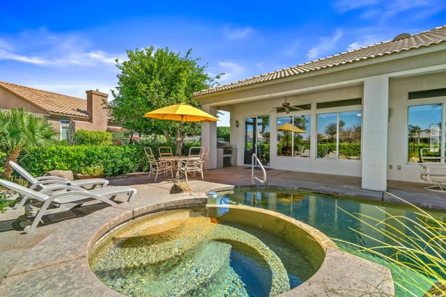 Fairway, Mountain views and a ''One of a Kind'' opportunity in Heritage Palms CC. This unique OPEN DESIGN floor plan is elevated above the 13th fairway, features 3 BEDROOMS, DEN & 2 1/2 BATHS plus a large private pool & spa. Featuring an open island kitchen design with lots of cabinetry, slab granite counters, optional glass block counter top window and Sola-tubes for natural lighting. The primary bedroom has a custom designed attached office/den area, dual vanites in the bathroom with separate soaking tub and shower. The guest suite also has its own private bathroom with walk-in shower while your day guests can utilize the convenient optional powder room that was added buy the original builder. The oversized rear yard with pool & spa is surrounded by a low hedge which provides for privacy while also allowing you to take in the beautiful fairway and desert mountain views. Additional upgrades include the optional 3rd bedroom, courtyard entry with leaded glass entry door, golf cart garage space, epoxy garage flooring, built-in BBQ & both A/C units were replaced in 2021. Heritage Palms is a premier adult community featuring an 18 hole championship golf course, pickleball & tennis courts, indoor & outdoor pools, fitness center, grill room, card room, billiards room, social clubs and more.