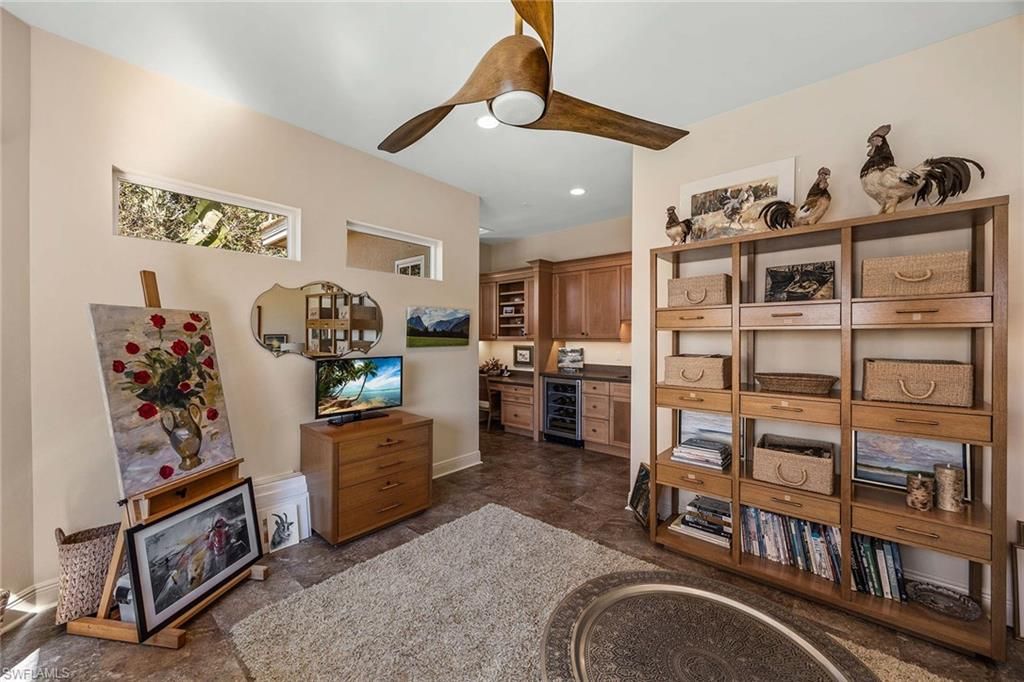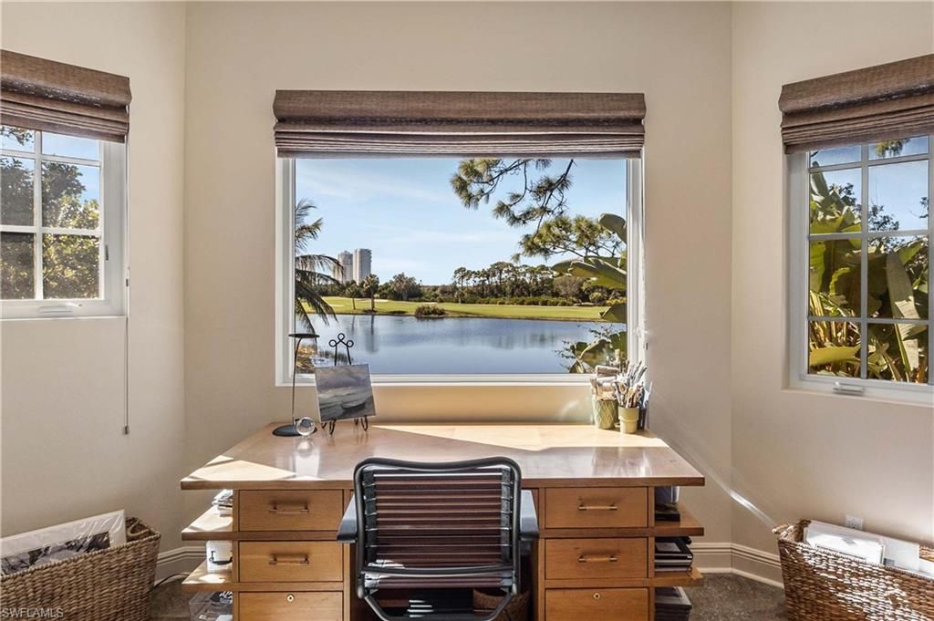 Welcome to 4441 Blue Sage Court in Pelican Landing, an incredible Old Florida-style residence offering timeless charm, thoughtful updates, and a breathtaking setting. This 4,031 sq. ft. single-family home features 3 bedrooms, 3.5 baths, a den/office, and an oversized 2.5-car garage, all perfectly positioned on a lushly landscaped .68-acre corner lot with sweeping views of the lake and golf course.Step onto the spacious front porch and into an inviting formal living and dining area, perfectly designed for entertaining. French doors lead seamlessly to the expansive pool and outdoor living space, blending indoor and outdoor enjoyment. The updated kitchen opens to a warm and welcoming family room with an eating area, creating a comfortable setting for everyday living, gathering, and relaxed conversation. A private first-floor home office/den features beautiful arched windows that fill the space with natural light.A standout feature is the 2014 second-floor addition, designed for both style and versatility. This space includes a bath, a bar area with wine refrigerator, a built-in desk, and a flexible bonus area—perfect for an additional office, den, or even guest space.Step outside to your private retreat where the spacious pool area captures stunning panoramic views of the sparkling lake, manicured golf course, and tropical surroundings—a true Florida paradise.As a resident of Pelican Landing, you’ll enjoy an unmatched lifestyle with resort-style amenities including a private island beach pavilion, sailing, a kayak park, tennis, pickleball, bocce, and an attended fitness center, with optional golf membership available for those who want the full country club experience.Classic charm, modern functionality, and an unforgettable view—this is Pelican Landing living at its finest.