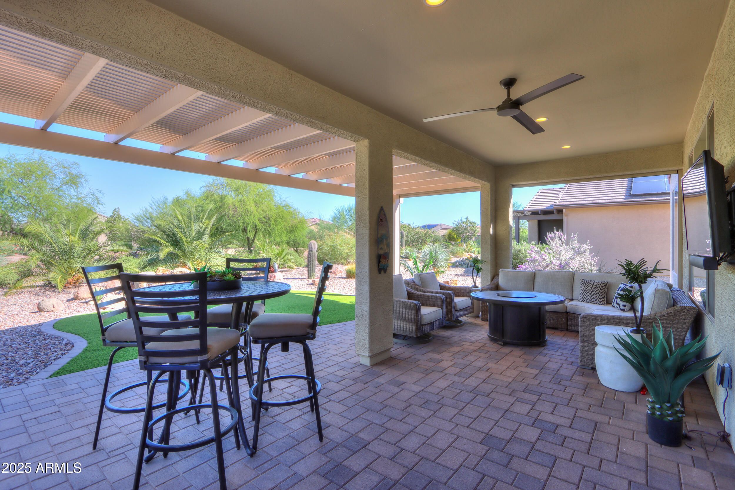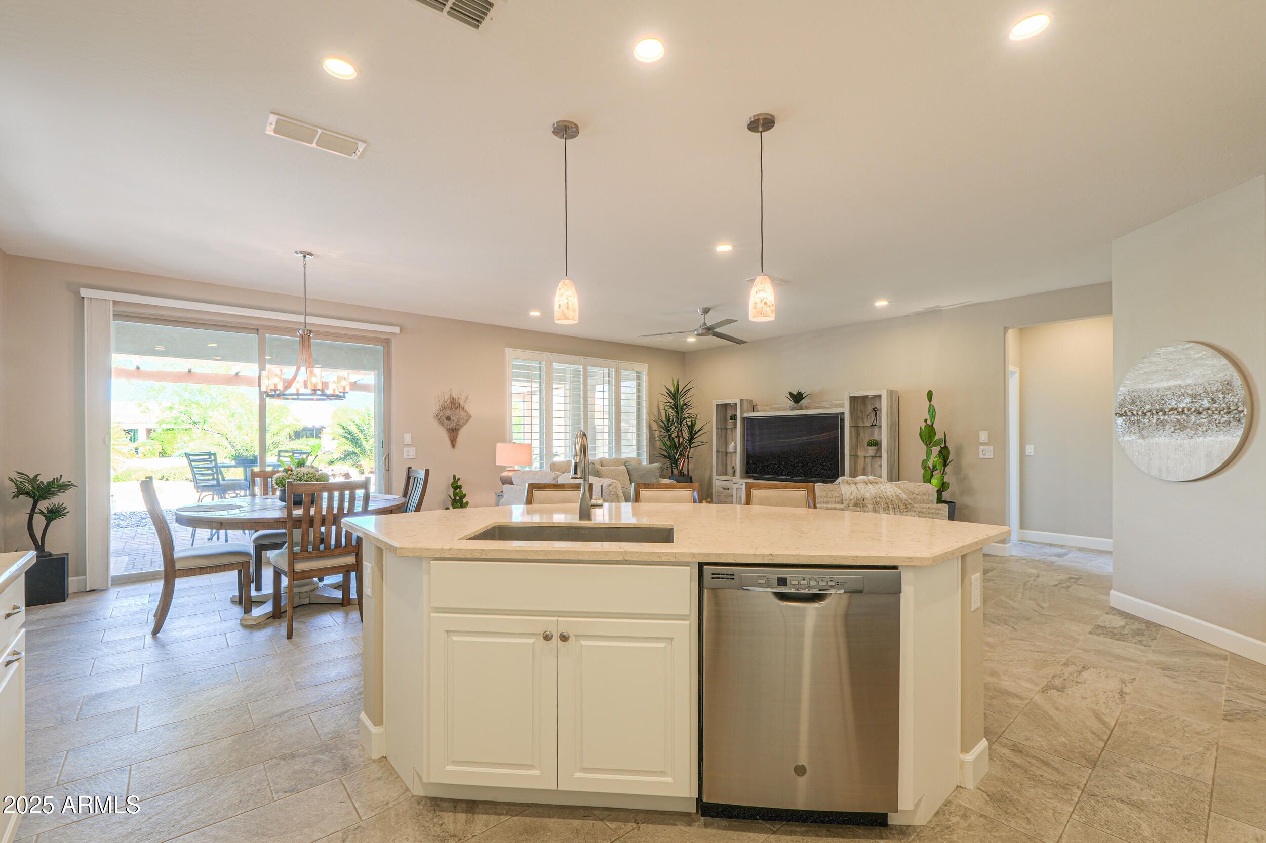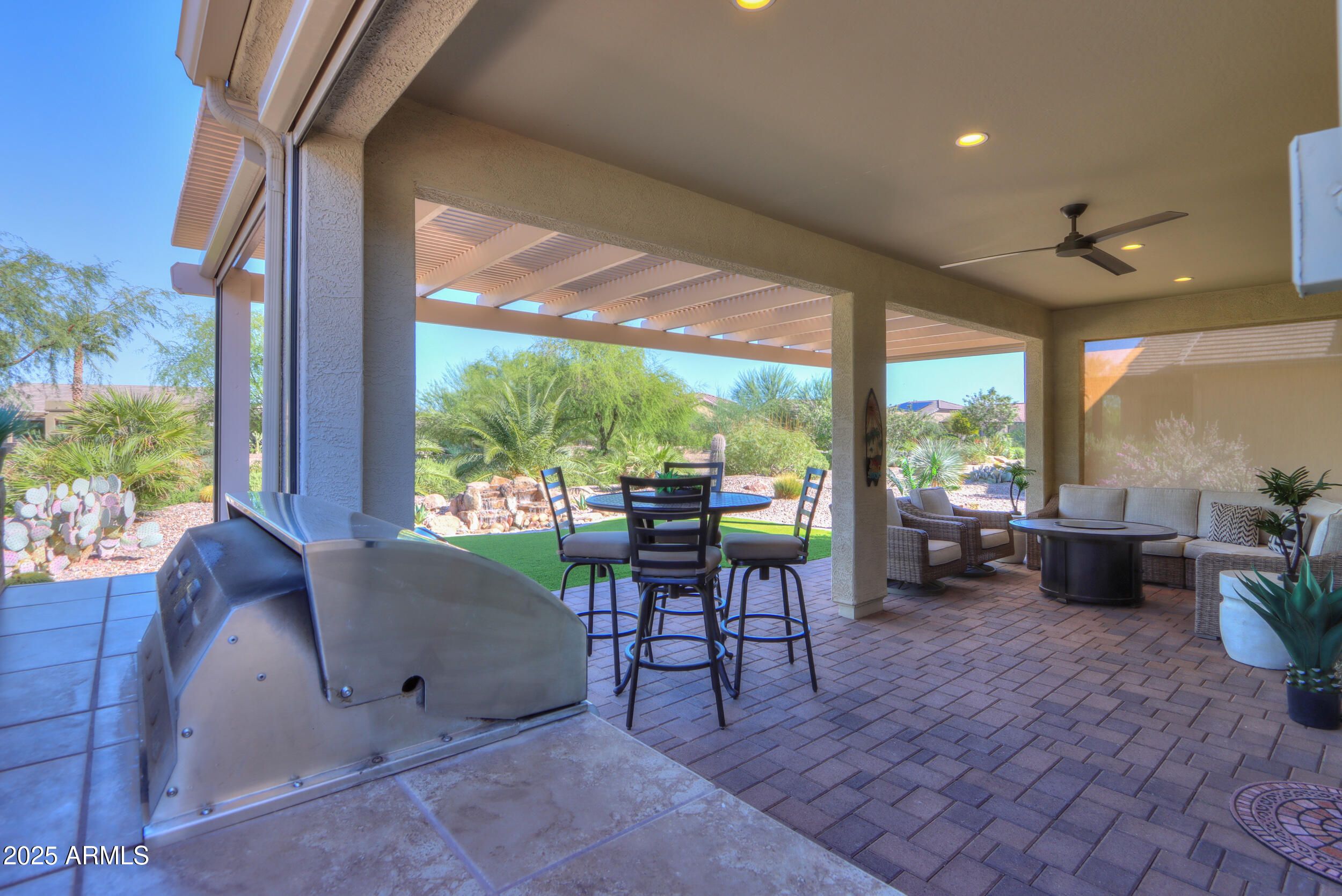 You will LOVE this MONTECITO model that is on a premium VIEW lot w/ N/S exposure! This is a 3-bedroom, 2 bath, 2 car garage home. Kitchen features arctic white cabinets w/pulls, SS appliances, gas range, quartz countertops, tile backsplash, trash bin, under cabinet & pendant lighting. Upgrades from the 12'' x 24'' Oyster gray tile, LED recessed lighting, fans & plantation shutters. Master bedroom features a walk-in tile shower w/bench. Guest bedroom is split from the master. Laundry room comes w/cabinets & hanging rod.The two-car garage has a whole house water filtration system. Step out back to the professionally landscaped backyard with extended paver patio w/electric remote shades, extended pergola, built in BBQ, soothing water feature, artificial grass, w/views & privacy. Look no more