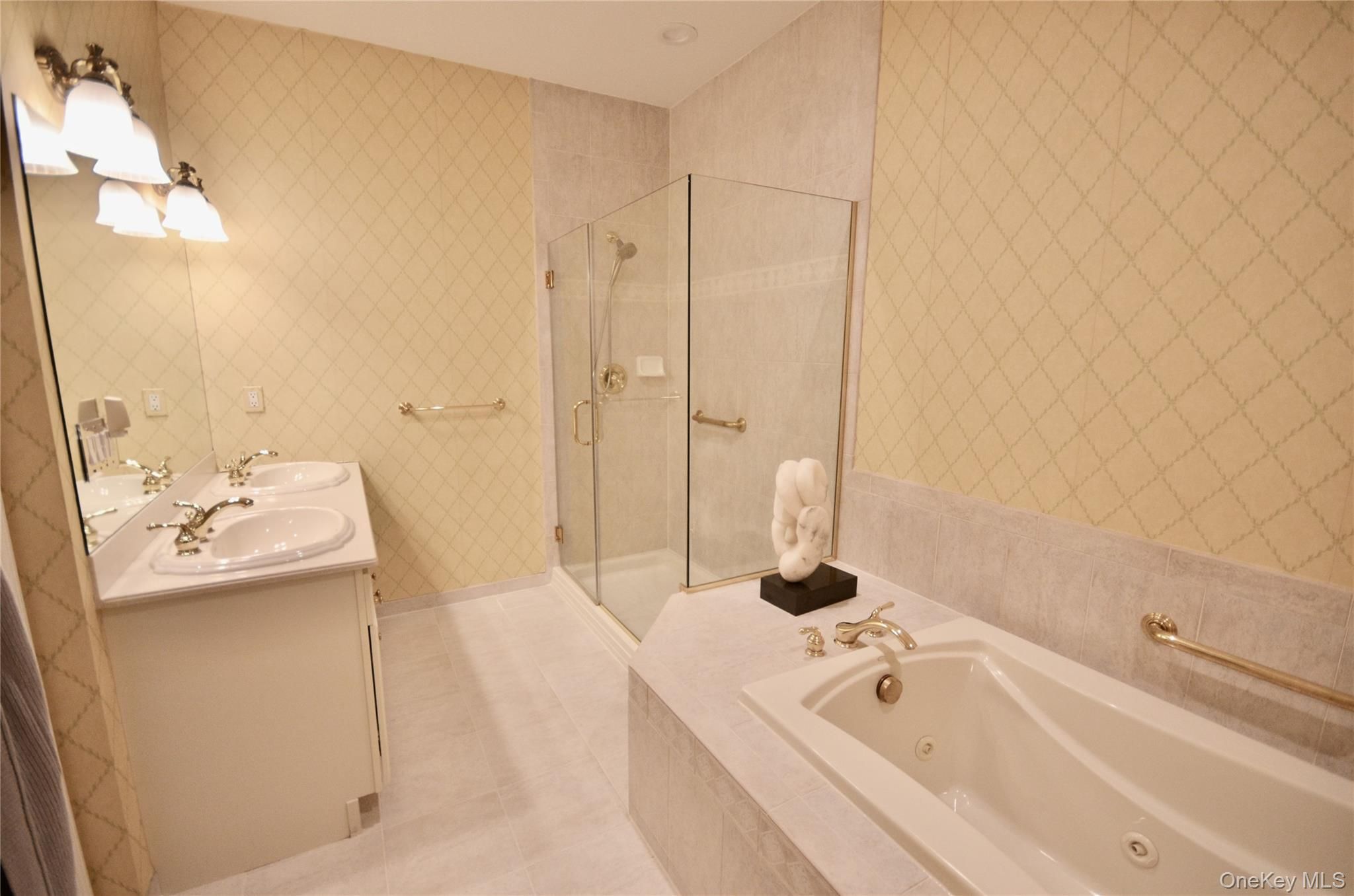 Beautifully maintained and updated 2-bedroom, 2.5-bath Medici model with main-level primary suite in The Greens at Half Hollow. Prime cul-de-sac location with convenient parking and private patio yard. Features include a dramatic two-story entry, vaulted living room with wood floors, and an eat-in kitchen with gas cooking, new microwave and stove/oven range, peninsula seating, updated countertops, stainless steel appliances, and an oversized pantry. The main-level primary suite offers two custom closets and a spa-like bath with soaking tub, shower, and double vanity, plus full-size washer/dryer. A powder room completes the first floor. The second level features a versatile loft with new plush carpet, a guest bedroom, and a full bath. Additional highlights include abundant natural light, brick patio, and an attached 1-car garage. Enjoy 24-hour security and resort-style amenities including indoor/outdoor pools, fitness center, spa, tennis, clubhouse with dining, card rooms, library, numerous activities, and optional golf membership.