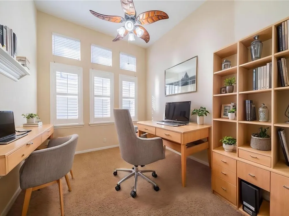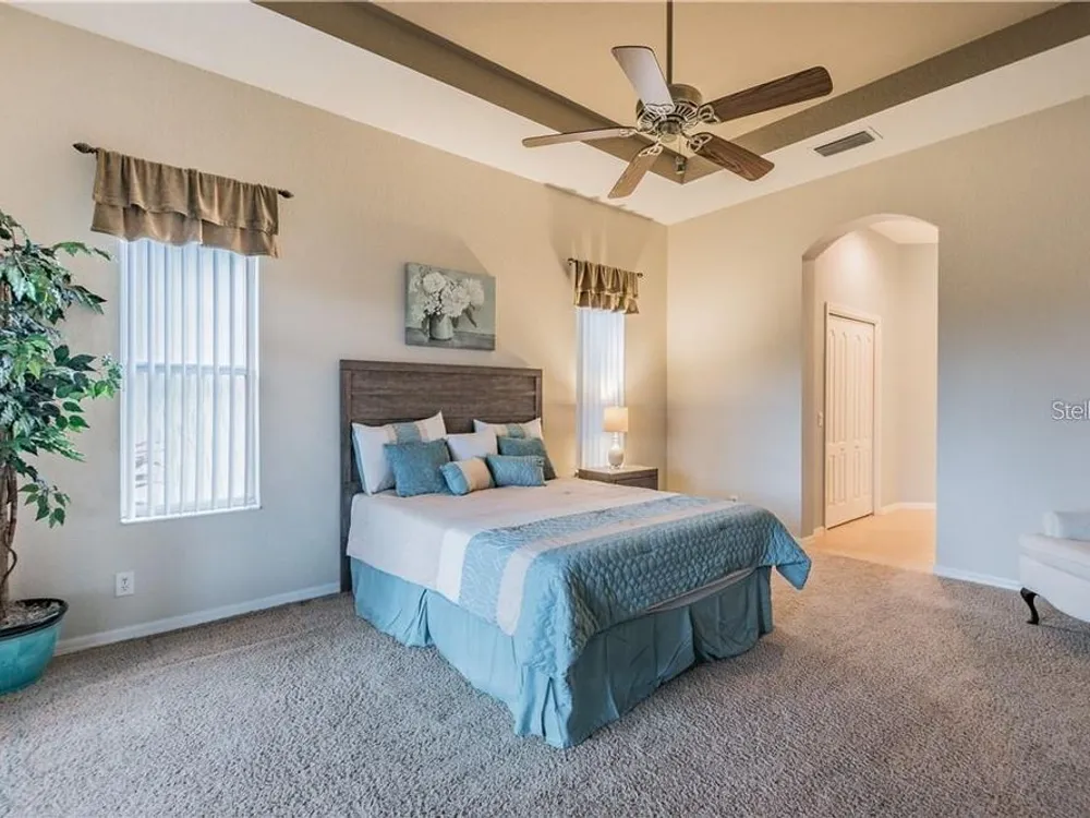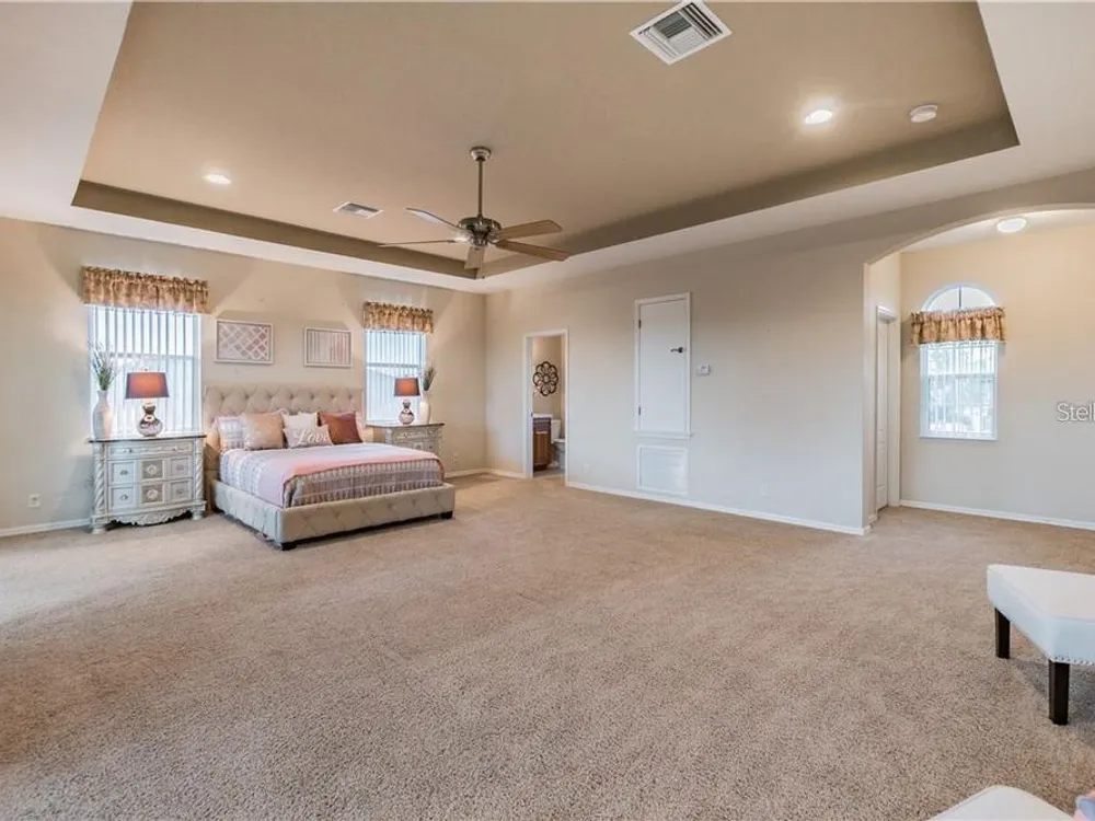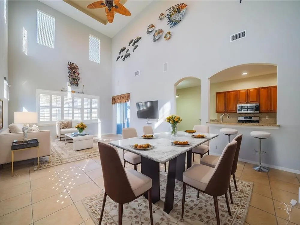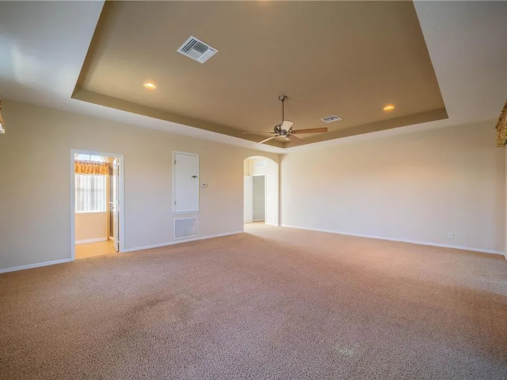 - Ceiling Fan(s), Coffered Ceiling(s), Eat-in Kitchen, High Ceilings, Living/Dining Room, Open Floorplan, Main Level Primary, Split Bedrooms, Stone Counters, Tray Ceiling(s), Walk-In Closet(s), Window Treatments