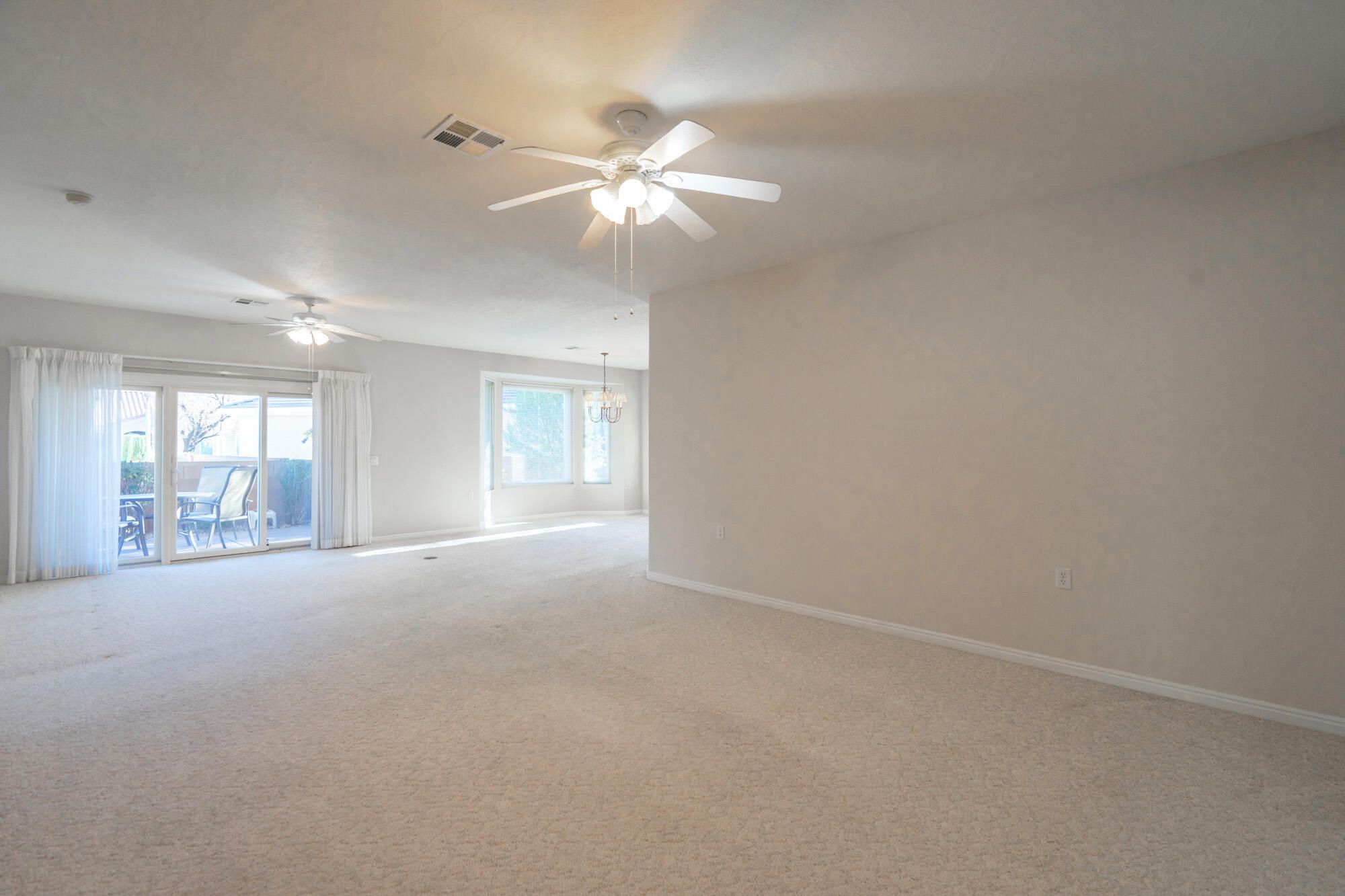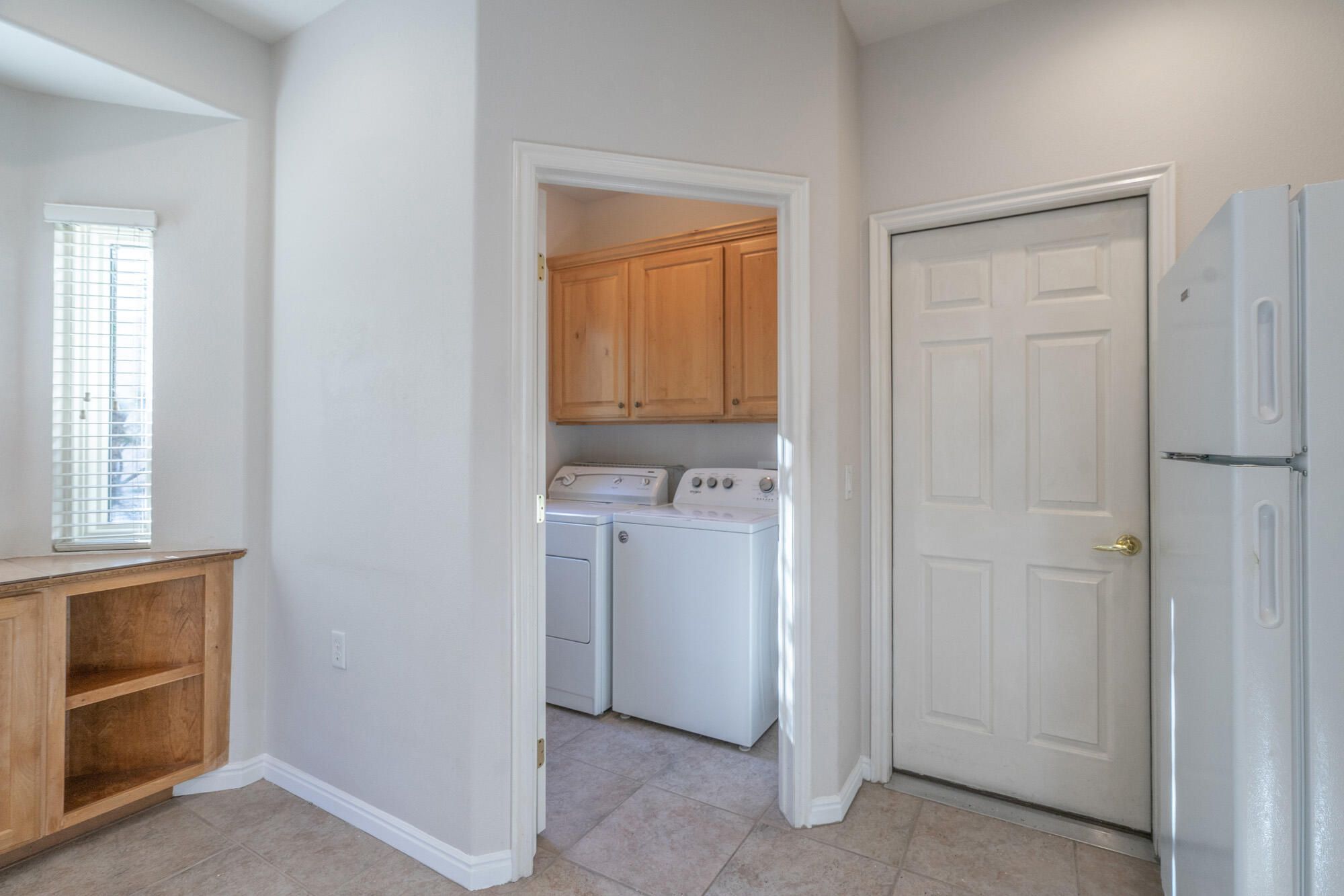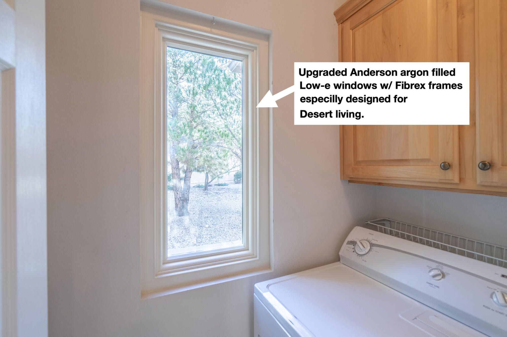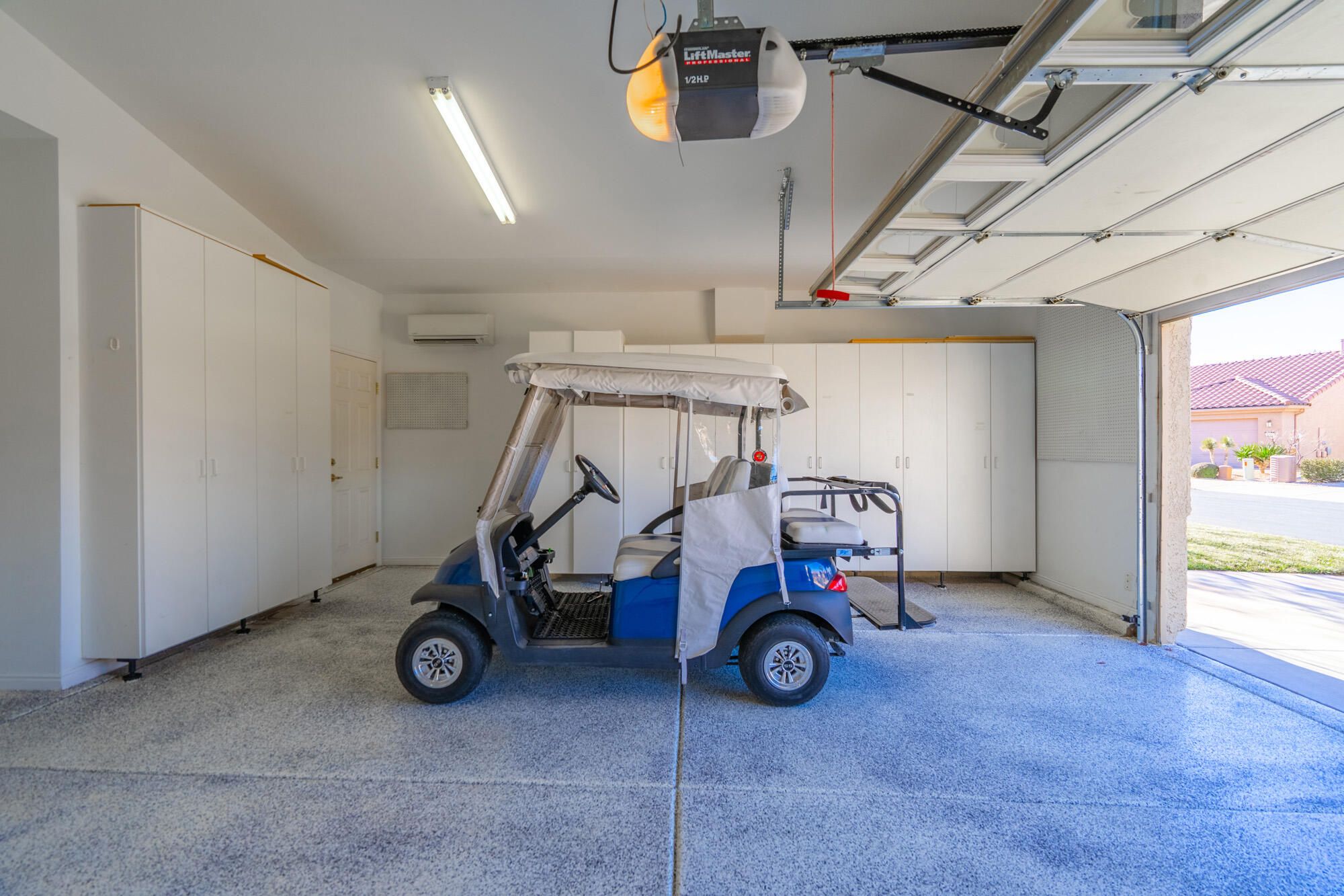 Expanded Cliffrose Model that makes living room, dining area and 2nd bedroom much larger. Custom made Anderson Fibrex low-e windows and sliding glass door, especially designed for desert living. Extra insulation in attic. 2 patios. HVAC and water heater approx 5 yrs old. Mini-split, epoxy floor and lots of storage in garage. Washer, dryer, fridge INCLUDED. Golf cart available separately.