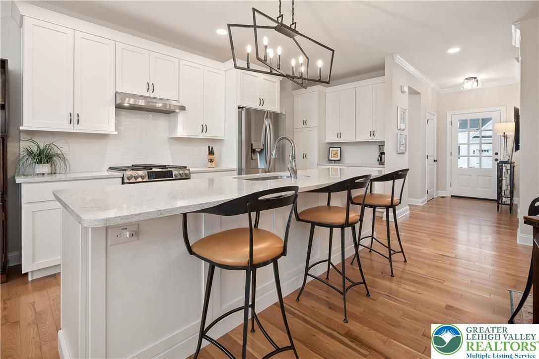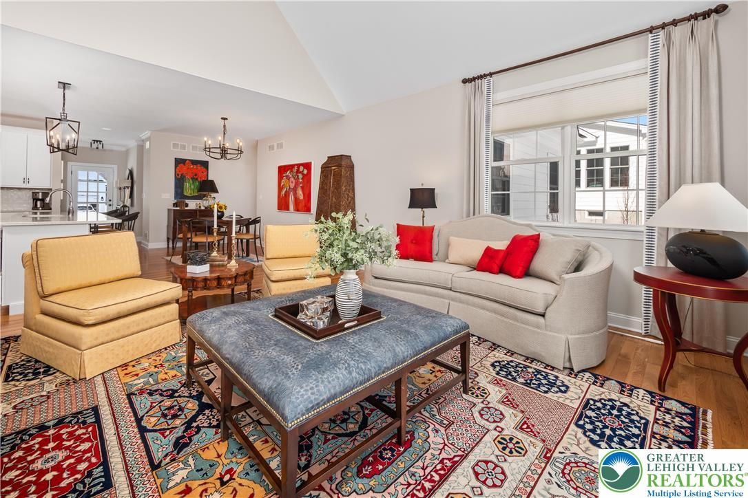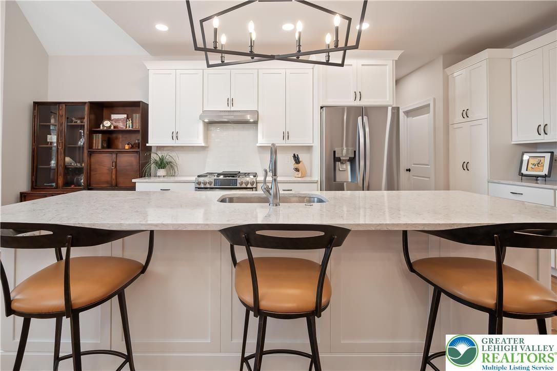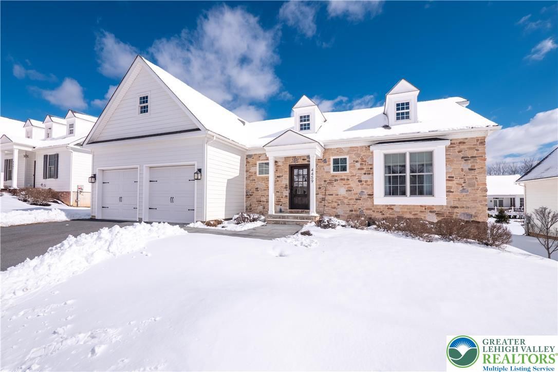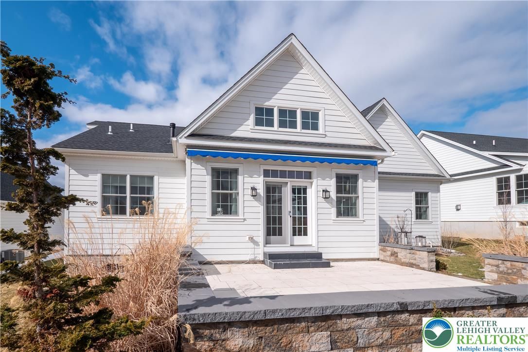 Discover the pinnacle of active adult living at THE COTTAGES AT OLD SAUCON, an exclusive gated community of just 80 homes. This stunning RANCH-STYLE residence sits perfectly in the COMPLETED PHASE 1. Featuring a timeless stone facade combined with JAMES HARDIE SIDING, this home offers a rare combination of luxury and location directly across from the prestigious Saucon Valley Country Club. Inside this meticulously maintained 3-bedroom, 2.5-bathroom home, every detail has been elevated with premium upgrades. The heart of the home is a GOURMET KITCHEN boasting elegant QUARTZ COUNTERTOPS, a large island, and high-end cabinetry. The living space flows into an EXPANDED GREAT ROOM bump-out with VAULTED CEILINGS, designed to maximize comfort and natural light. The primary suite serves as a true sanctuary, featuring a SPA-INSPIRED BATH and generous closet space. Beyond the interior, the community’s social fabric is woven with scenic walking trails and manicured common areas that foster a quiet charm. Step outside to your private oasis featuring a PREMIUM PATIO protected by a RETRACTABLE AWNING, perfect for sunset views. The 2-car garage is equally impressive with professionally finished EPOXY FLOORS. Enjoy a true maintenance-free lifestyle with a low $395/month HOA fee that covers lawn care, landscaping, and snow removal, trash & recycling. With easy access to local fine dining and upscale retail, this home is a RARE FIND in Saucon Valley’s most sought-after 55+ neighborhood.